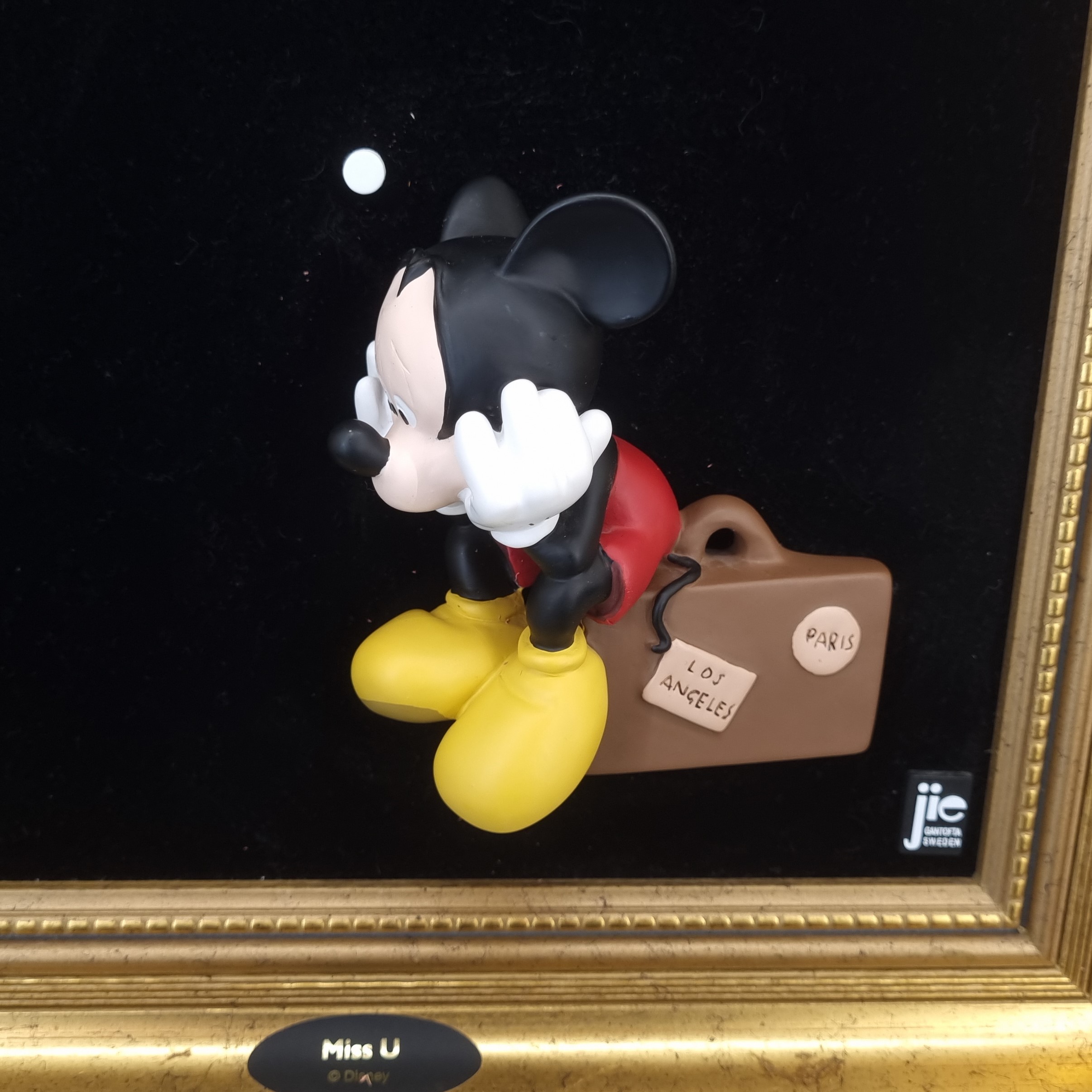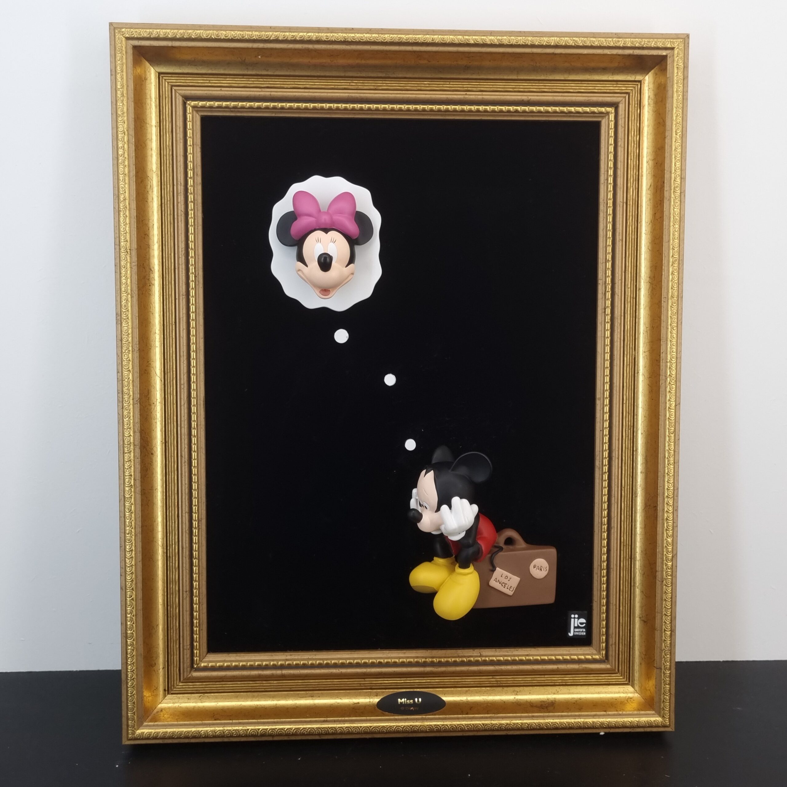This three-dimensional wall art, featuring the beloved characters Mickey and Minnie Mouse, is a collectible from Jie Art under license from Walt Disney. Crafted from high-quality resin, it sits against a black cloth background. Additionally, a wooden frame encases it. Joakim Lindstrup designed this piece in the late 1980s to early 1990s. Consequently, this vintage Walt Disney collectible remains in excellent condition. The piece showcases a stunning 3D depiction of Mickey Mouse who misses Minnie Mouse. Furthermore, a gold-painted frame enhances its overall appeal.