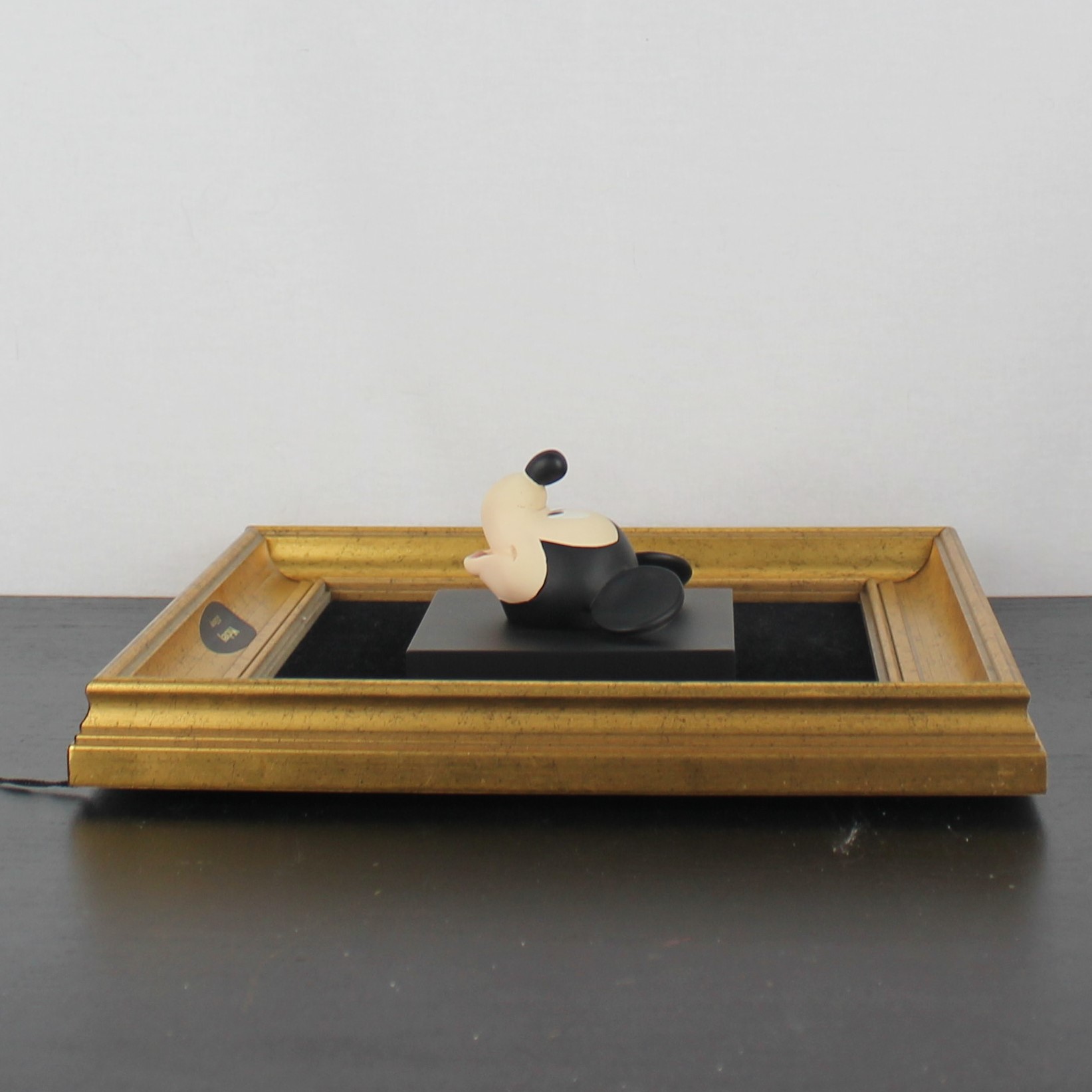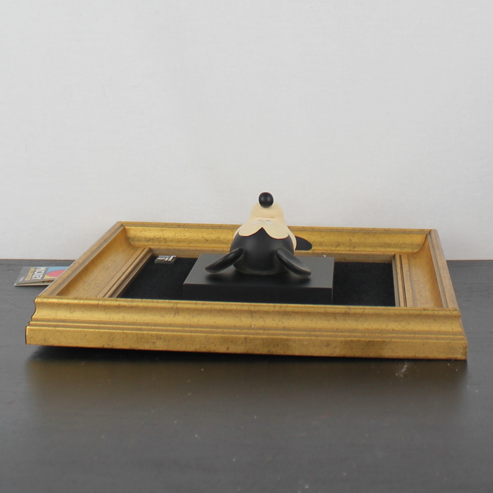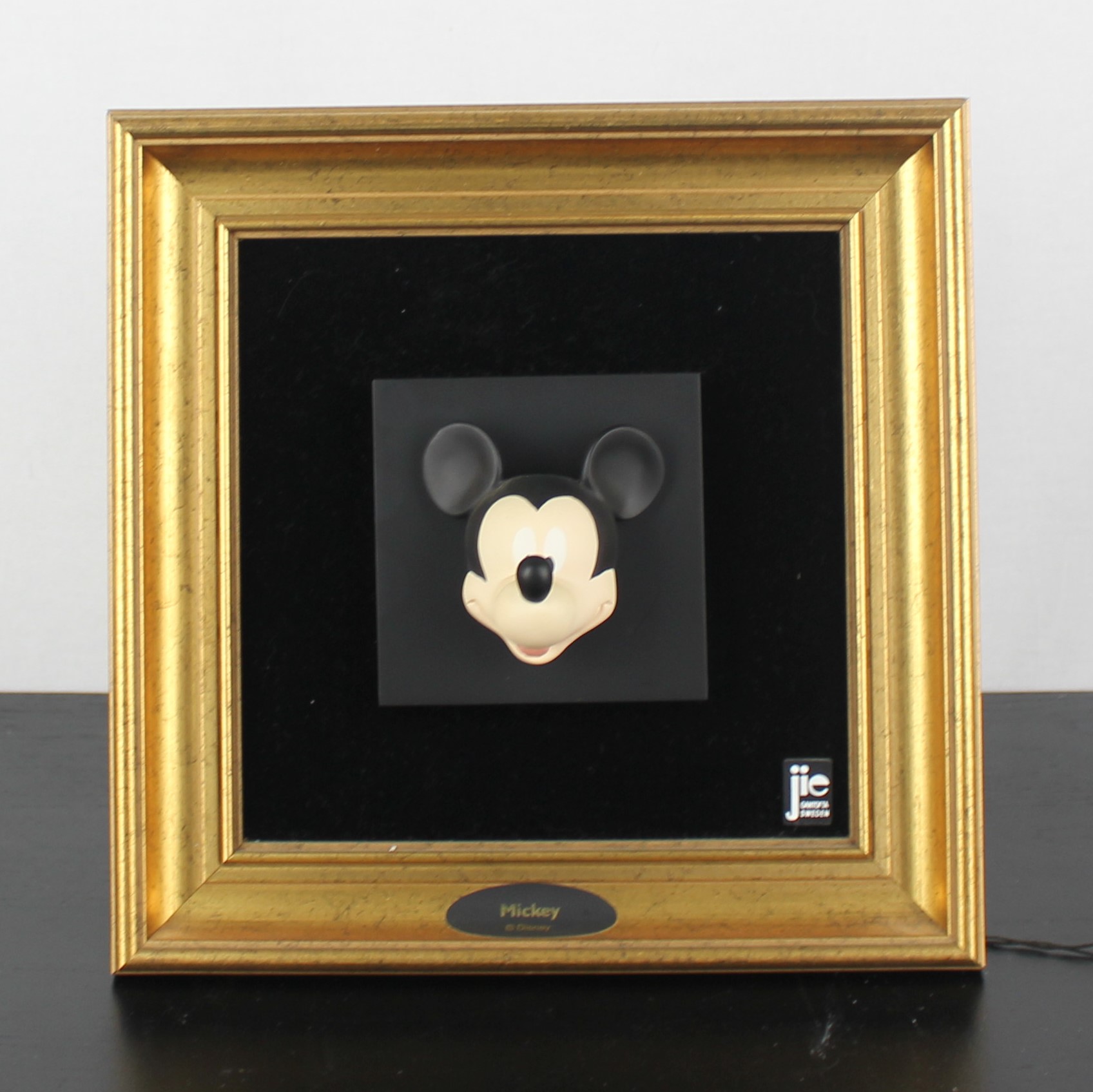 This three-dimensional wall art, featuring the beloved character Mickey Mouse’s face, is a collectible from Jie Art under license from Walt Disney. Crafted from high-quality resin, it sits against a black cloth background. Additionally, a wooden frame encases it. Joakim Lindstrup designed this piece in the late 1980s to early 1990s. Consequently, this vintage Walt Disney collectible remains in excellent condition. The piece showcases a vibrant 3D depiction of Mickey Mouse’s face. Furthermore, a gold-painted frame enhances its overall appeal. Complete the set with Mickey Mouse’s hands, pants and shoes.