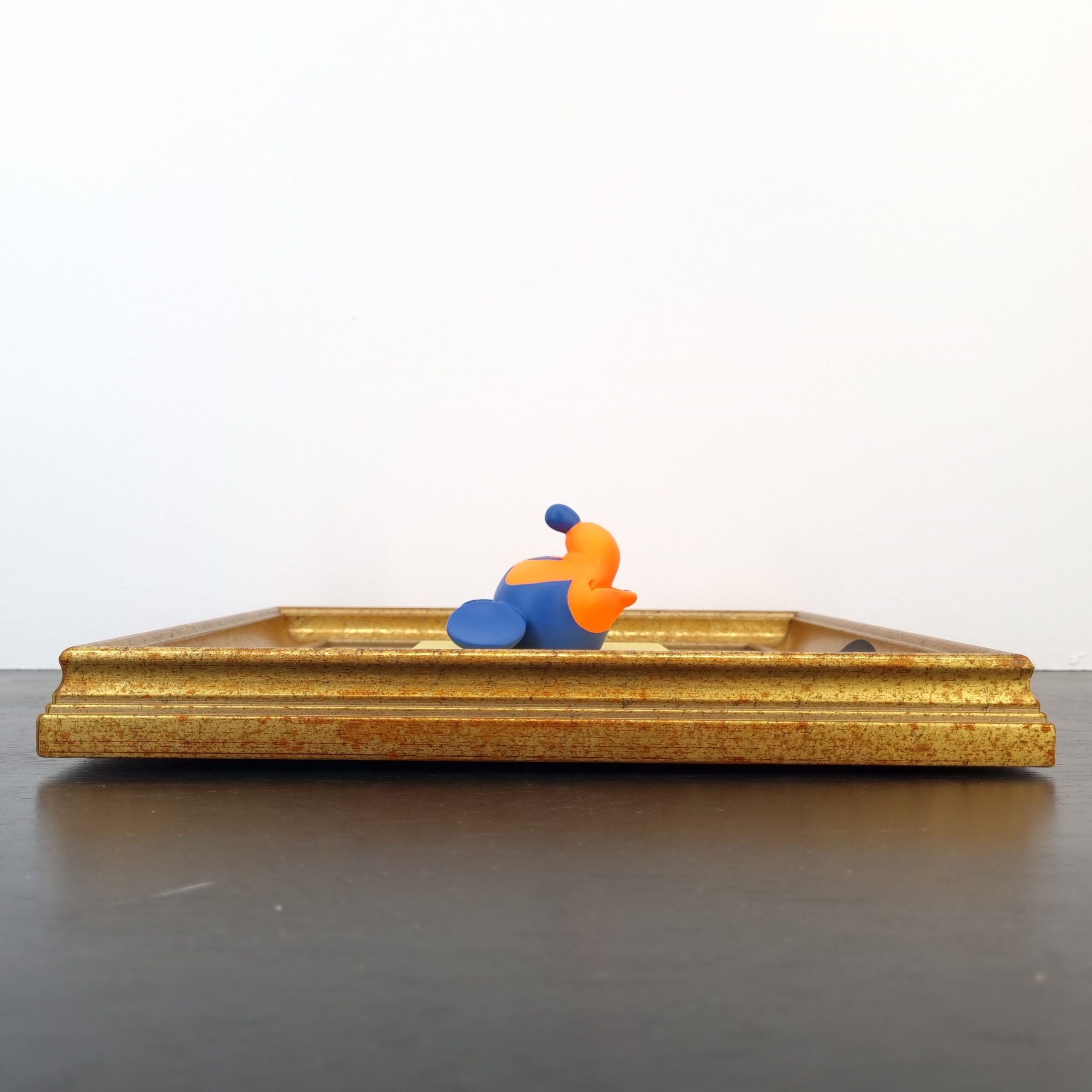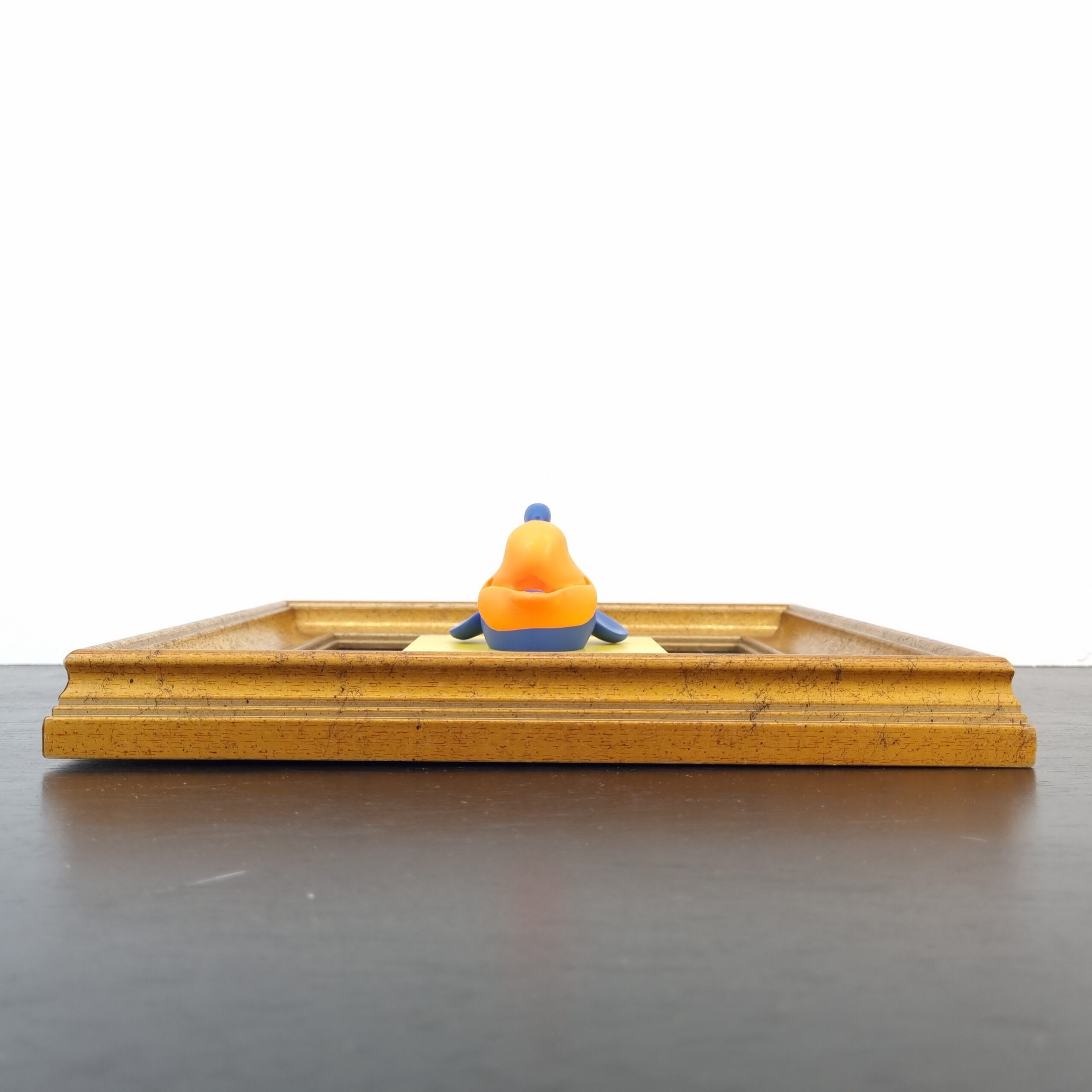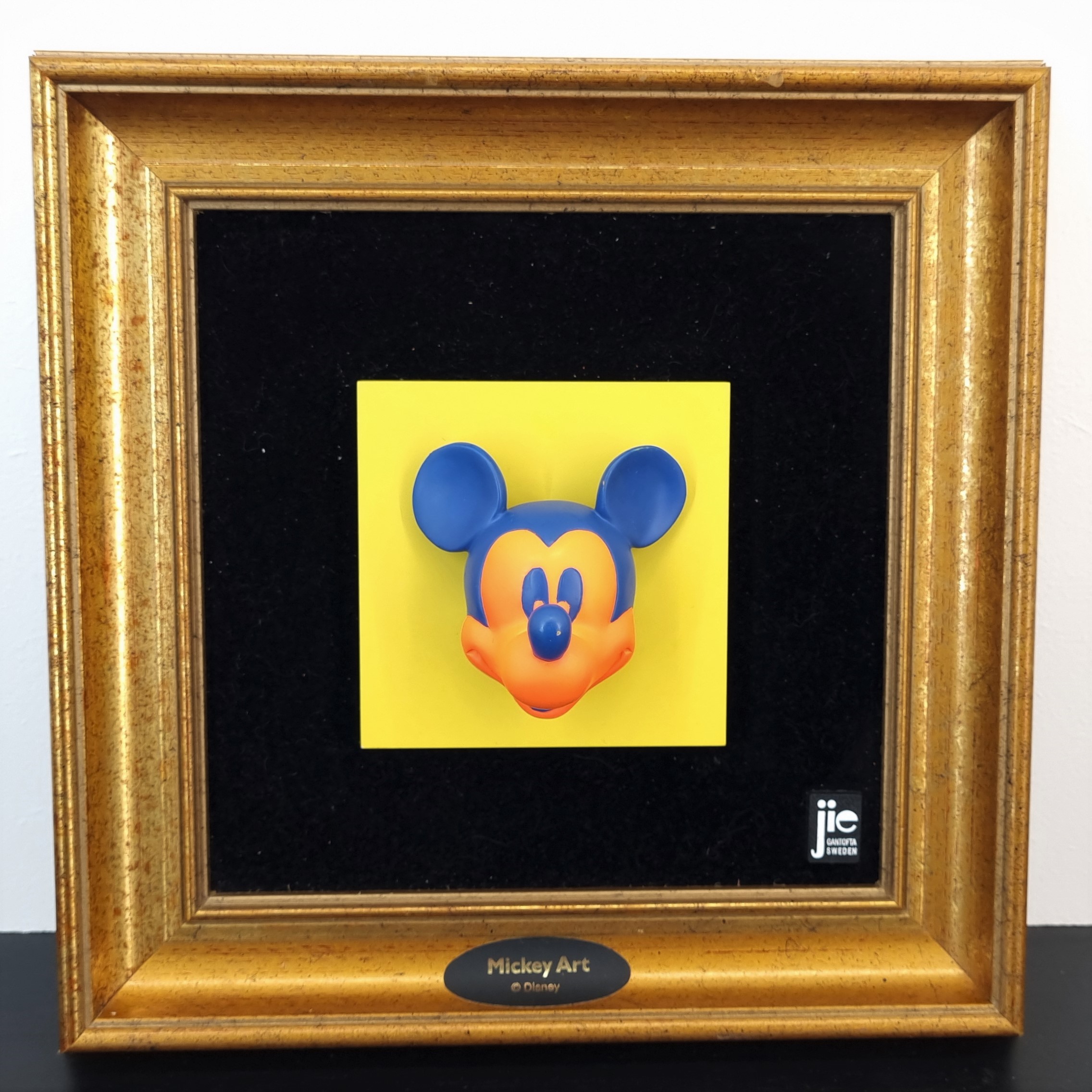 This three-dimensional wall art, featuring the beloved character Mickey Mouse’s face, is a collectible from Jie Art under license from Walt Disney. Crafted from high-quality resin, it sits against a black cloth background. Additionally, a wooden frame encases it. Joakim Lindstrup designed this piece in the late 1980s to early 1990s. Consequently, this vintage Walt Disney collectible remains in excellent condition. Shows some wear. The piece showcases a vibrant 3D depiction of Mickey Mouse’s face, featuring a dynamic blend of orange, blue, and yellow. Furthermore, a gold-painted frame enhances its overall appeal.