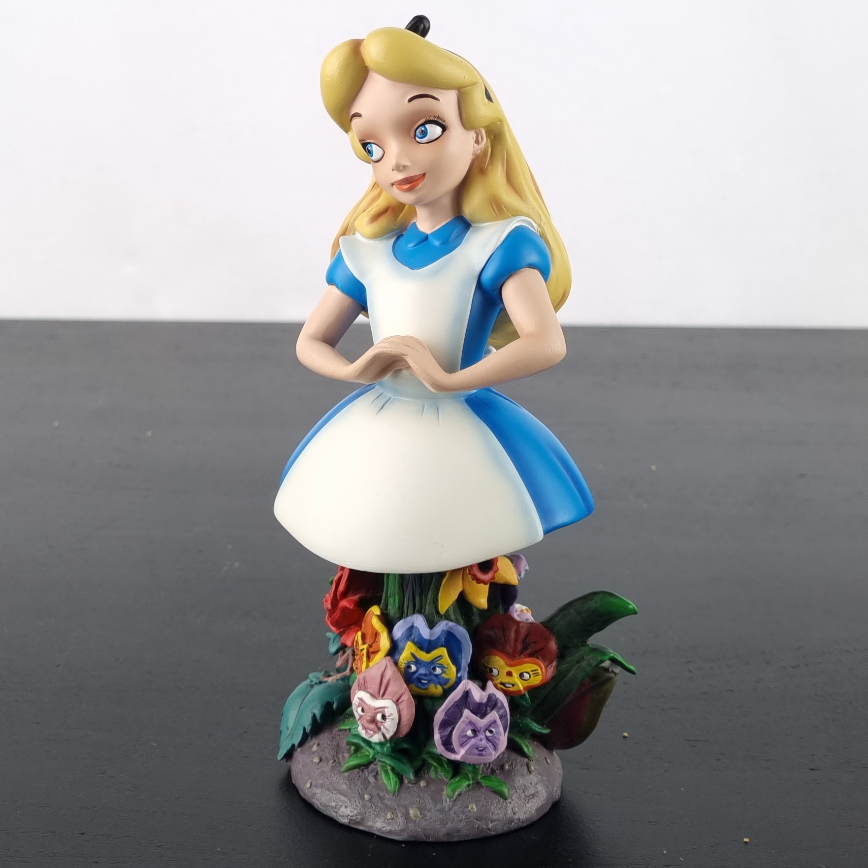 This unique bust from Alice of Alice in Wonderland was sculpted by Patrick Romandy-Simmons and designed by Jacqueline Perrault Gonzales under Walt Disney’s license. It was taken in production by Enesco for their Grand Jester collection. Dates back to 2012. Made from durable resin, it remains in excellent condition. Enhance your collection with this captivating bust of Alice from Alice in Wonderland! This enchanting piece features Alice with a base adorned with beautiful flowers, capturing the whimsical and dreamlike essence of Wonderland. With intricate details and vibrant colors, this bust brings Alice’s adventurous spirit to life. A must-have for Disney fans, it adds a touch of magic and elegance to any display.