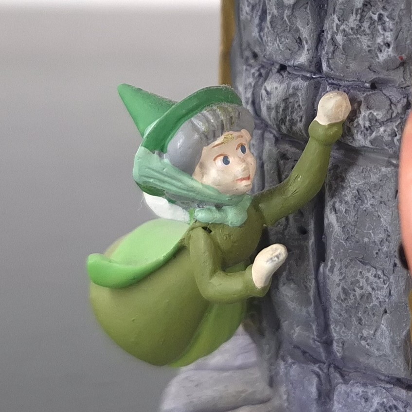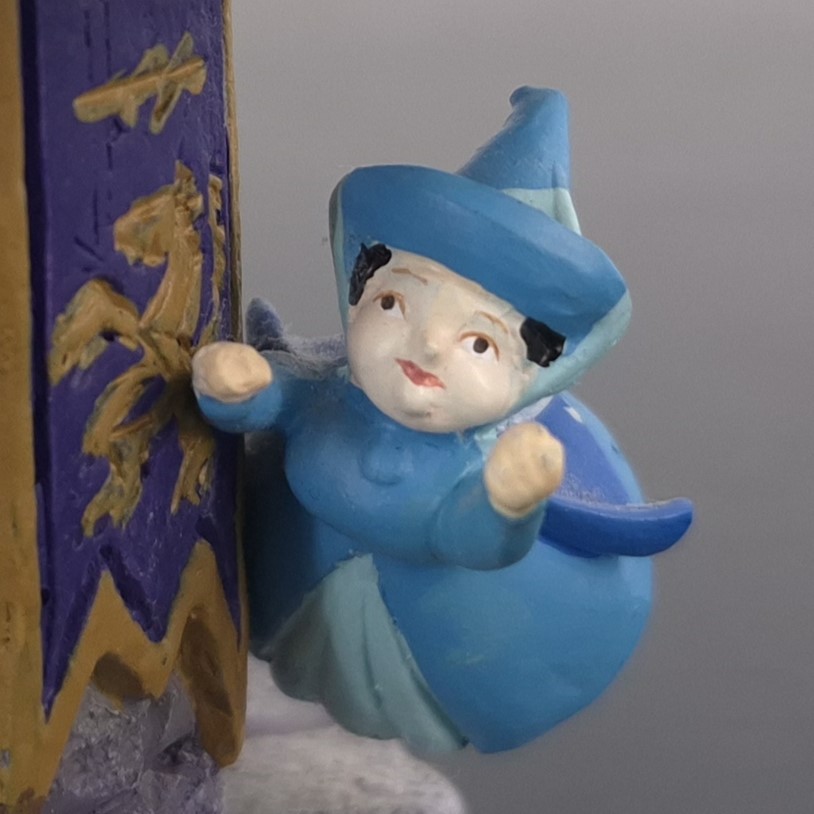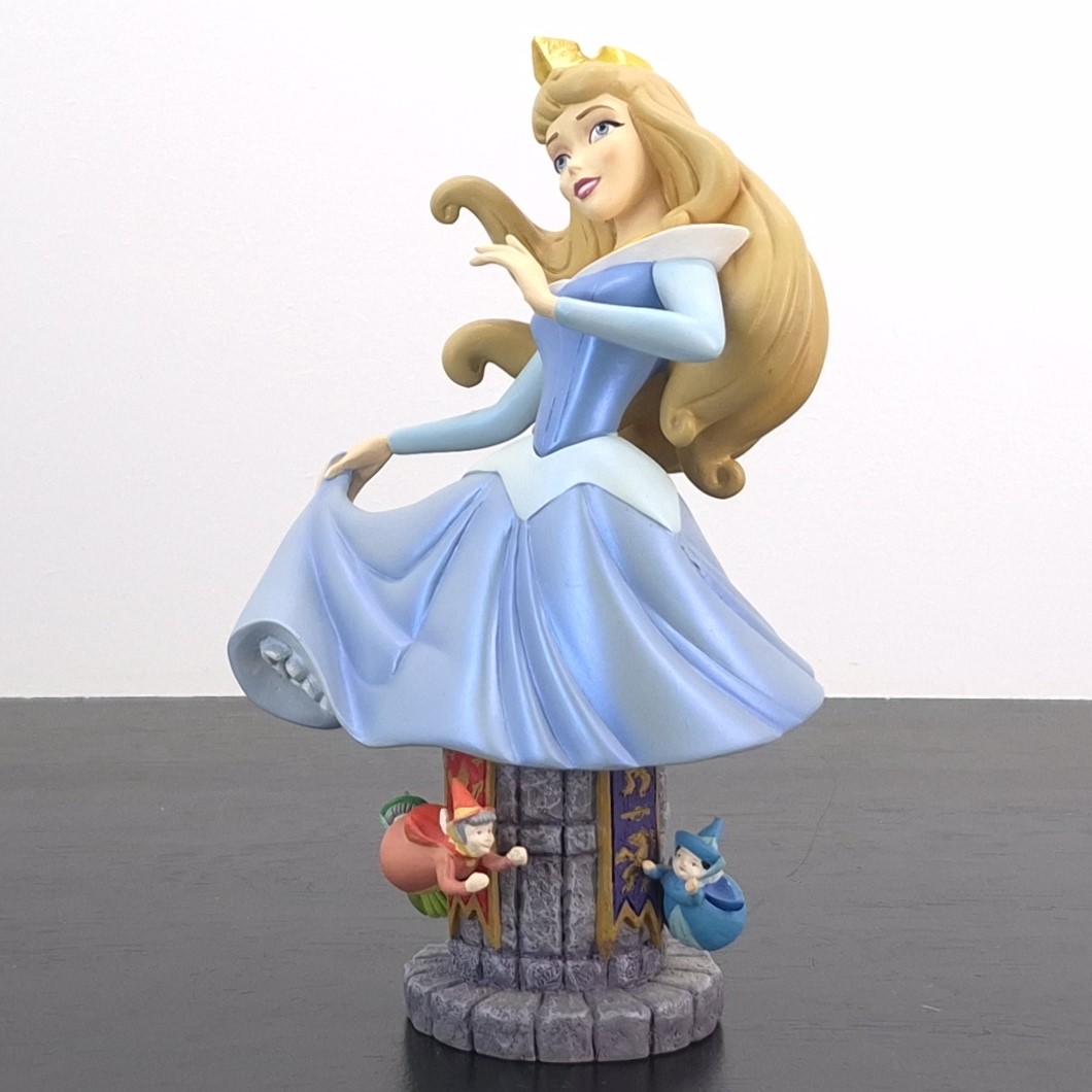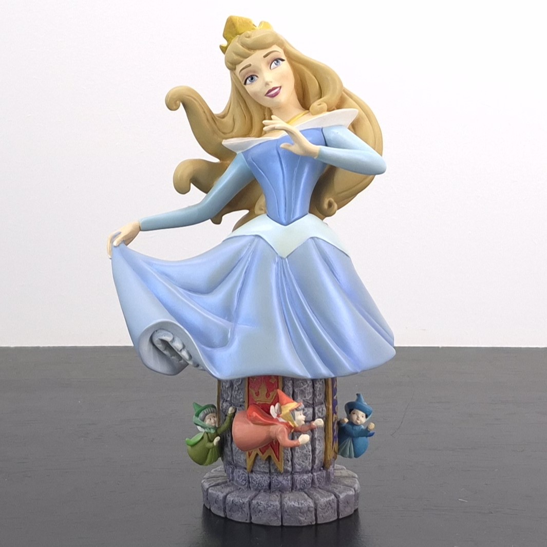This unique bust from Aurora was produced under Walt Disney’s license. It was taken in production by Enesco for their Grand Jester collection. Dates back to 2015. Made from durable resin, it remains in excellent condition. Elevate your collection with the Grand Jester Bust of Aurora! Aurora sits gracefully atop a stone tower in her elegant blue dress, exuding timeless beauty. Below her, the three fairies—Flora, Fauna, and Merryweather—dance and glide around the tower, adding motion and magic to the piece. A captivating centerpiece for Disney fans and collectors alike!