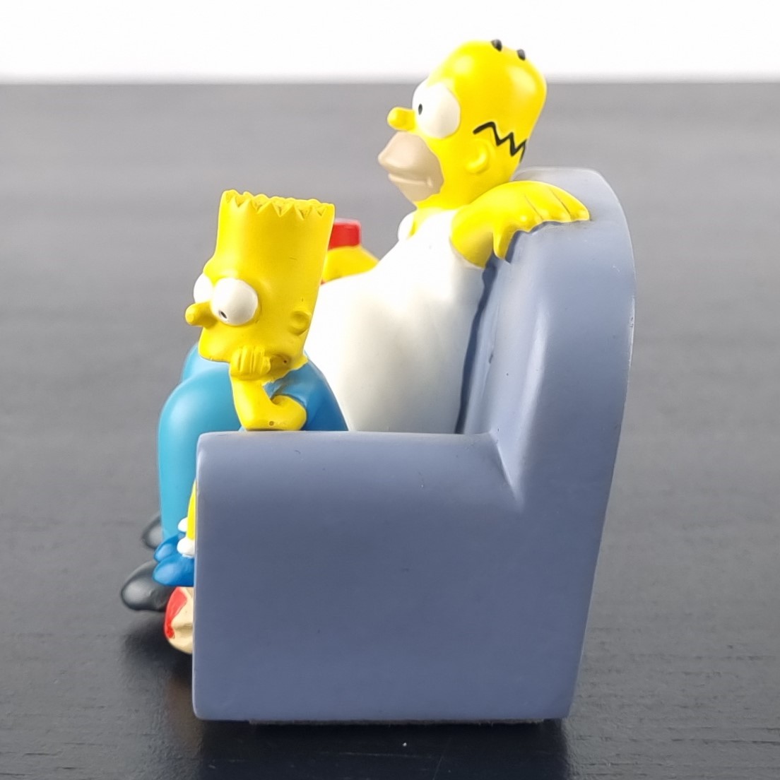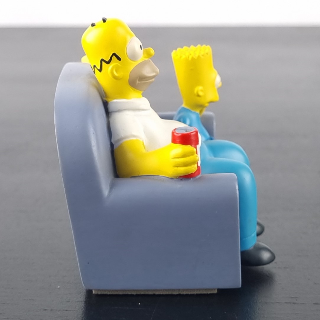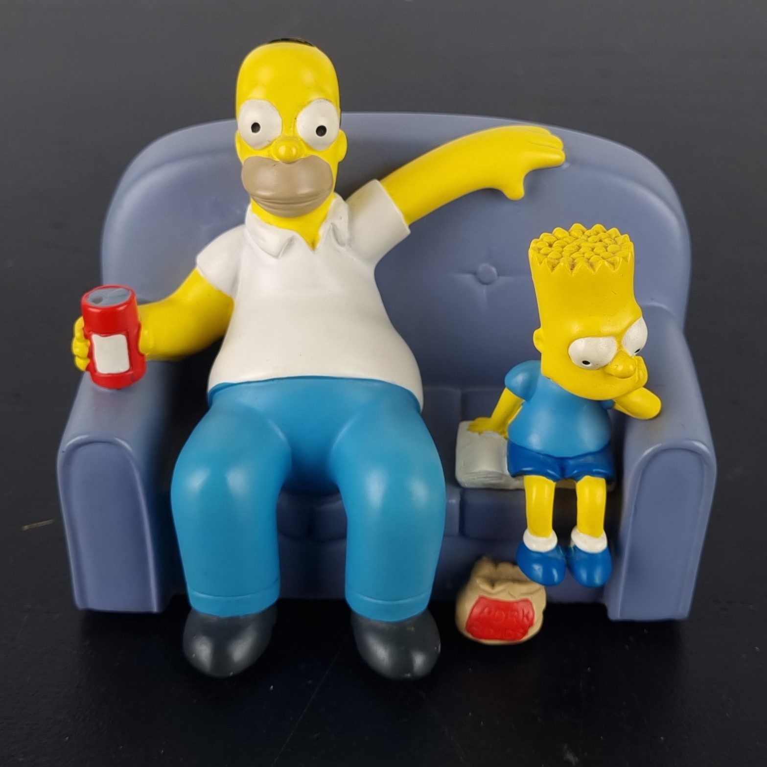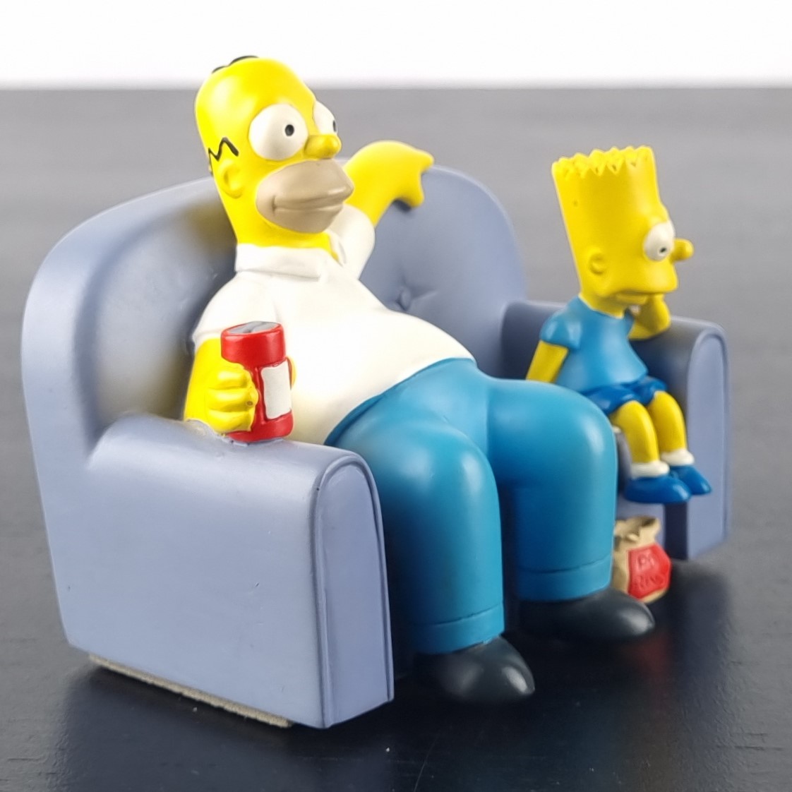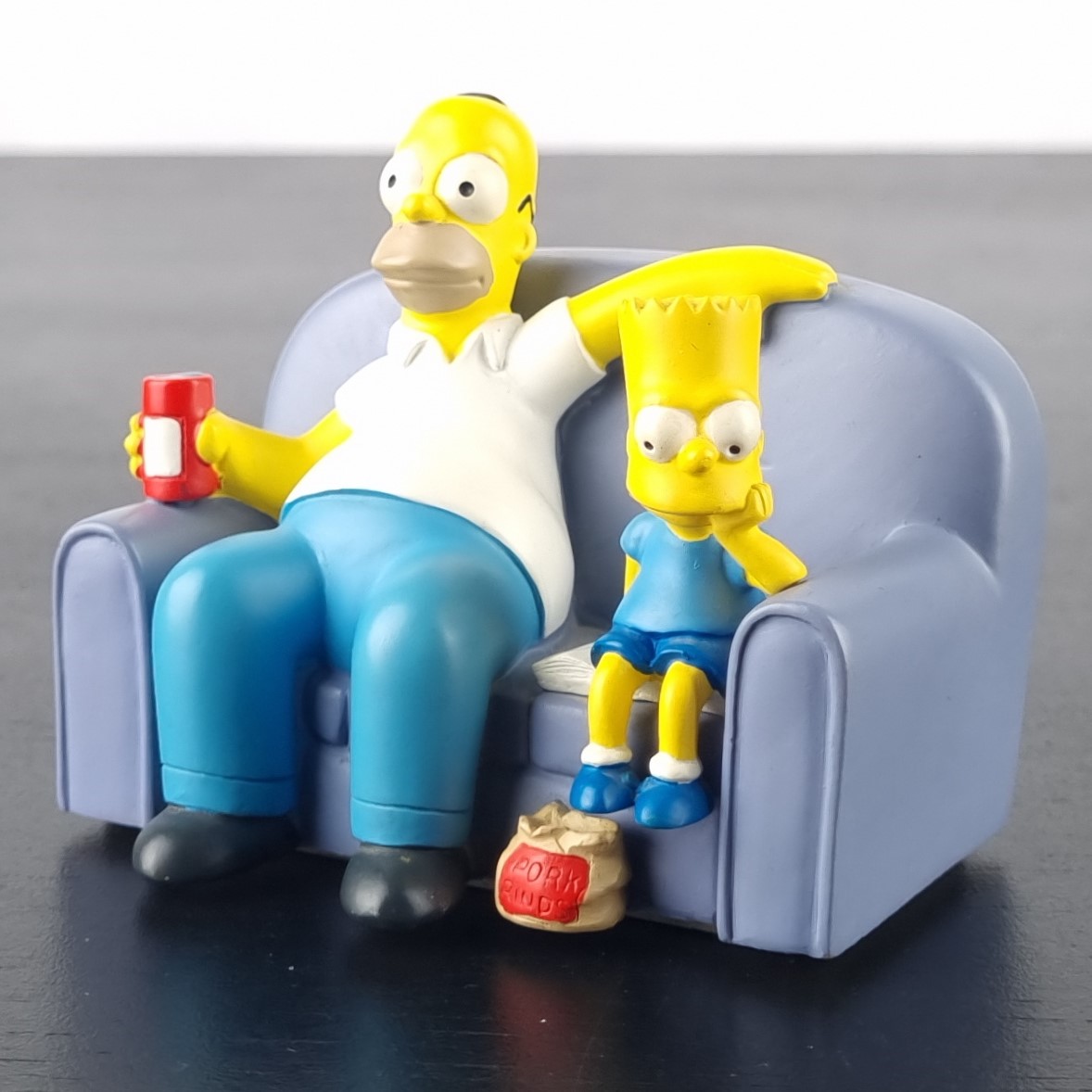 Magnificent, vintage statue of Bart sitting on the couch with his father Homer Simpson.