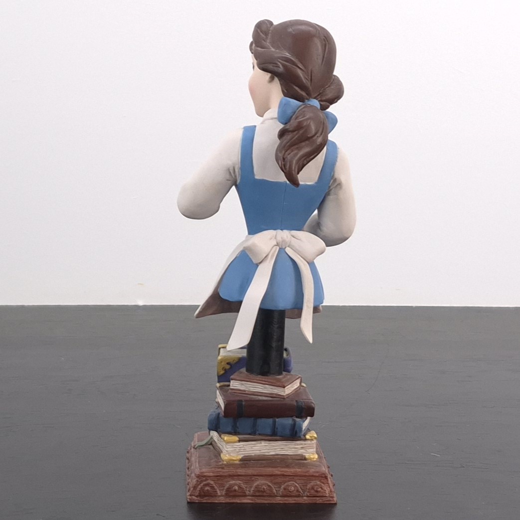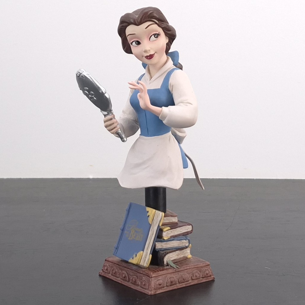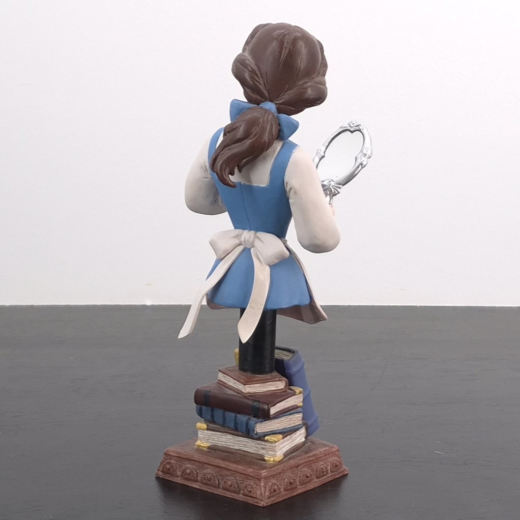 This unique bust from Belle of Beauty and the Beast was sculpted by Ruben Procopio and designed by Jacqueline Perrault Gonzales under Walt Disney’s license. It was taken in production by Enesco for their Grand Jester collection. Dates back to 2012. Made from durable resin, it remains in excellent condition. Elevate your collection with this enchanting bust of Belle from Beauty and the Beast! This exquisite piece features Belle gazing into a hand mirror, beautifully capturing her timeless elegance and curiosity. The base is thoughtfully crafted to resemble stacked books, adding a touch of literary charm to the design. Perfect for Disney fans, this bust is a must-have that brings both sophistication and magic to any space.