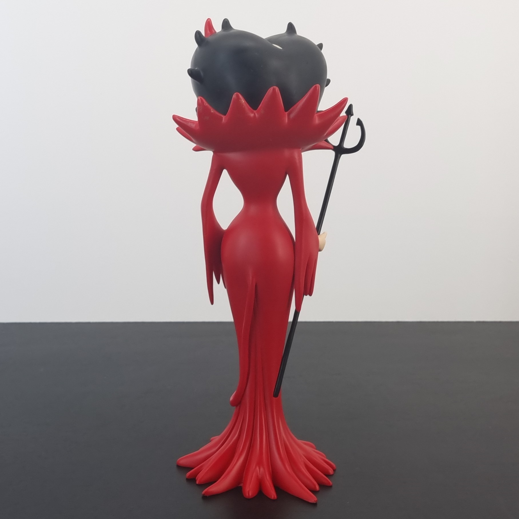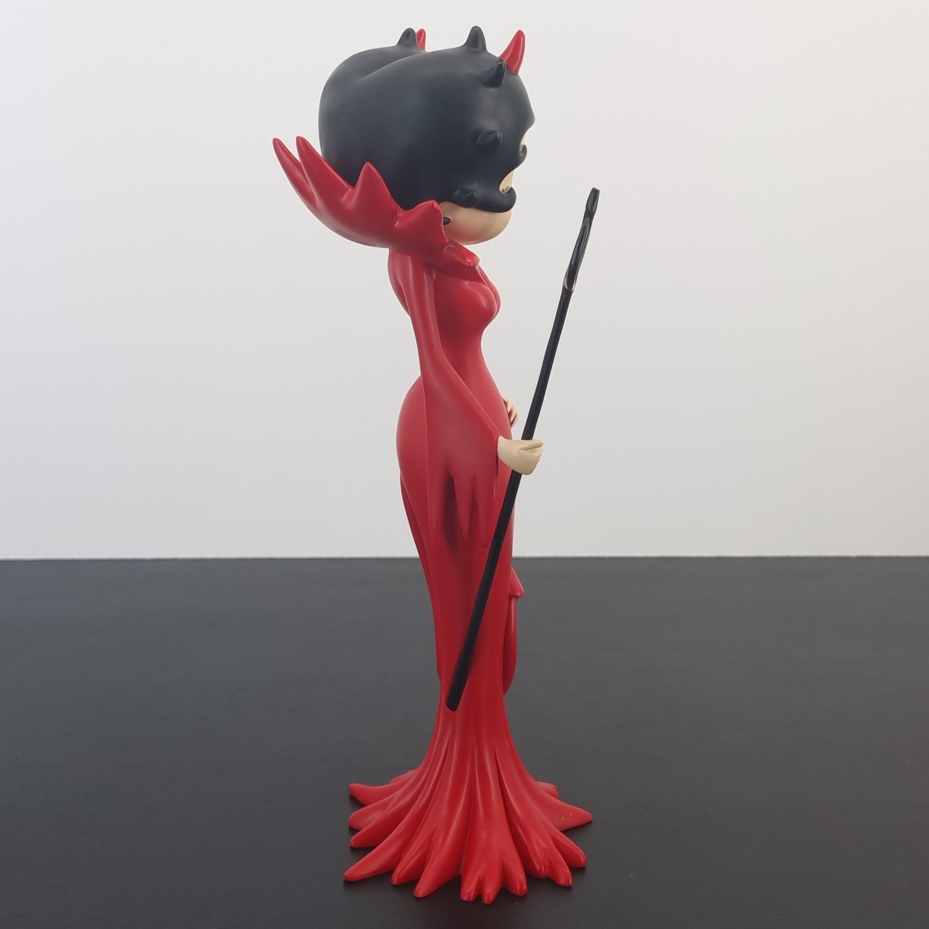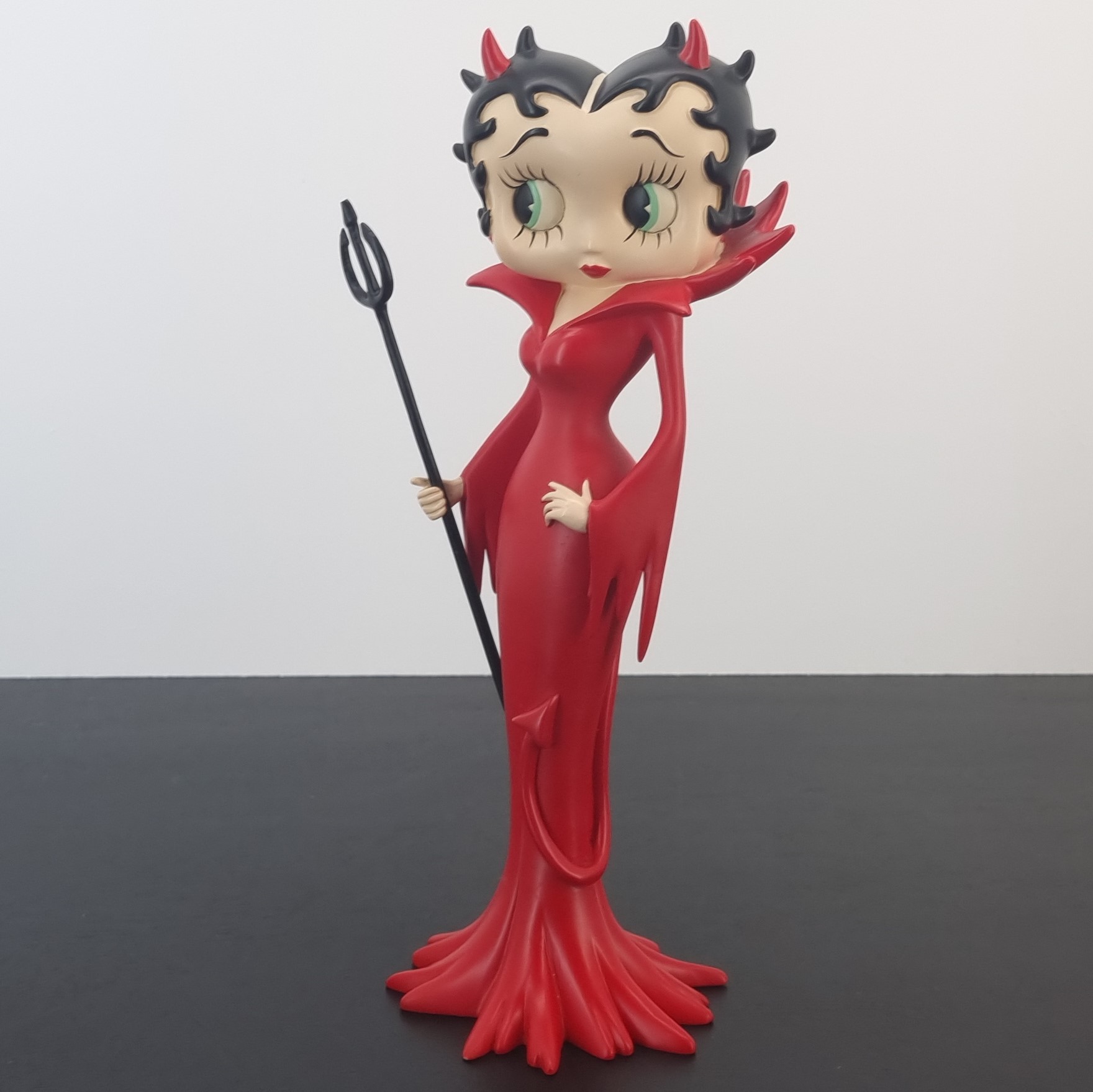 This vintage statue from Betty Boop was sculpted by Peter Mook under King Features’ license. It was taken in production by Rutten. Dates back to 2003. Crafted from durable resin, it remains in excellent condition. Unleash the mischievous charm of Betty Boop with this captivating statue of her dressed as a devil. Complete with a red outfit, horns, and a pitchfork, this piece is perfect for any fan of her iconic style. Add a touch of playful rebellion to your collection, celebrating the timeless allure of Betty Boop in a devilishly delightful way!