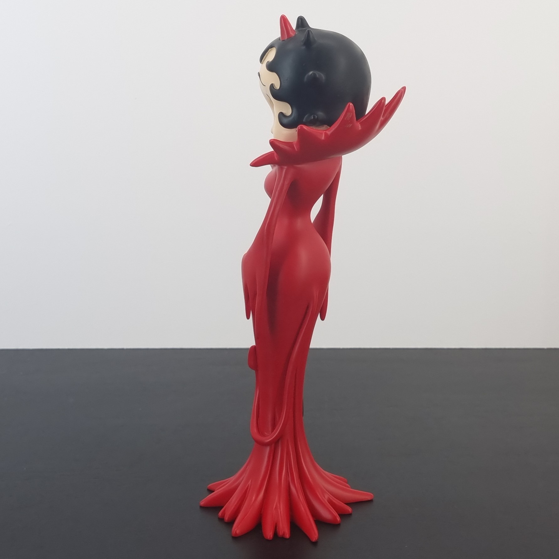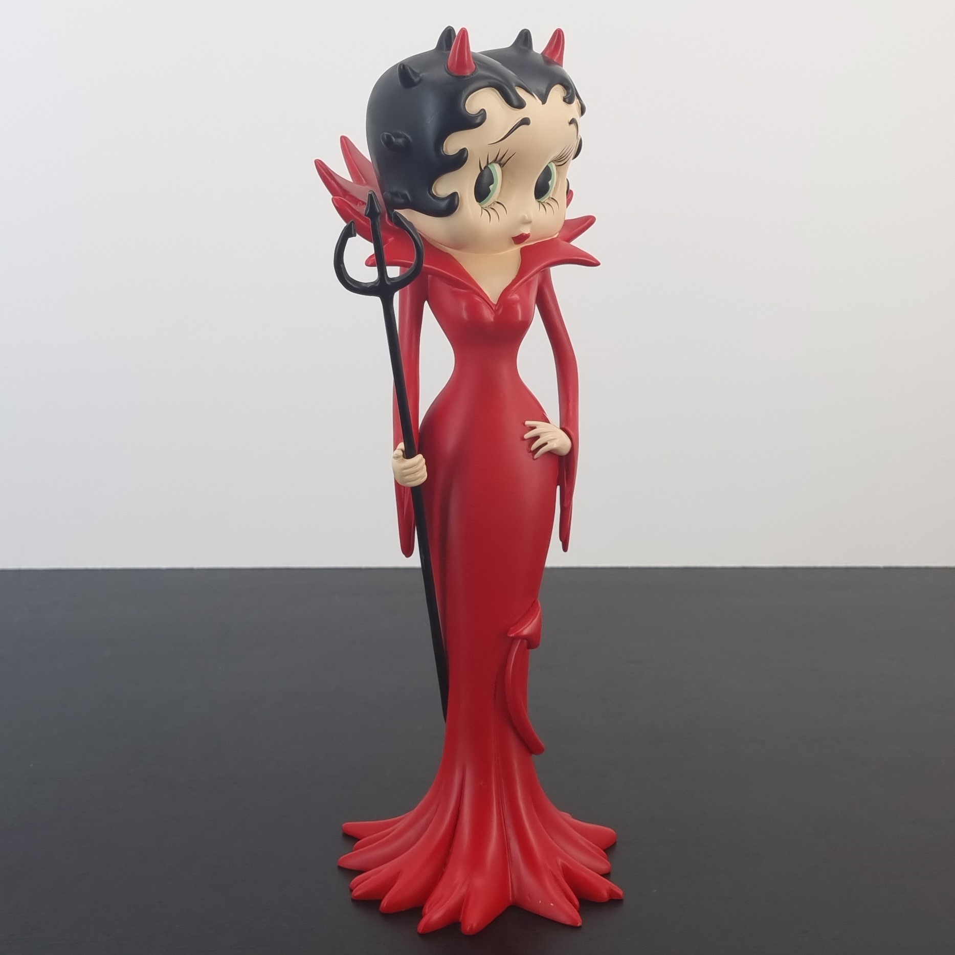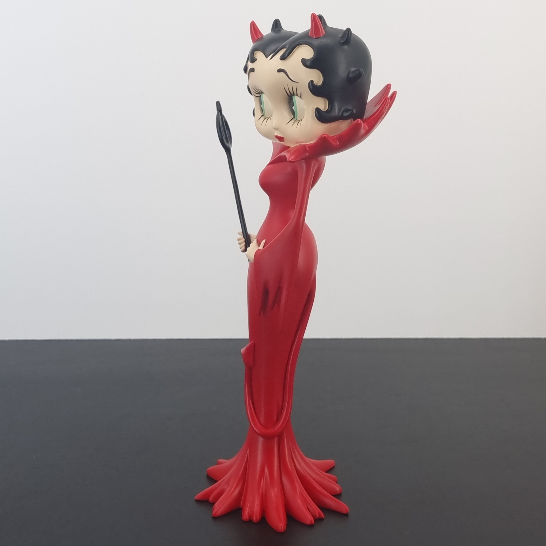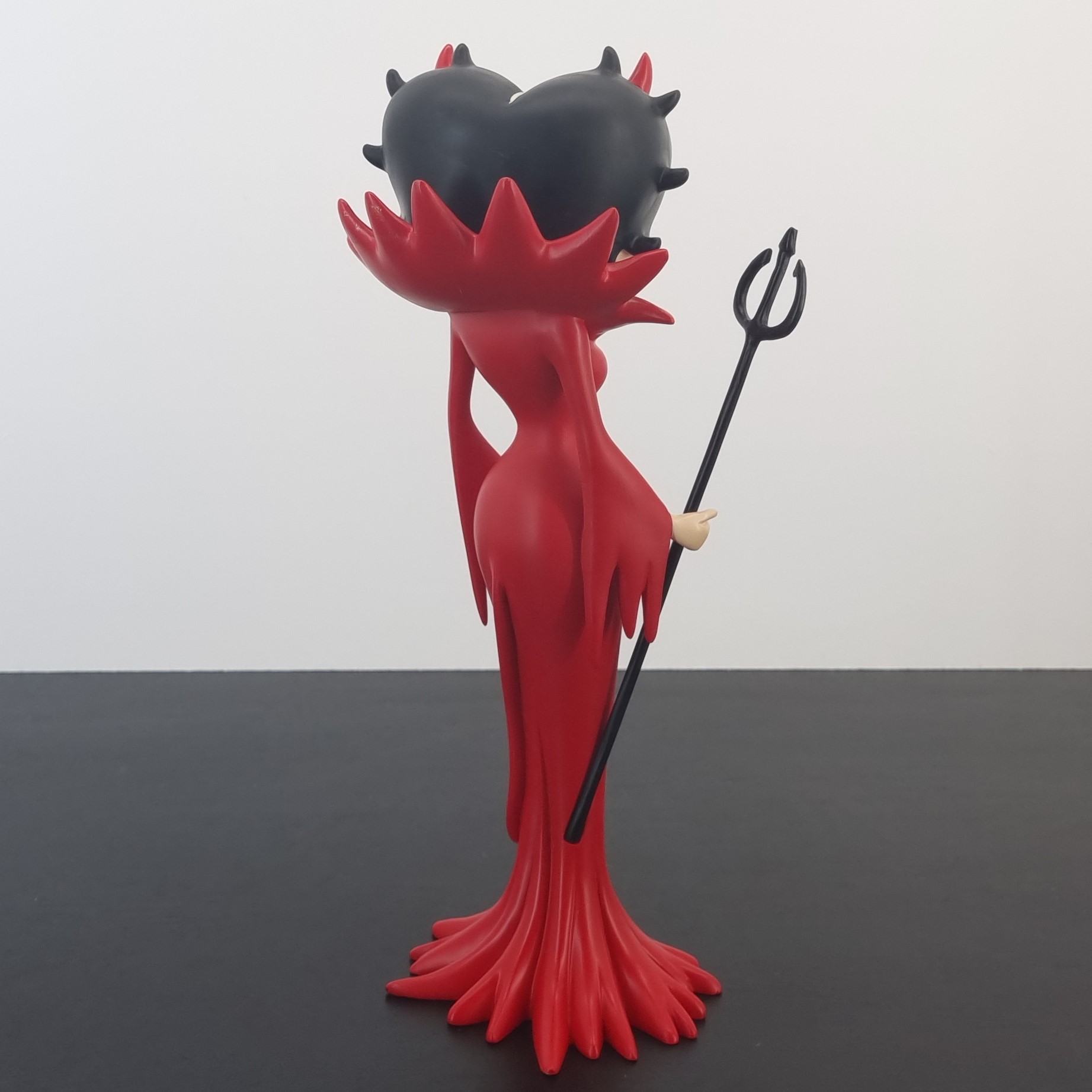 This vintage statue from Betty Boop was sculpted by Peter Mook under King Features’ license. It was taken in production by Rutten. Dates back to 2003. Crafted from durable resin, it remains in excellent condition. Unleash the mischievous charm of Betty Boop with this captivating statue of her dressed as a devil. Complete with a red outfit, horns, and a pitchfork, this piece is perfect for any fan of her iconic style. Add a touch of playful rebellion to your collection, celebrating the timeless allure of Betty Boop in a devilishly delightful way!