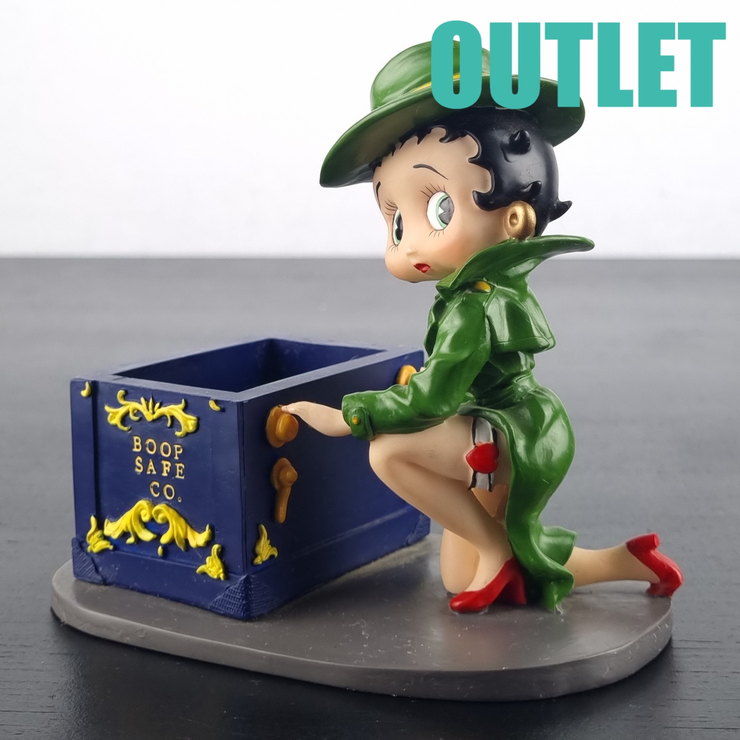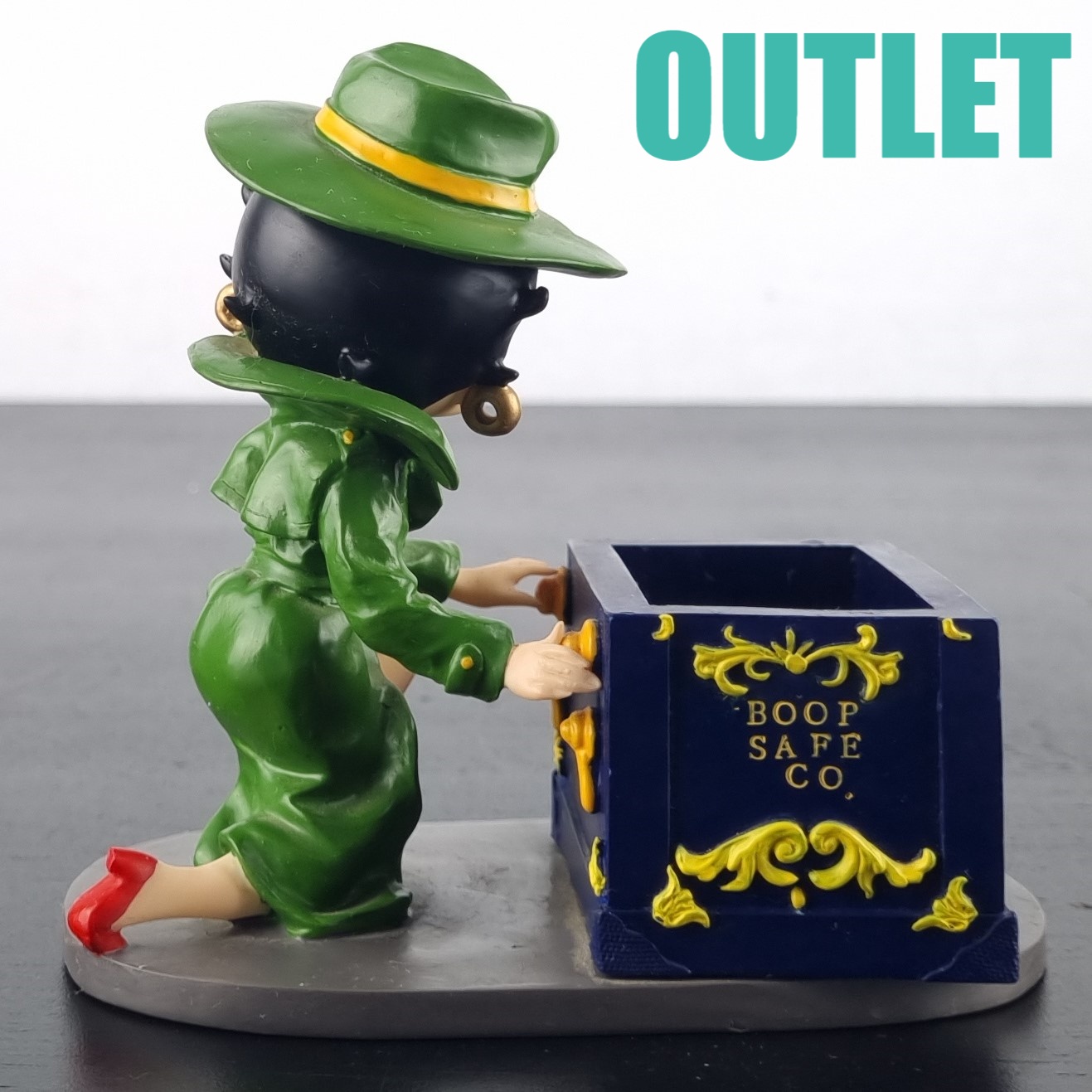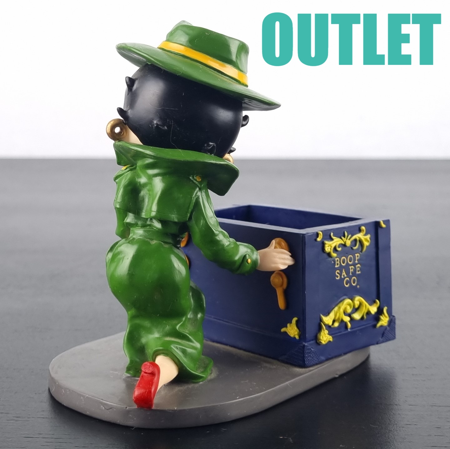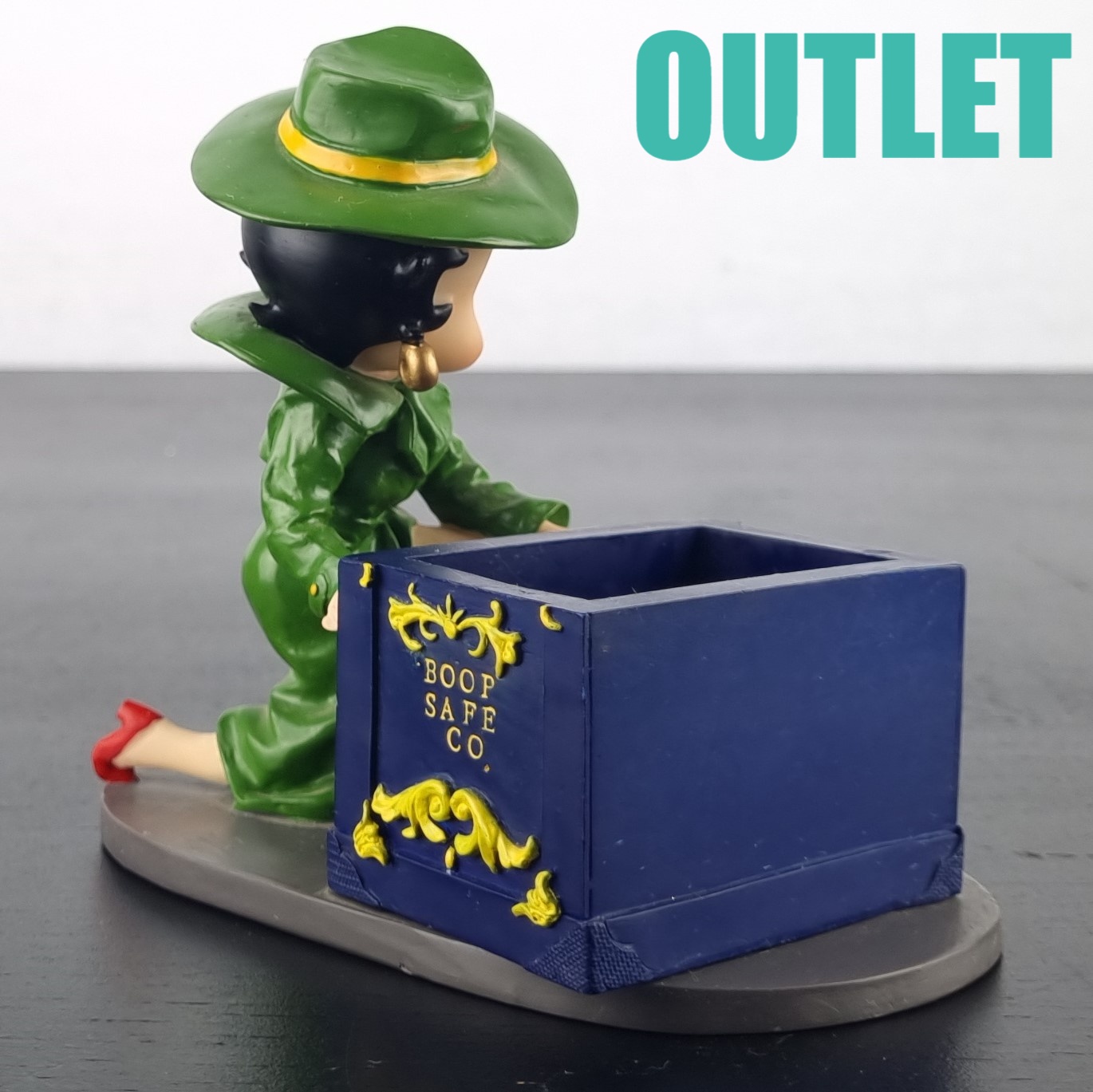 This statue of Betty Boop is in our outlet category because she is missing small parts of her fingers on the left hand. We suspect there should be a lid on the safe. But we can not confirm this.