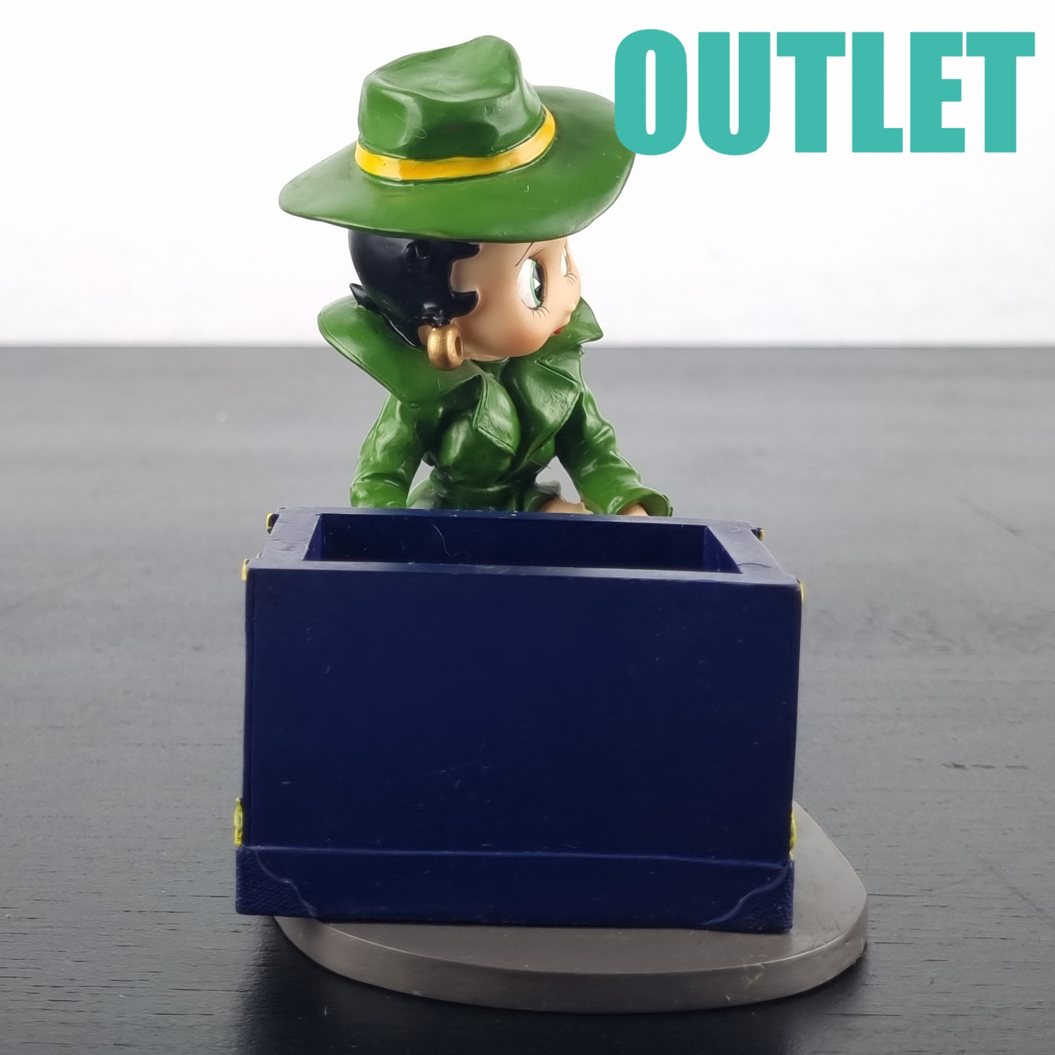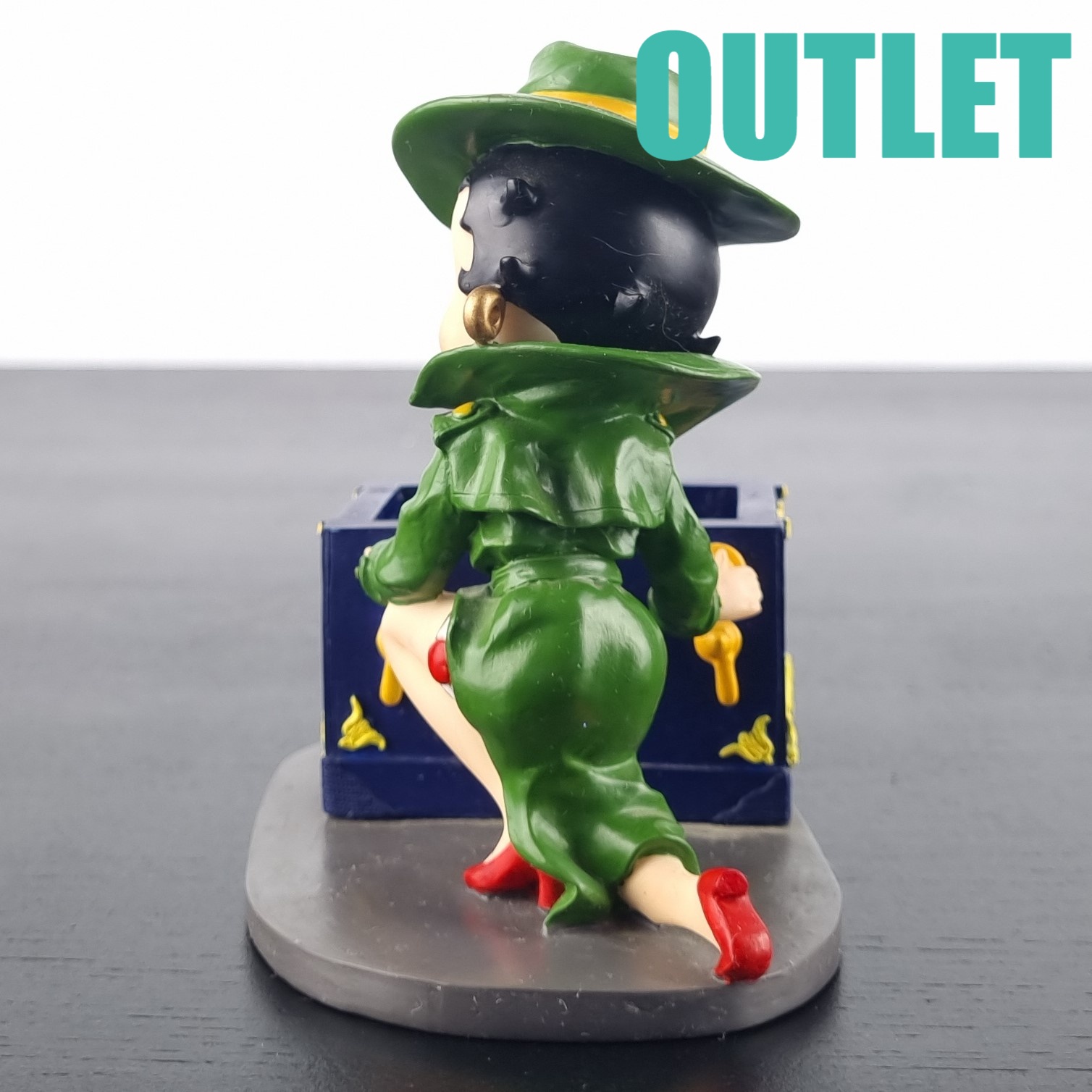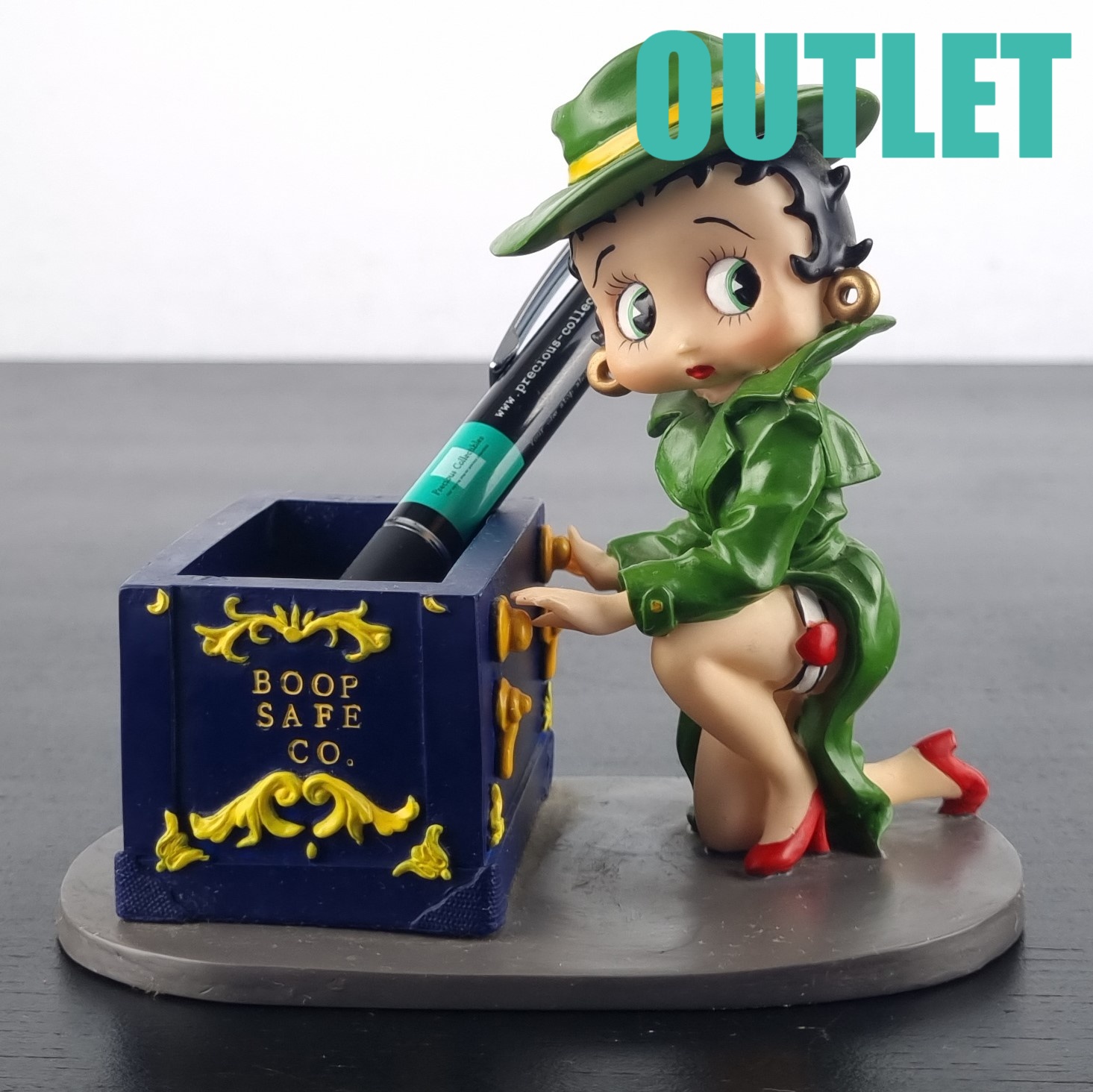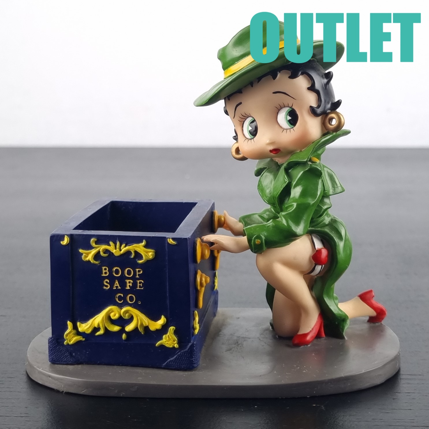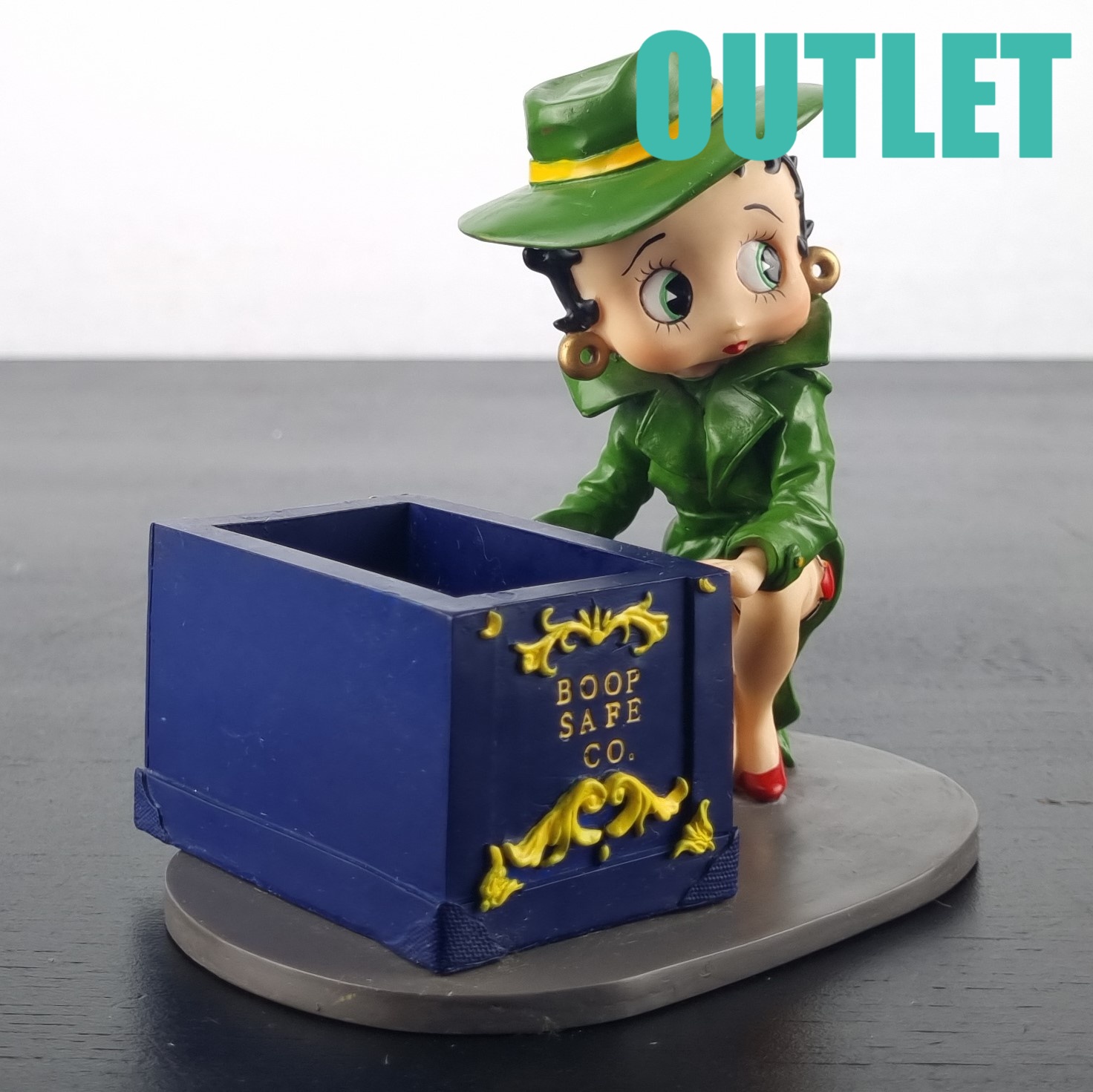 This statue of Betty Boop is in our outlet category because she is missing small parts of her fingers on the left hand. We suspect there should be a lid on the safe. But we can not confirm this.