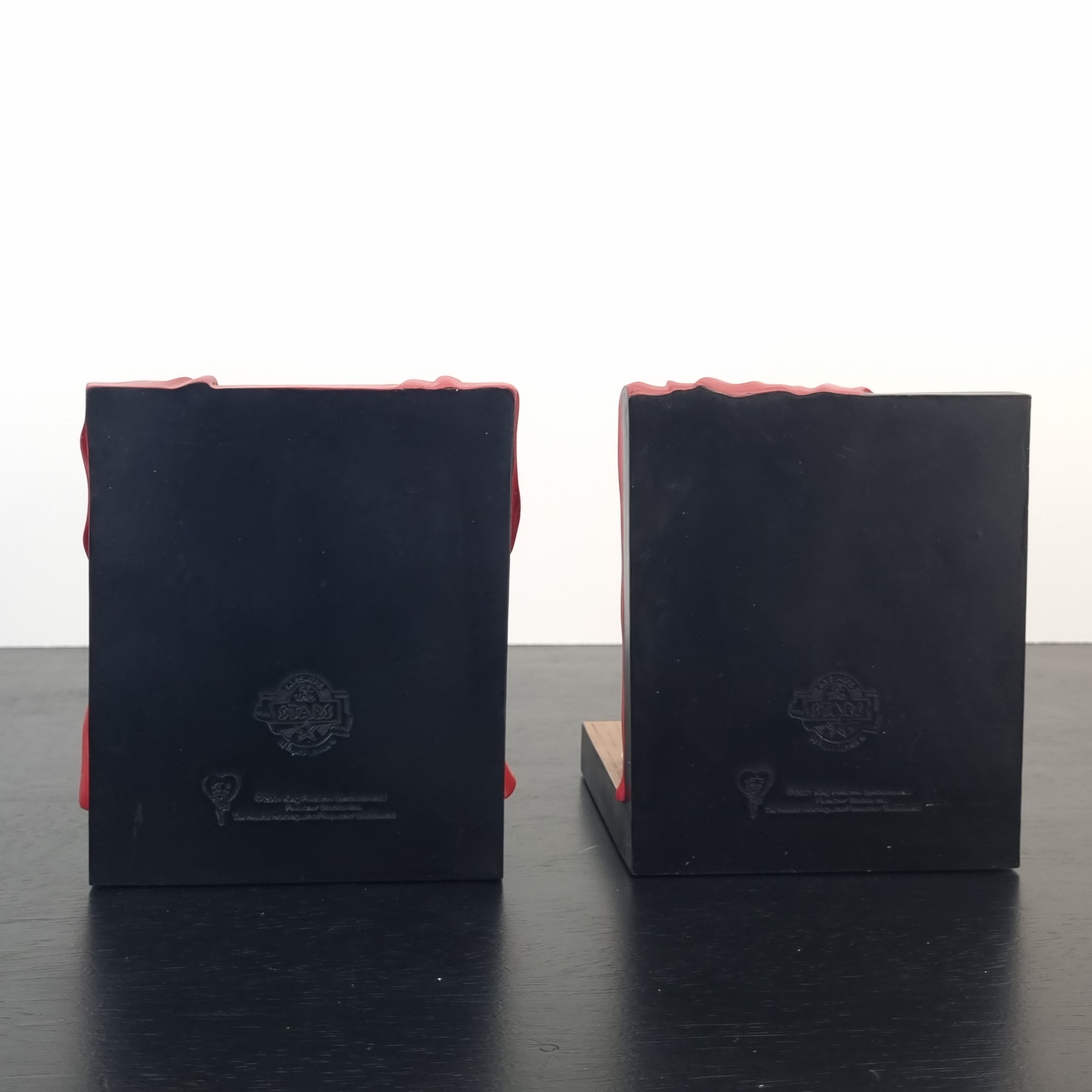 Vintage Betty Boop with Pudgy bookends crafted by Tropico Diffusion under King Features’ license. Part of Tropico Diffusion’s Avenue of the Stars collection. Dates back to 2001. Crafted from durable resin, it remains in excellent condition. Step into the world of showbiz with the Betty Boop Bookends: From Spotlight to Side Stage! One bookend captures Betty in full glamour, dazzling on stage under the spotlight in her elegant black gown, framed by rich red curtains. The other reveals a charming behind-the-scenes moment—Betty peeking playfully from the side stage with Pudgy by her side, ready for her cue. Together, they tell a story of stardom, style, and the magic of performance. Perfect for fans of vintage flair, these bookends bring Broadway charm to any bookshelf!