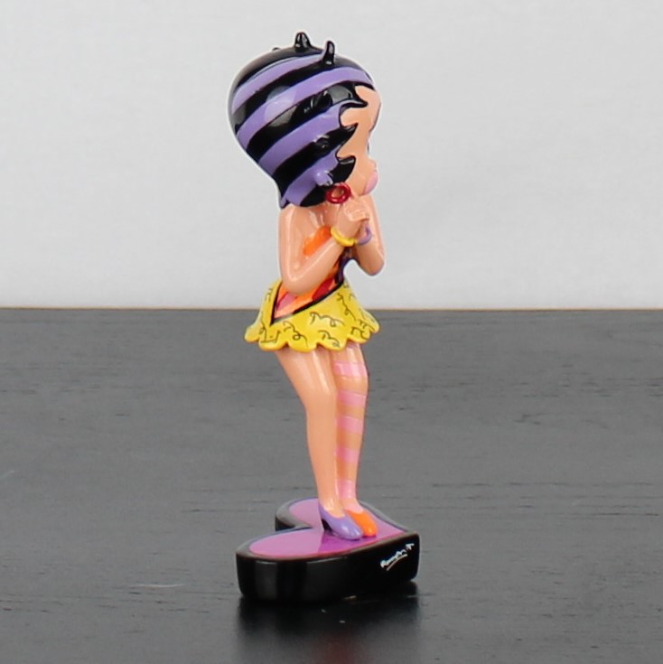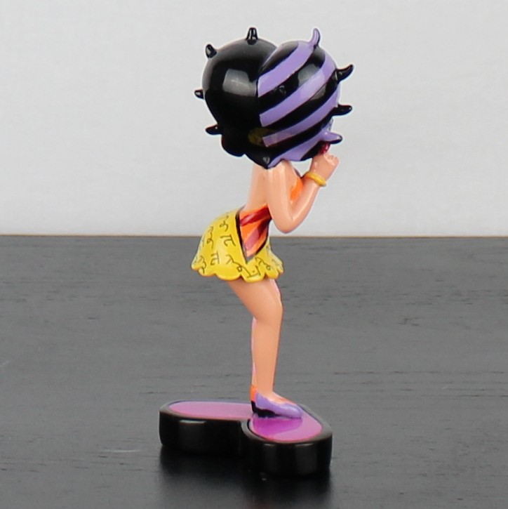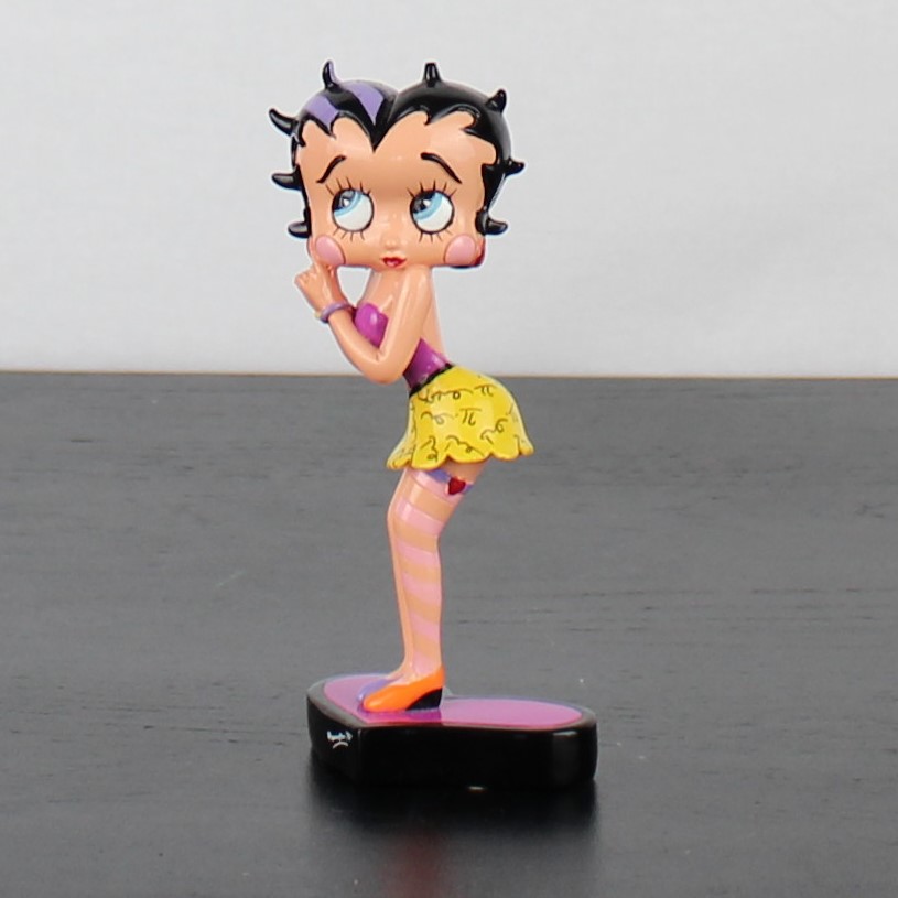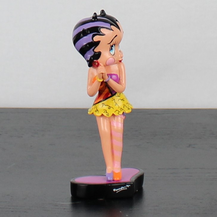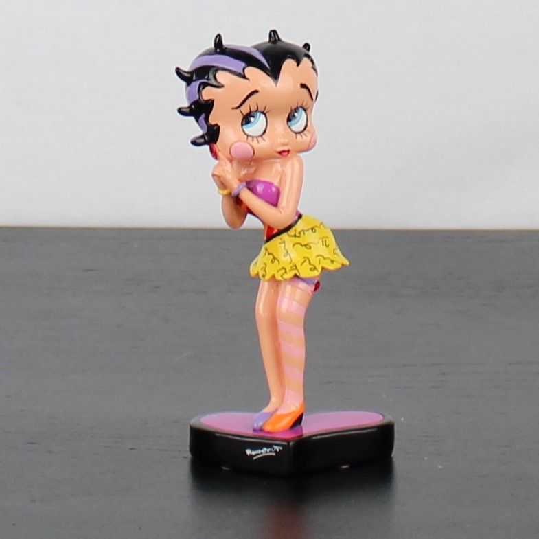 This unique figurine from Betty Boop was sculpted by Romero Britto under King Features’ license. It was taken in production by Enesco for their BRITTO collection. Dates back to 2018. Where timeless allure meets vibrant pop art! Betty is depicted standing coyly on a small heart, excuding her iconic charm and playful elegance. Adorned with Britto’s signature bold colors and whimsical patterns, her classic outfit sparkles with a contemporary twist.