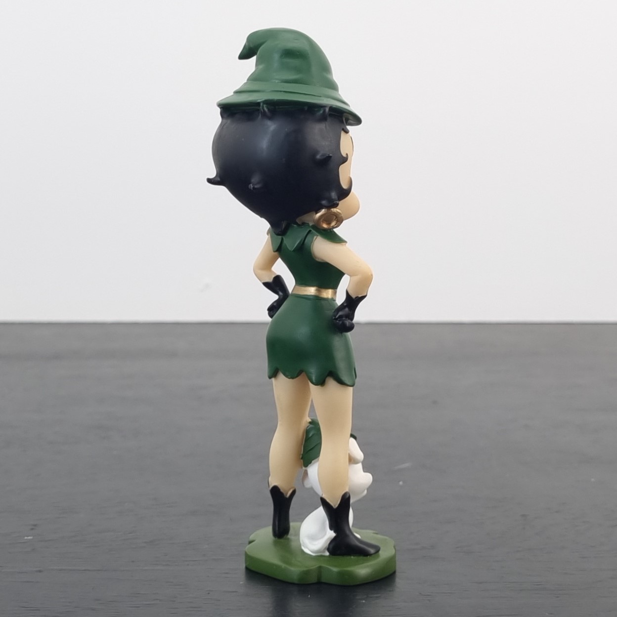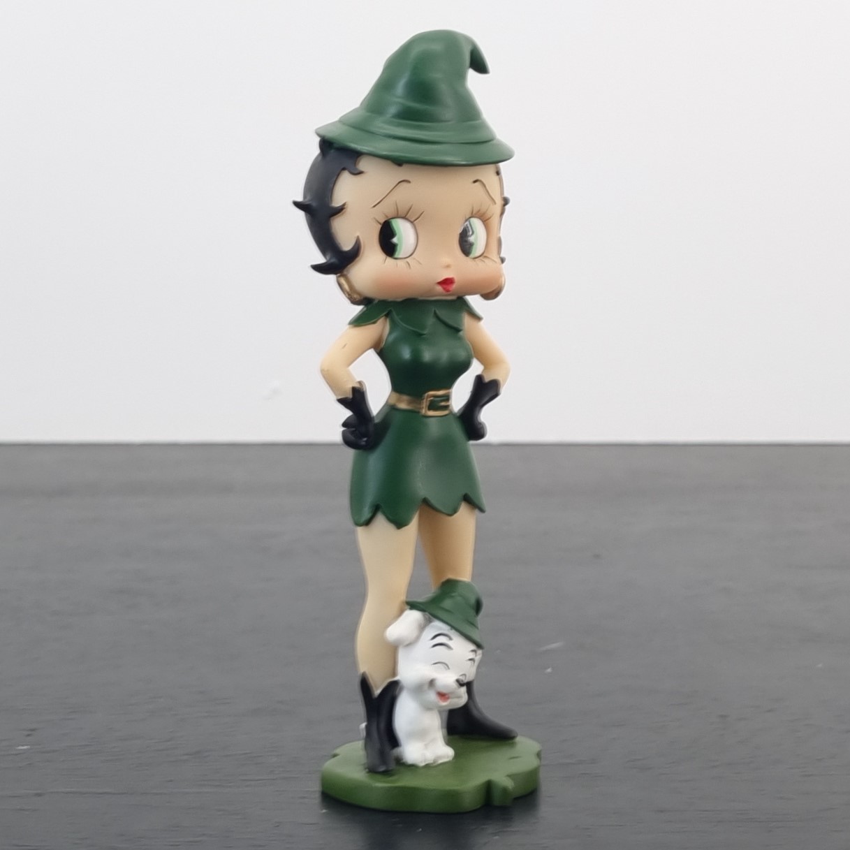 This vintage figurine from Betty Boop was crafted by C&S under King Features’ license. Dates back to 2010. Crafted from durable resin, it remains in excellent condition. Bring a touch of charm and good fortune to your collection with the “For Luck” Betty Boop figurine! Dressed as a delightful green elf, Betty radiates festive magic, while Pudgy sits happily between her feet, sporting a matching elf hat. With playful details and vibrant colors, this piece captures the spirit of joy and whimsy. Whether displayed for the holidays or year-round, it’s a perfect symbol of luck and vintage fun.