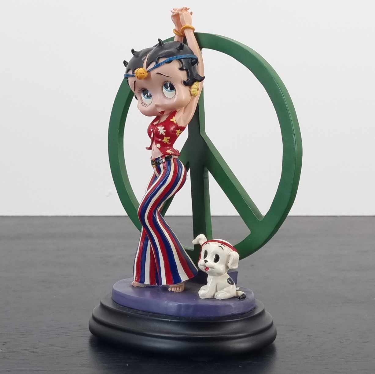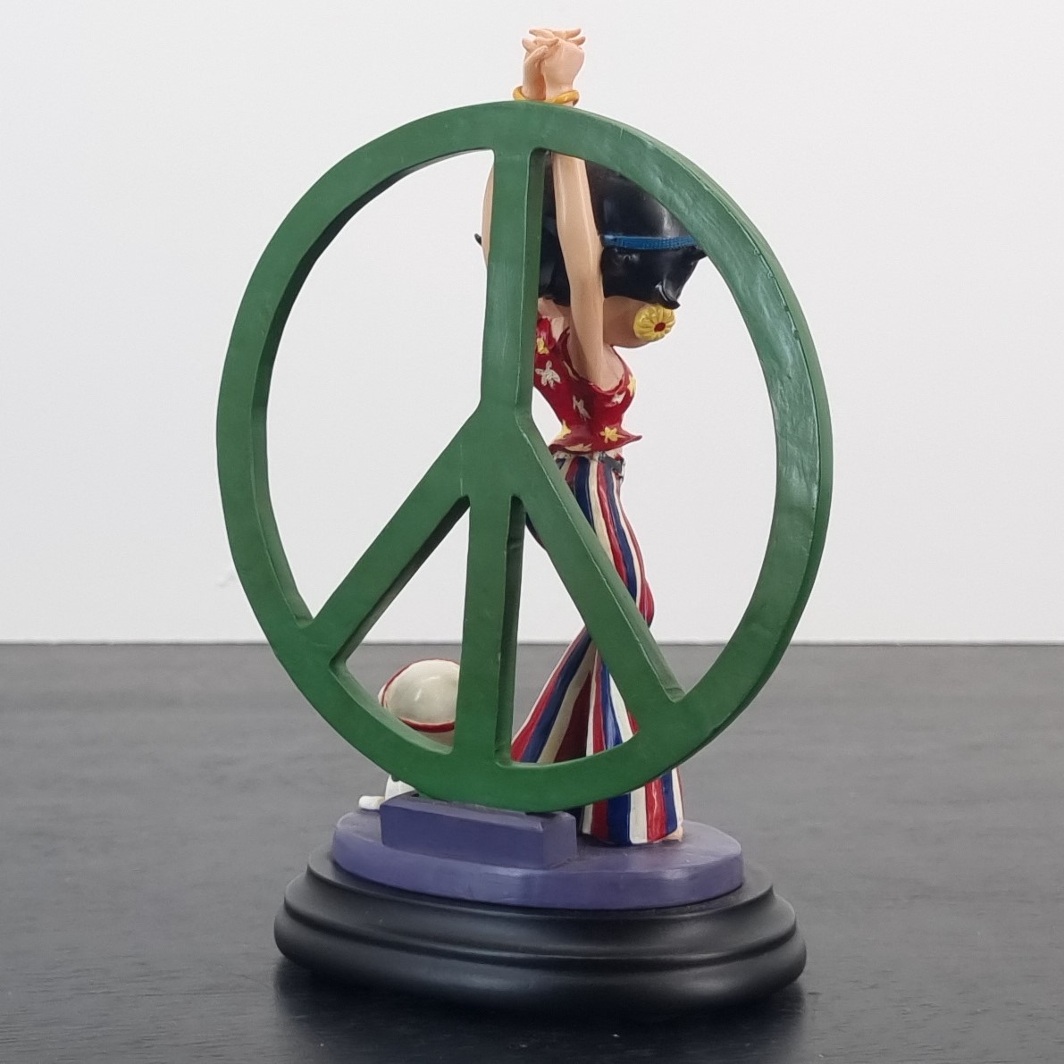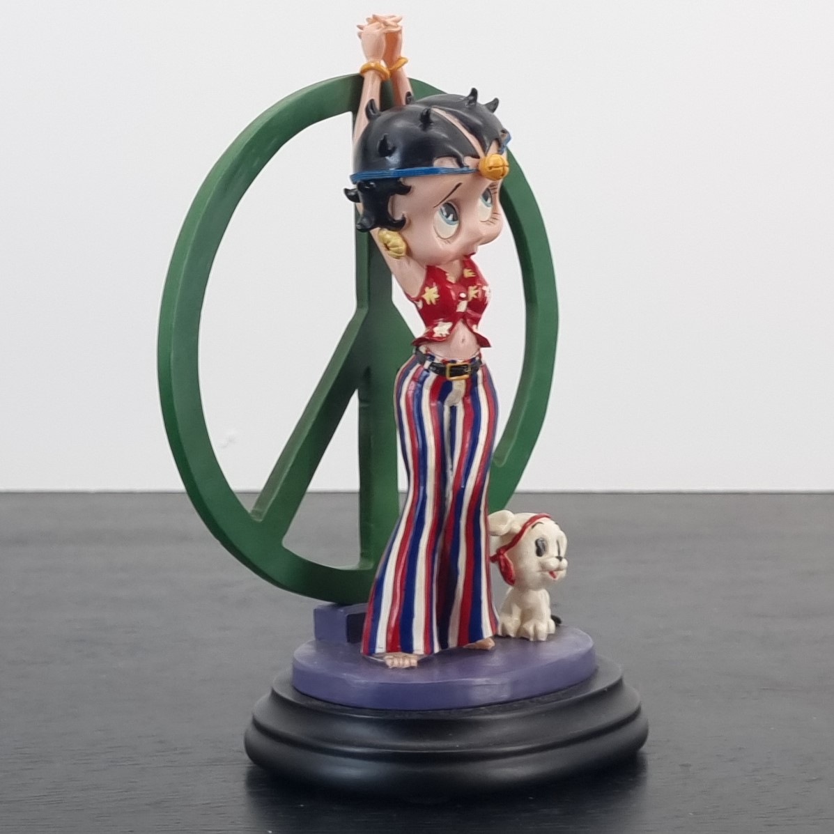 This vintage figurine from Betty Boop was crafted by Character Collectibles under King Features’ license. Dates back to 1998. Crafted from durable resin, it remains in excellent condition. Groove into the 60s with this dazzling Betty Boop figurine, donning a vibrant retro outfit that captures the spirit of the era! Complete with her loyal companion, Pudgy, sitting adorably by her side, this piece radiates charm and nostalgia. Behind Betty, a bold green peace sign stands tall, symbolizing the iconic message of love and unity. Perched gracefully on a sturdy base, this figurine is a must-have for collectors and fans of vintage style.