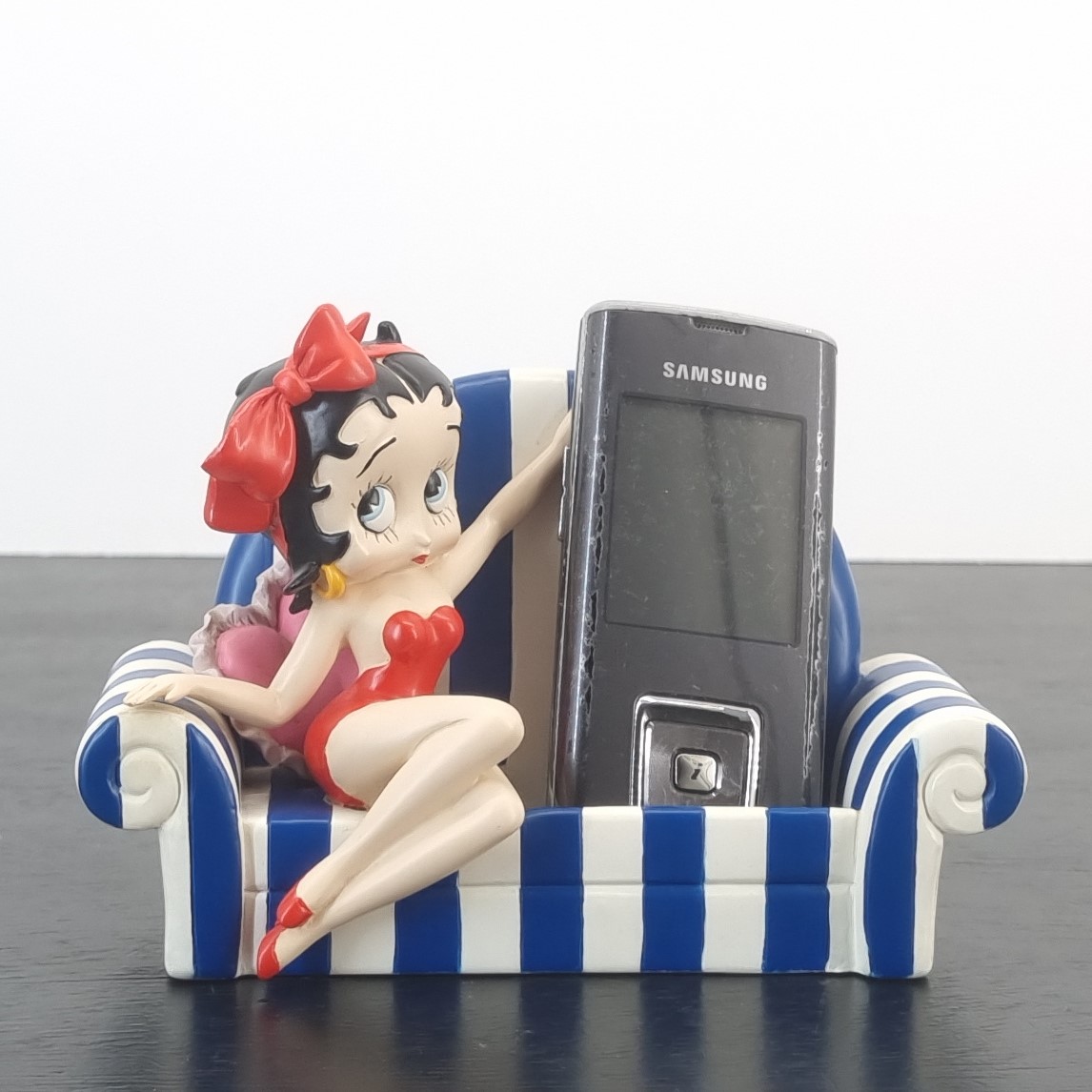 Vintage Betty Boop phone holder, crafted by Tropico Diffusion under King Features’ license. Part of Tropico Diffusion’s Avenue of the Stars collection. Dates back to 2001. Crafted from durable resin, it remains in excellent condition. Add a touch of vintage charm to your decor with the Betty Boop “Lounge Chic” phone holder! Betty sits stylishly on a blue and white striped couch, dressed to impress in a red dress, matching pumps, and an oversized bowtie that exudes her playful elegance. With one hand poised over the back of the couch, she seems ready to hold your attention, while the other half of the couch is the perfect spot to rest your phone. Both functional and fabulous, this piece brings timeless character to any space. Let Betty Boop keep your phone close and your style unforgettable!