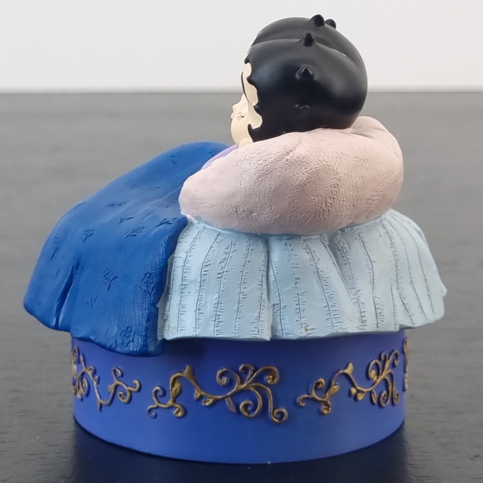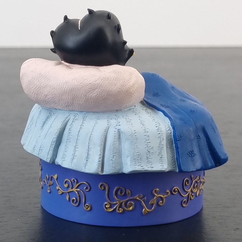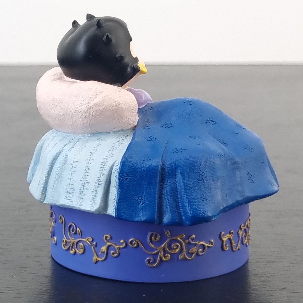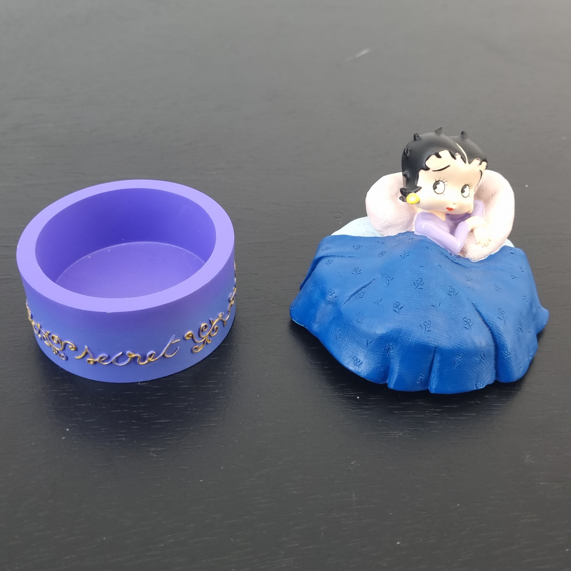 Vintage Betty Boop tape dispenser crafted by Tropico Diffusion under King Features’ license. Part of Tropico Diffusion’s Avenue of the Stars collection. Dates back to 2002. Add a touch of mystery and glamour to your collection with this enchanting Betty Boop Boîte de Secret—a secret box like no other! Elegantly lounging in her luxurious round bed, Betty radiates vintage charm and playful sophistication. At the base, ornate golden detailing frames the word “Secret”, seamlessly woven into the design for an extra hint of intrigue. Lift Betty gently to reveal the hidden compartment beneath—perfect for storing your tiny treasures. It’s a stylish blend of beauty and mystery, just like Betty herself!