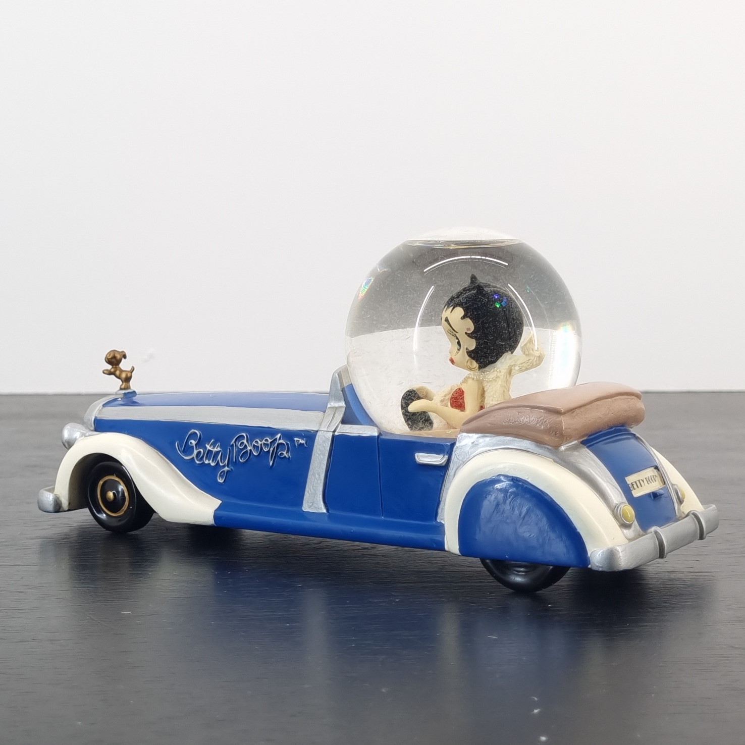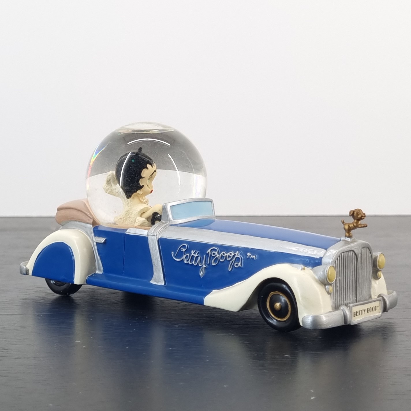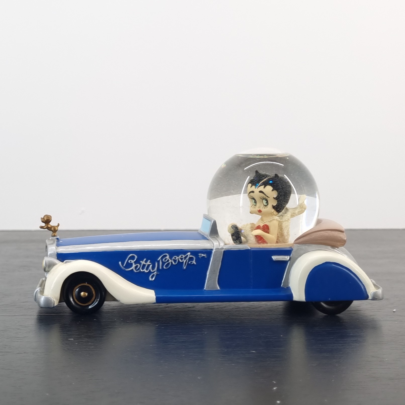 Vintage Betty Boop snow globe, crafted by Tropico Diffusion under King Features’ license. Part of Tropico Diffusion’s Avenue of the Stars collection. Dates back to 2002. Crafted from durable resin, it remains in excellent condition. Cruise into charm with this dazzling Betty Boop snow globe! Seated in a sparkling glass dome atop her luxurious long blue limousine, Betty reigns in retro glamour while Pudgy proudly stands as the hood ornament, adding extra flair to the ride. With her name elegantly scripted along the sides, this collectible is a celebration of classic cartoon nostalgia and timeless style. Shake it up, and let the flurry of snow transport you to a world of vintage magic. A must-have centerpiece for any Betty Boop fan!
