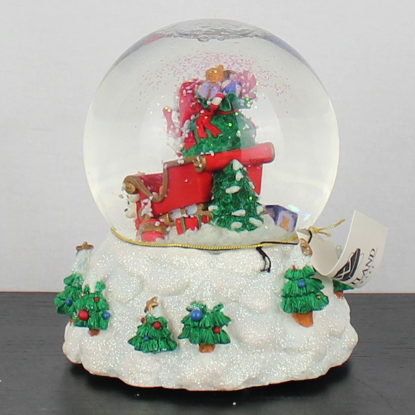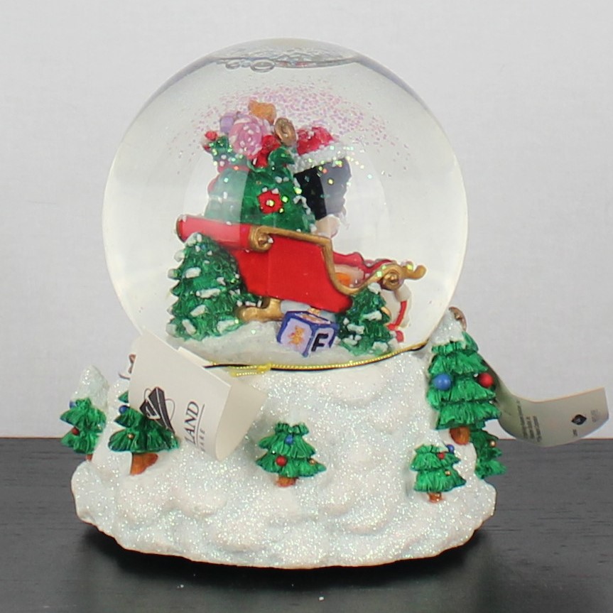 Vintage Betty Boop snow globe crafted by Westland Giftware under King Features’ license. Dates back to 1999. Crafted from durable resin and glass, it remains in excellent condition. Celebrate the magic of the holidays with this festive Betty Boop snow globe! Inside, Betty Boop sits cheerfully on a sleigh, with Pudgy adorably dressed as a reindeer leading the way. Surrounded by colorful gifts and a beautifully decorated Christmas tree, the scene captures the joy of the season. The globe rests atop a glittering snow-covered mountain base, adorned with mini Christmas trees for extra charm. Wind it up to hear the classic tune “Sleigh Ride” as snow swirls around this heartwarming holiday display—a perfect collectible for Betty fans and Christmas lovers alike!