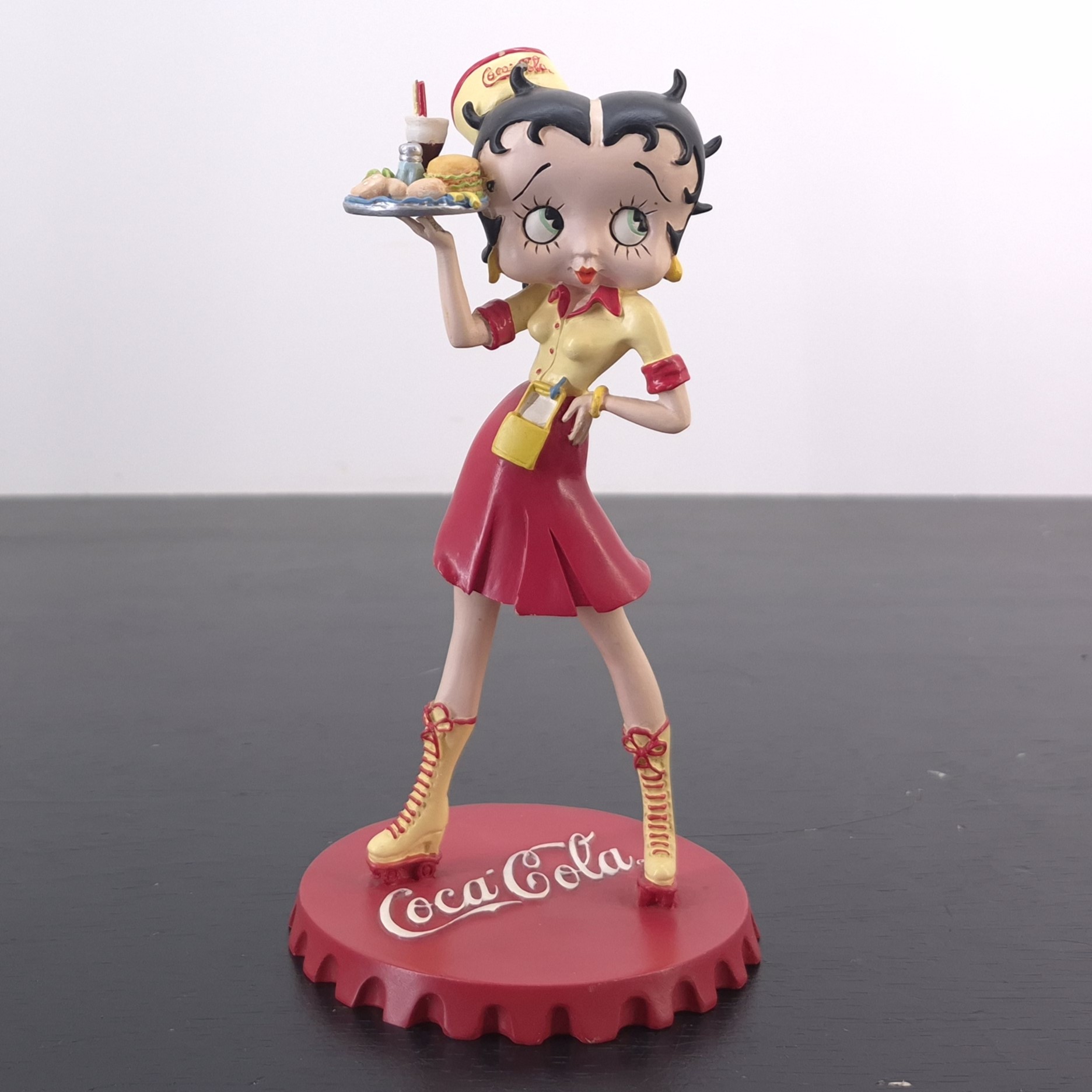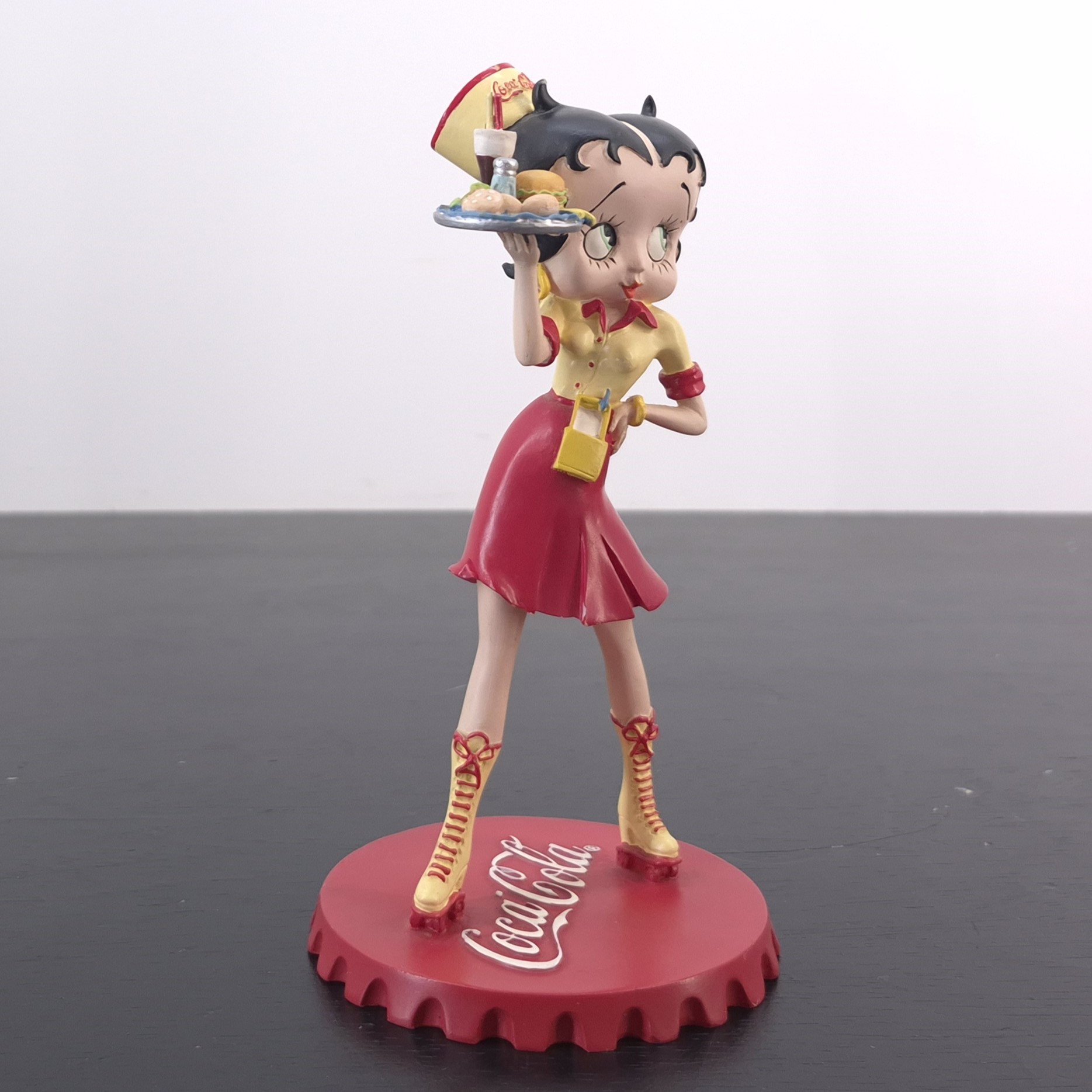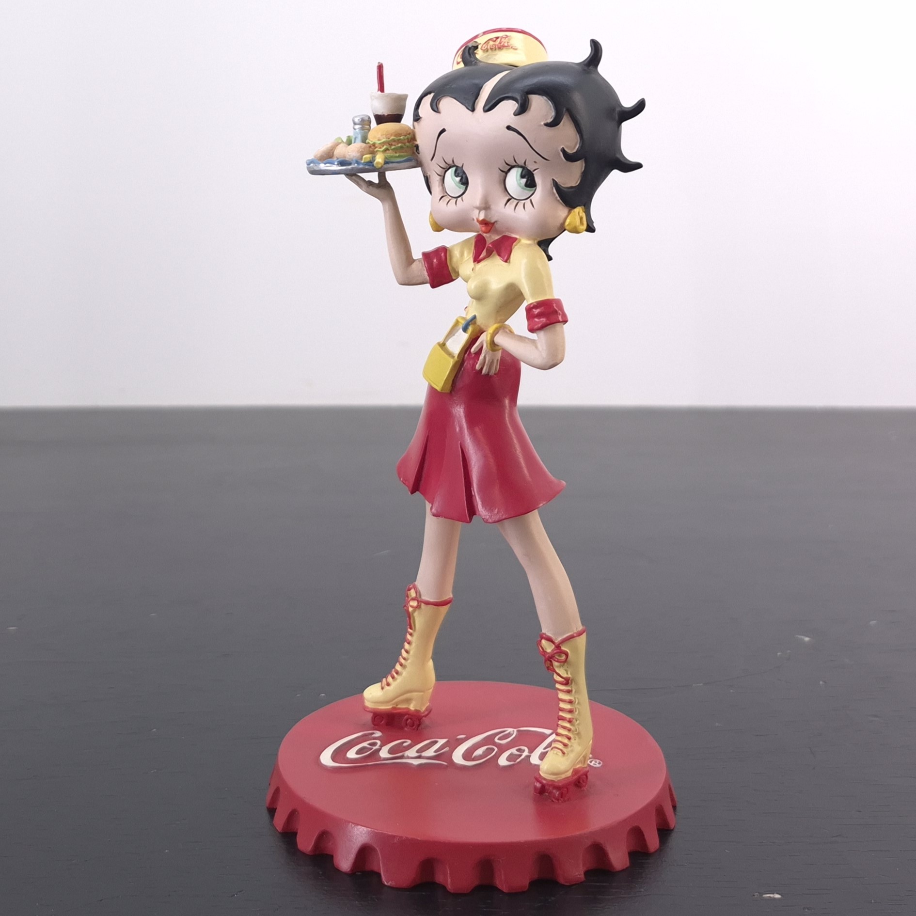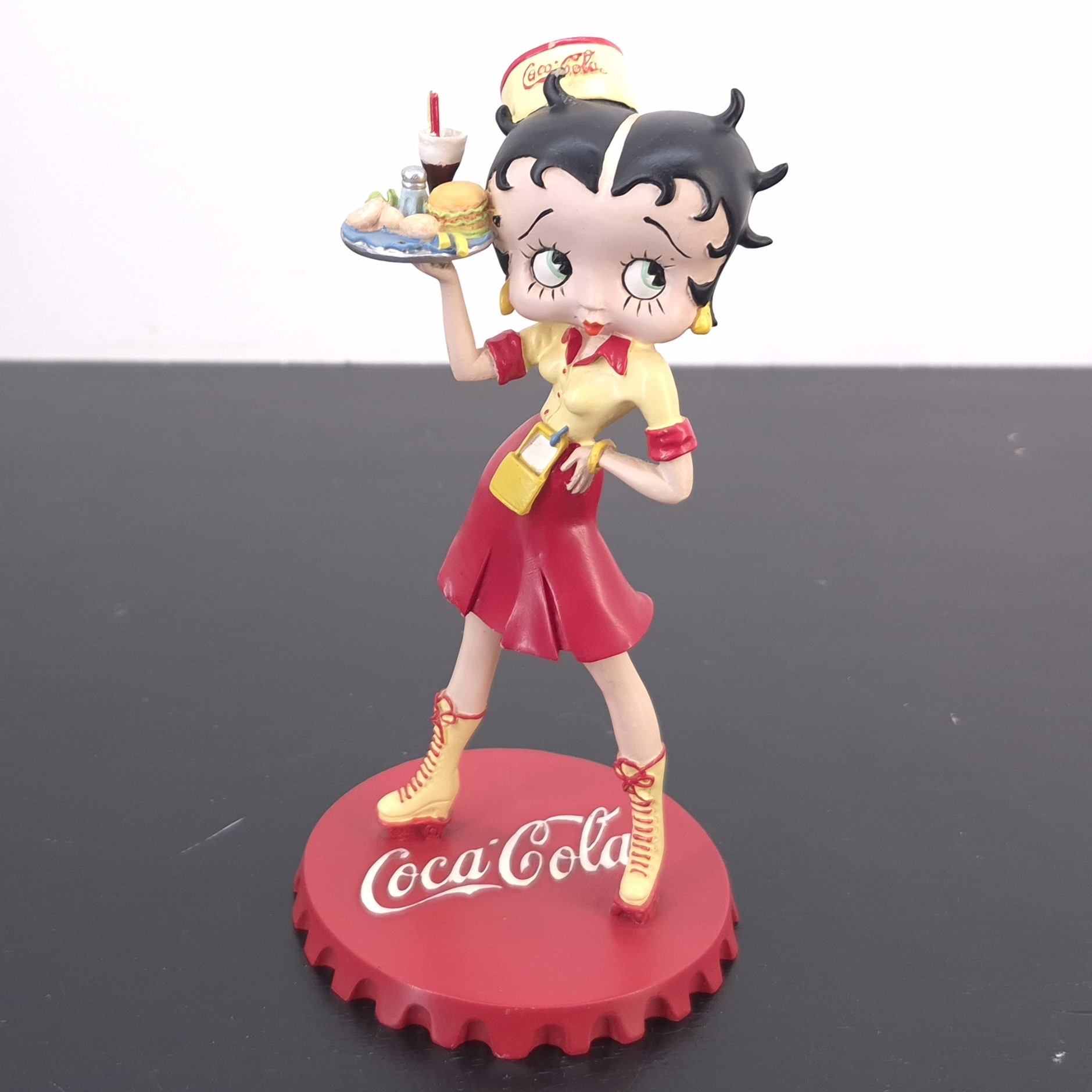 Vintage figurine of Betty Boop as waitress, crafted by Tropico Diffusion under Coca-Cola’s and King Features’ license. Part of Tropico Diffusion’s Avenue of the Stars collection. Dates back to 2003. Crafted from durable resin, it remains in good condition. Serve up a slice of nostalgia with this vibrant Betty Boop figurine, styled as a retro diner waitress in full Coca-Cola flair. She stands confidently atop a bold red Coca-Cola bottle cap, decked out in skates with high yellow socks, a flirty red skirt, and a sunny yellow top with red accents. Her matching cap proudly displays the Coca-Cola logo, while she balances a classic service tray loaded with burgers and a milkshake. This piece captures the spirit of 1950s Americana with playful charm and vintage detail. A must-have for collectors who love pop culture with a fizzy twist.