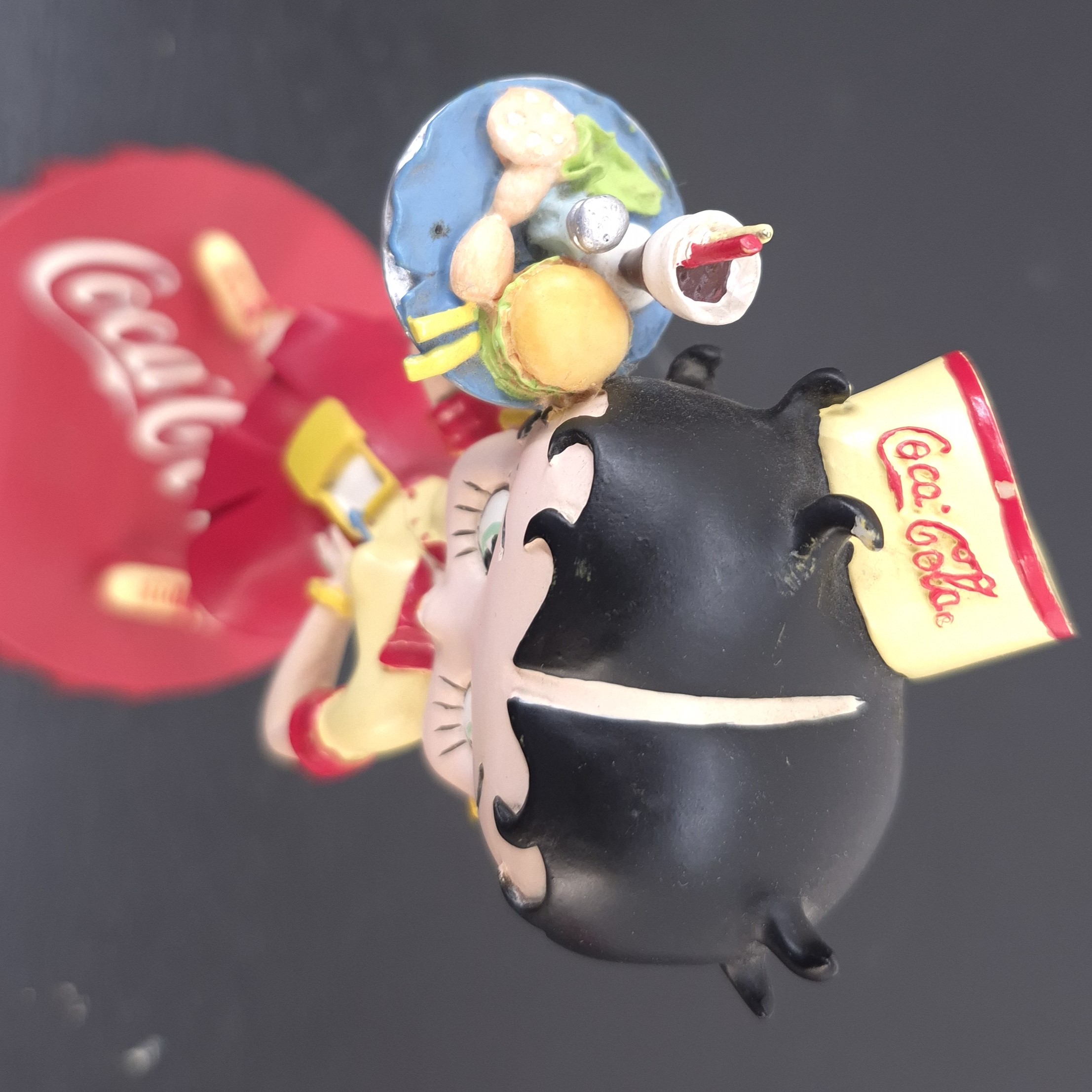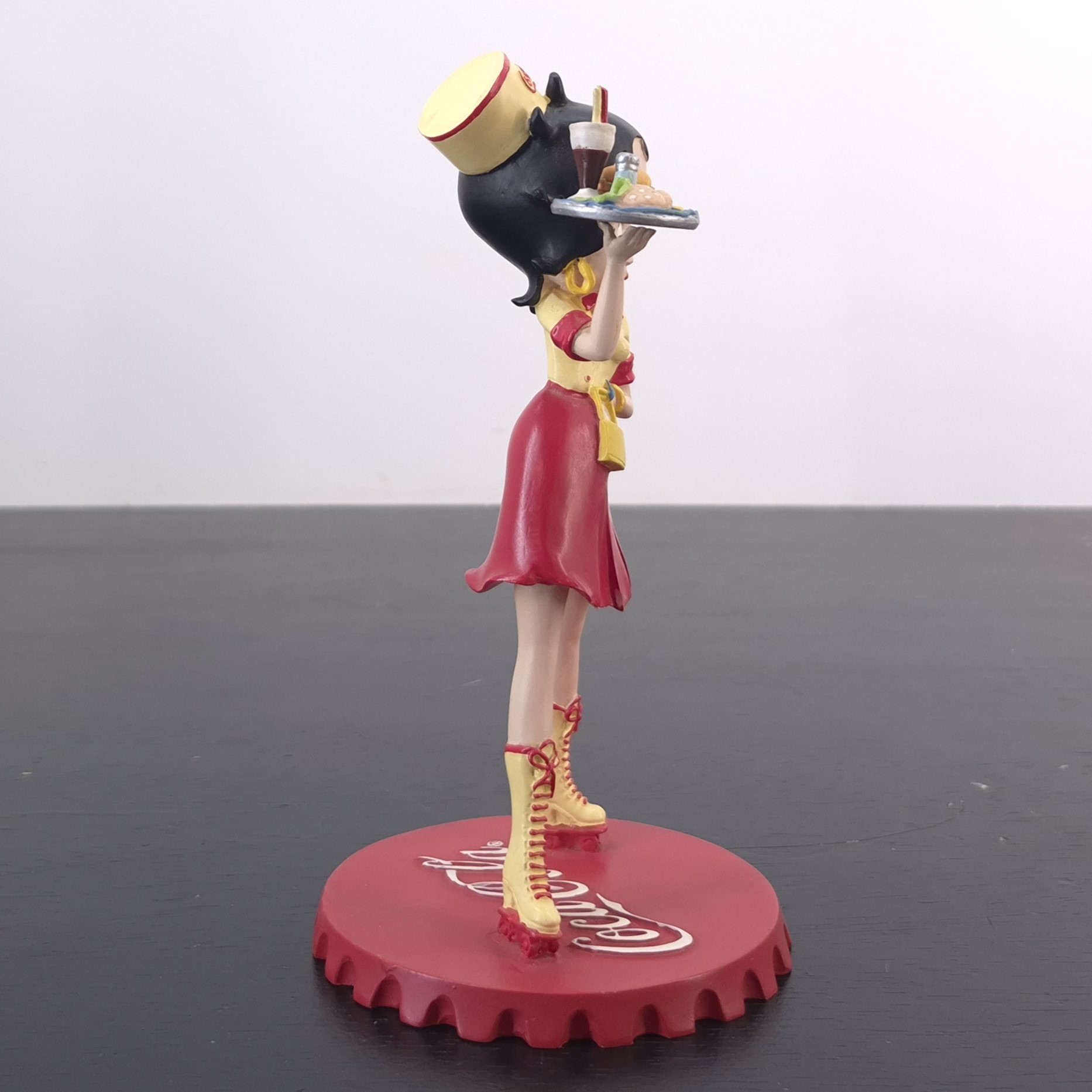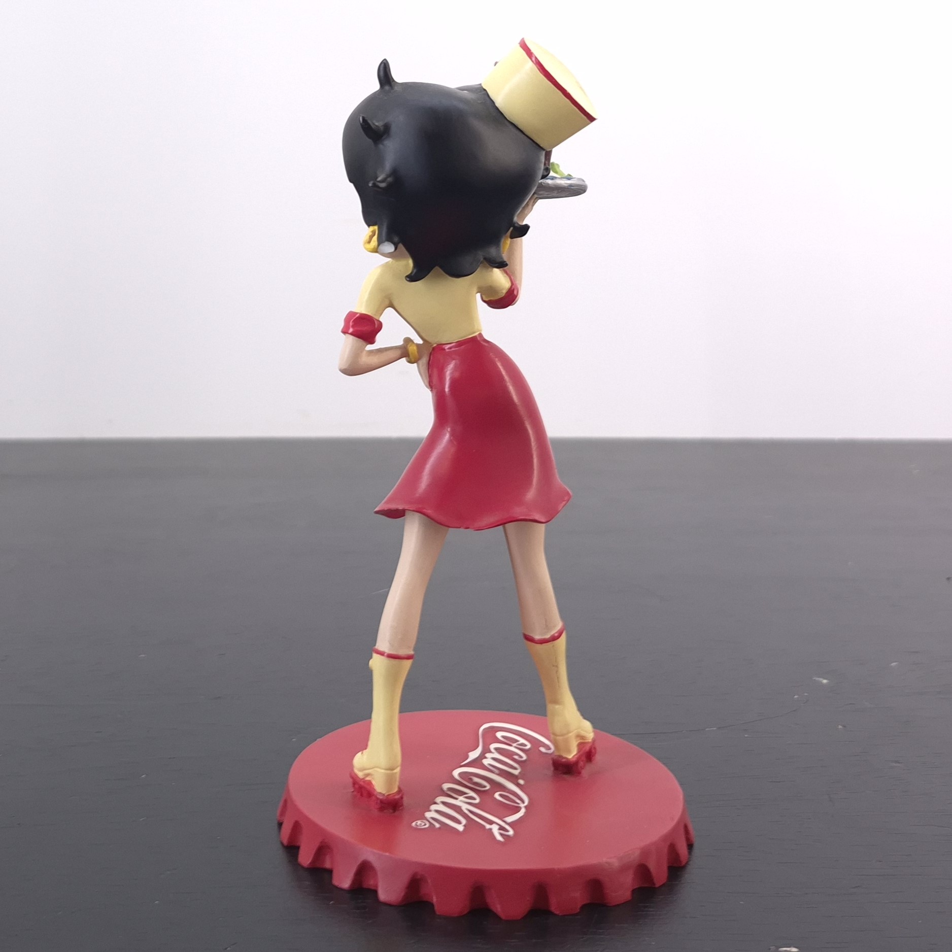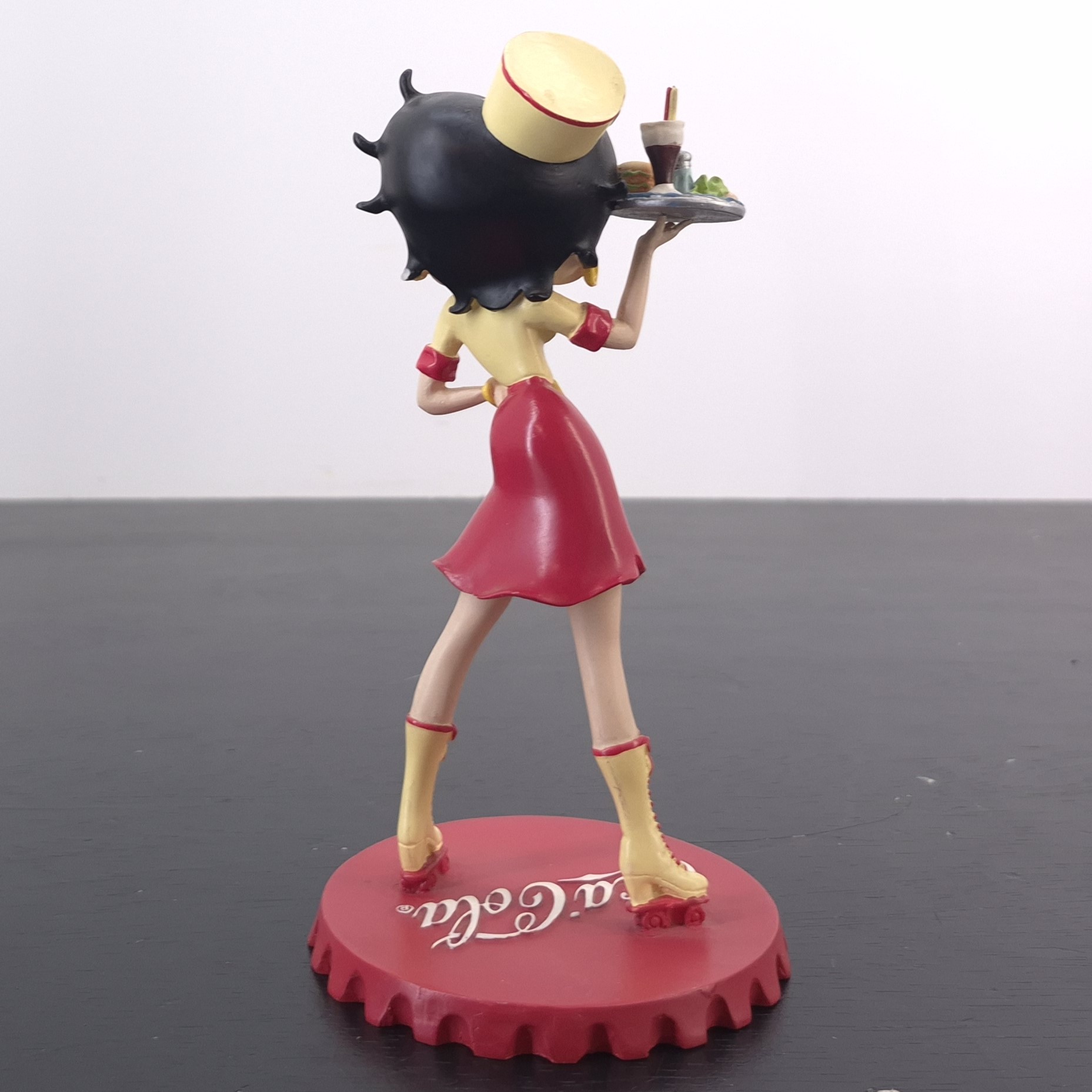 Vintage figurine of Betty Boop as waitress, crafted by Tropico Diffusion under Coca-Cola’s and King Features’ license. Part of Tropico Diffusion’s Avenue of the Stars collection. Dates back to 2003. Crafted from durable resin, it remains in good condition. Serve up a slice of nostalgia with this vibrant Betty Boop figurine, styled as a retro diner waitress in full Coca-Cola flair. She stands confidently atop a bold red Coca-Cola bottle cap, decked out in skates with high yellow socks, a flirty red skirt, and a sunny yellow top with red accents. Her matching cap proudly displays the Coca-Cola logo, while she balances a classic service tray loaded with burgers and a milkshake. This piece captures the spirit of 1950s Americana with playful charm and vintage detail. A must-have for collectors who love pop culture with a fizzy twist.