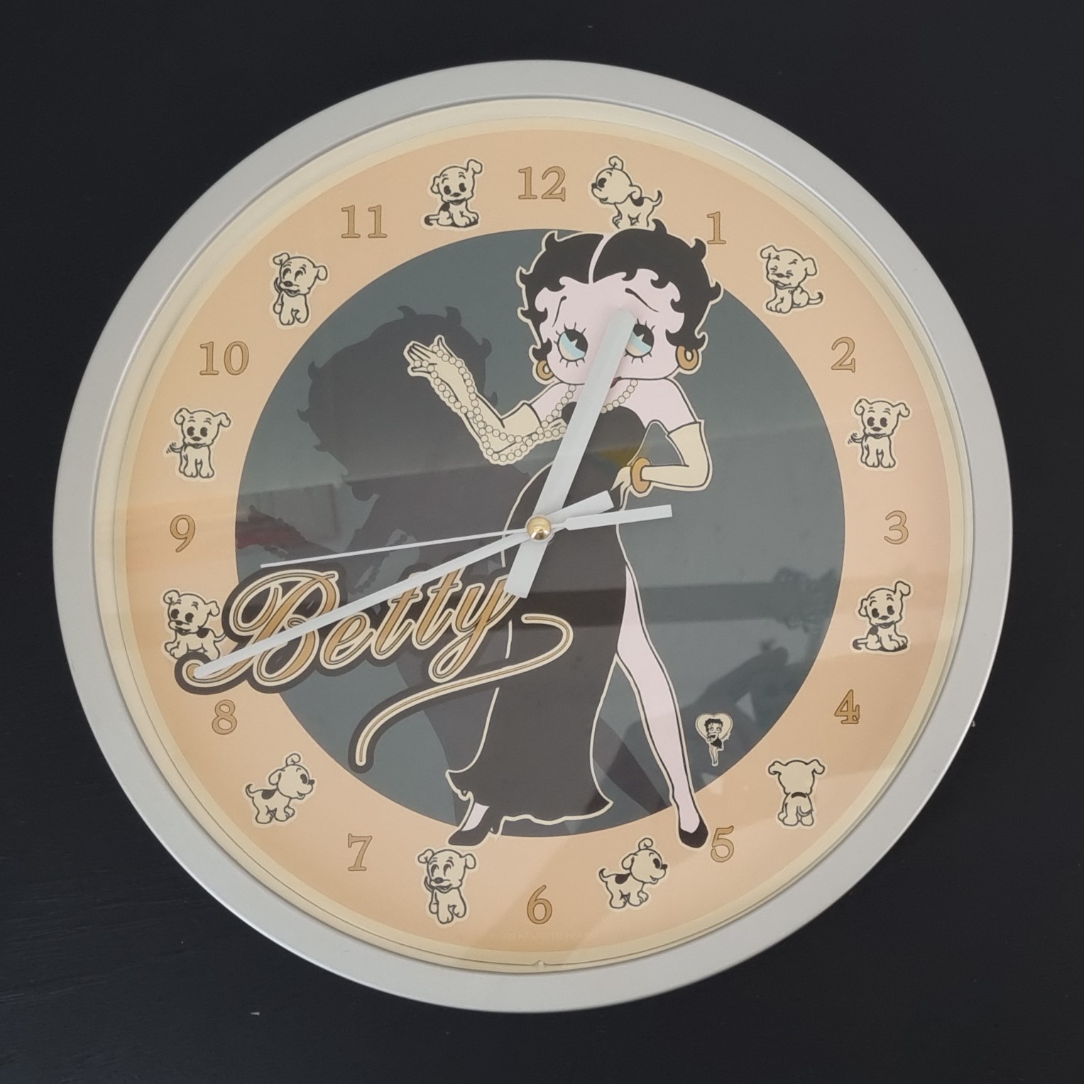 Vintage Betty Boop wall clock, crafted by Tropico Diffusion under King Features’ license. Part of Tropico Diffusion’s Avenue of the Stars collection. Dates back to 1999. Crafted from durable PVC, it remains in excellent condition. Add timeless elegance to your space with this stunning Betty Boop wall clock! Featuring Betty standing tall in a sophisticated black dress, adorned with a long pearl necklace, the design exudes vintage charm and class. Between the numbers, delightful images of Pudgy in various playful poses add a touch of whimsy to the piece. The perfect blend of functionality and artistic flair, this clock is a must-have for fans and collectors alike.