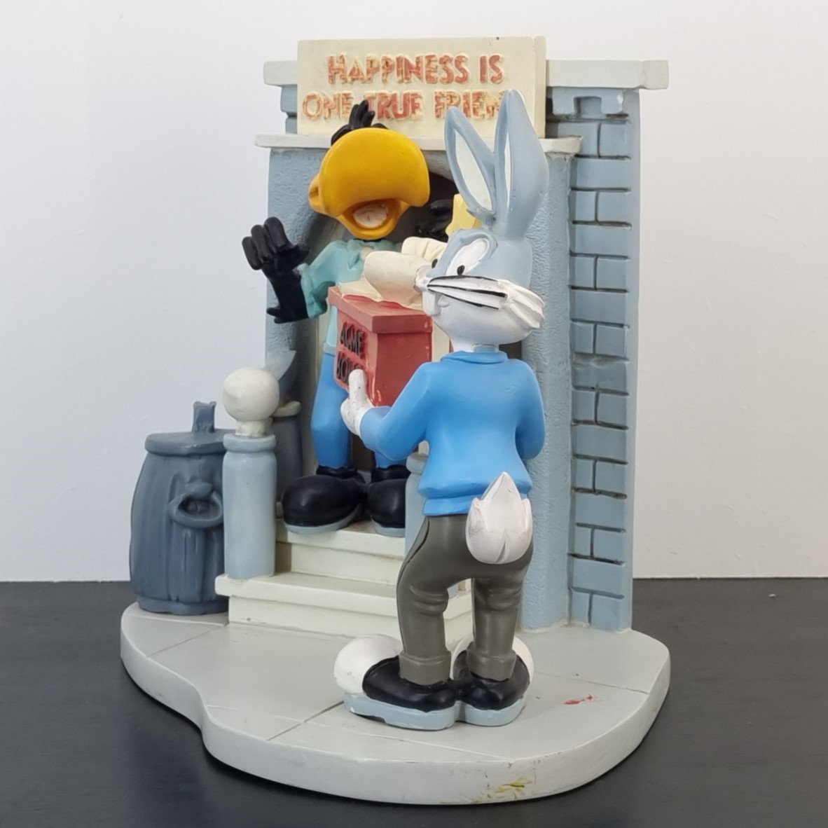 Vintage collectible statue of Bugs Bunny with Daffy Duck. Bugs Bunny is giving Daffy Duck a explosive gift. this collectible Looney Tunes statue was produced in the year 1994 exclusively for the Warner Bros Studio Store. The statue is named; Happiness Is One True Friend.