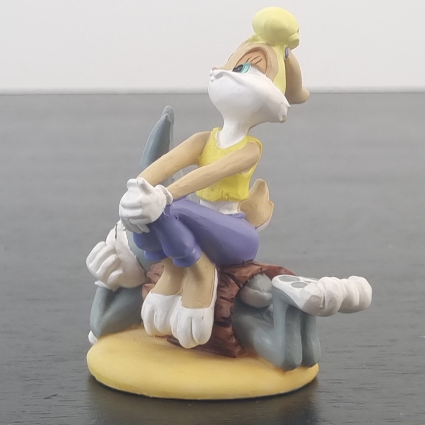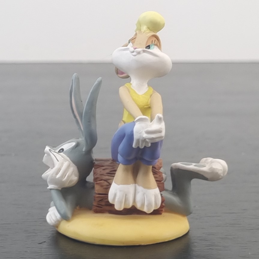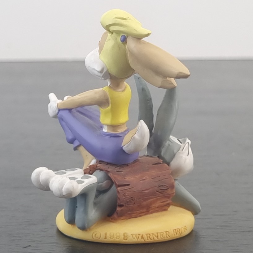 Very nice vintage figurine of Bugs Buny with Lola Bunny. Lola Bunny is sitting on a hollow tree trunk, where Bugs Bunny lies in this tree trunk.