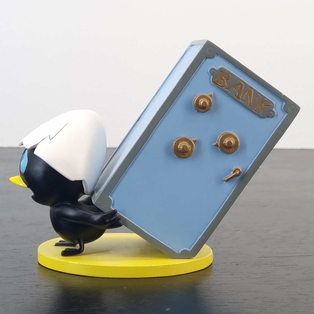 Vintage money box of Calimero, crafted by Tropico Diffusion under Pagot’s license. Part of Tropico Diffusion’s Avenue of the Stars collection. Dates back to 2003. Crafted from durable resin, it remains in excellent condition. Calimero is hauling the bank safe on his back like a determined little ant, but with every step, he looks more like a he is trying to carry an elephant uphill!