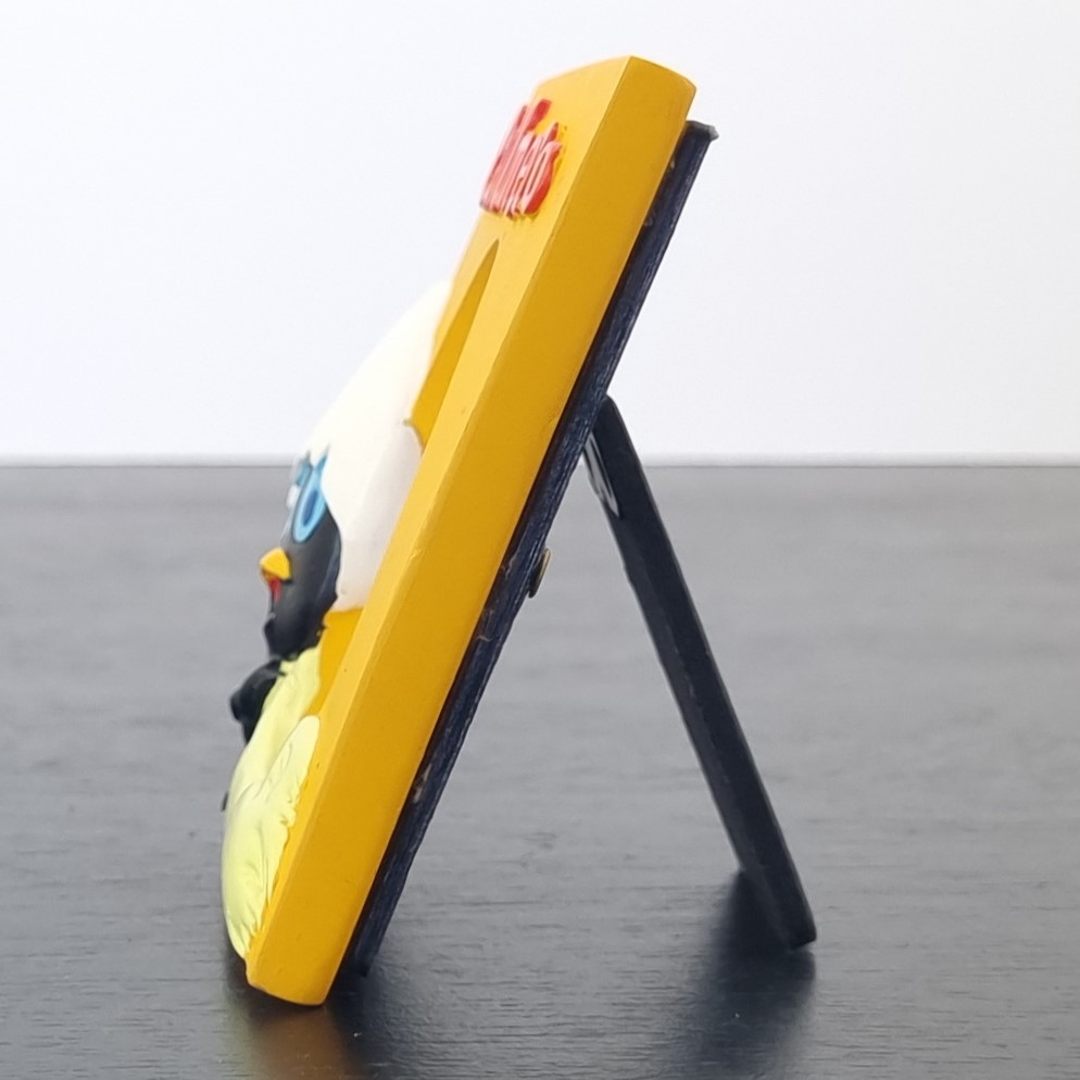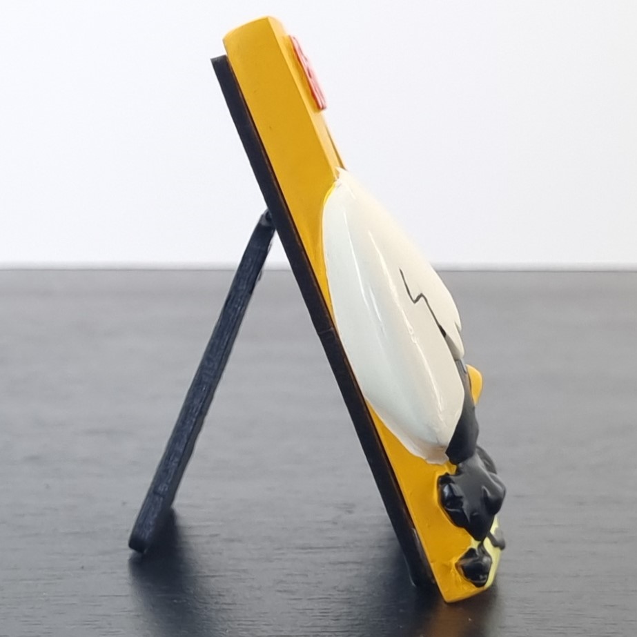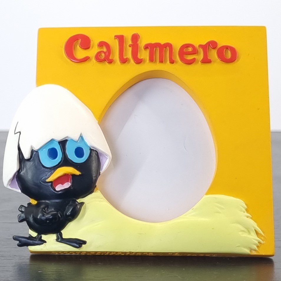 Vintage picture frame of Calimero, crafted by Tropico Diffusion under Pagot’s license. Part of Tropico Diffusion’s Avenue of the Stars collection. Dates back to the 1990s. Crafted from durable resin, it remains in excellent condition. Bring a burst of charm to your space with this playful orange Calimero picture frame! Calimero stands proudly beside a nest, where the “egg” at the center is actually the perfect spot for your favorite photo. Above it all, his name pops in bold red letters, adding a touch of classic character flair. It’s a fun and creative way to frame your memories. Ideal for fans of retro cartoons or anyone who loves a unique display!