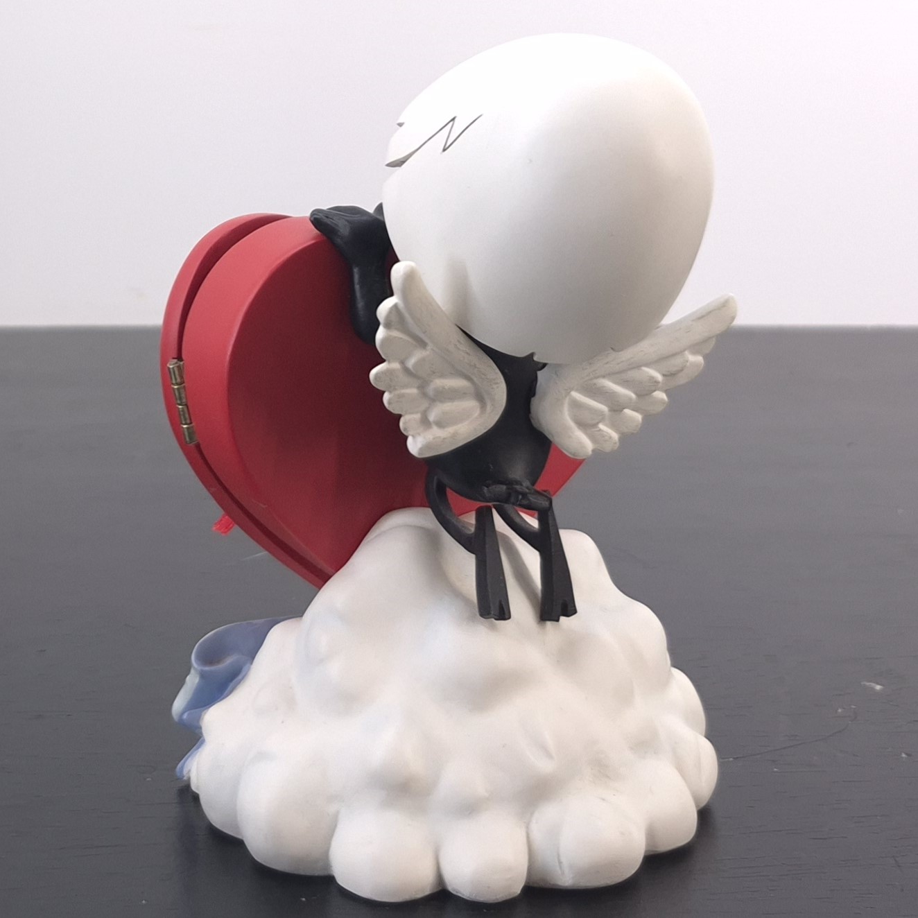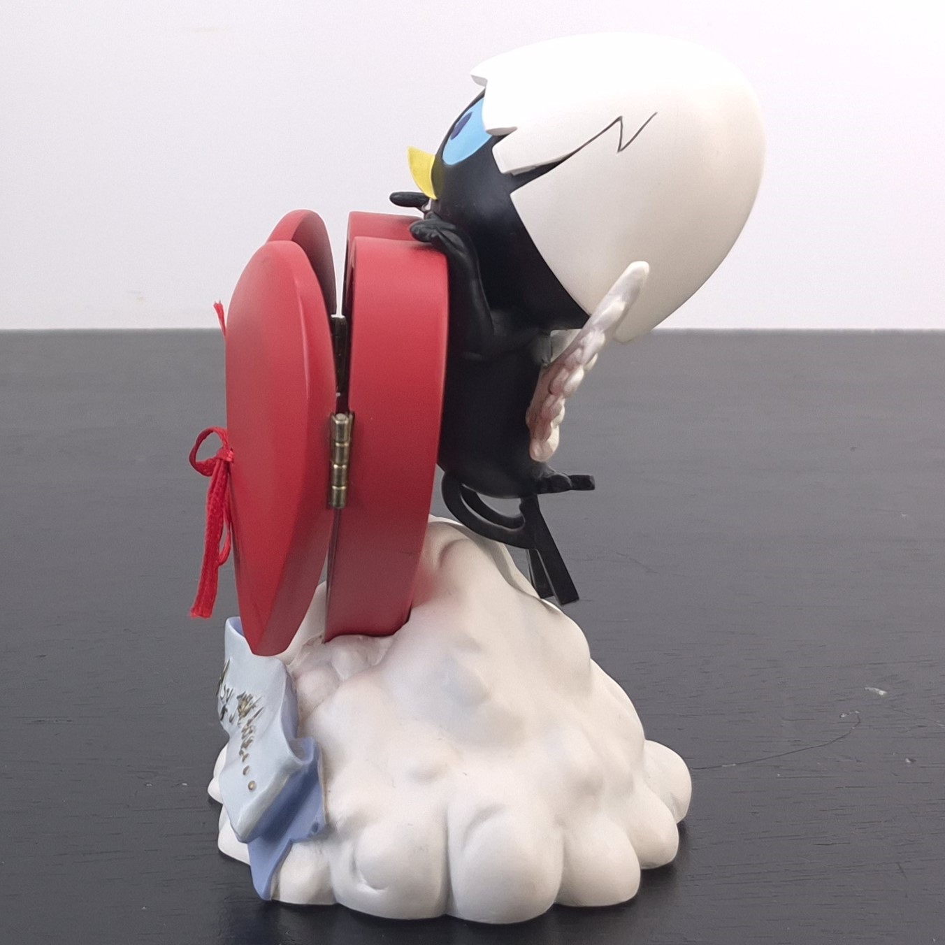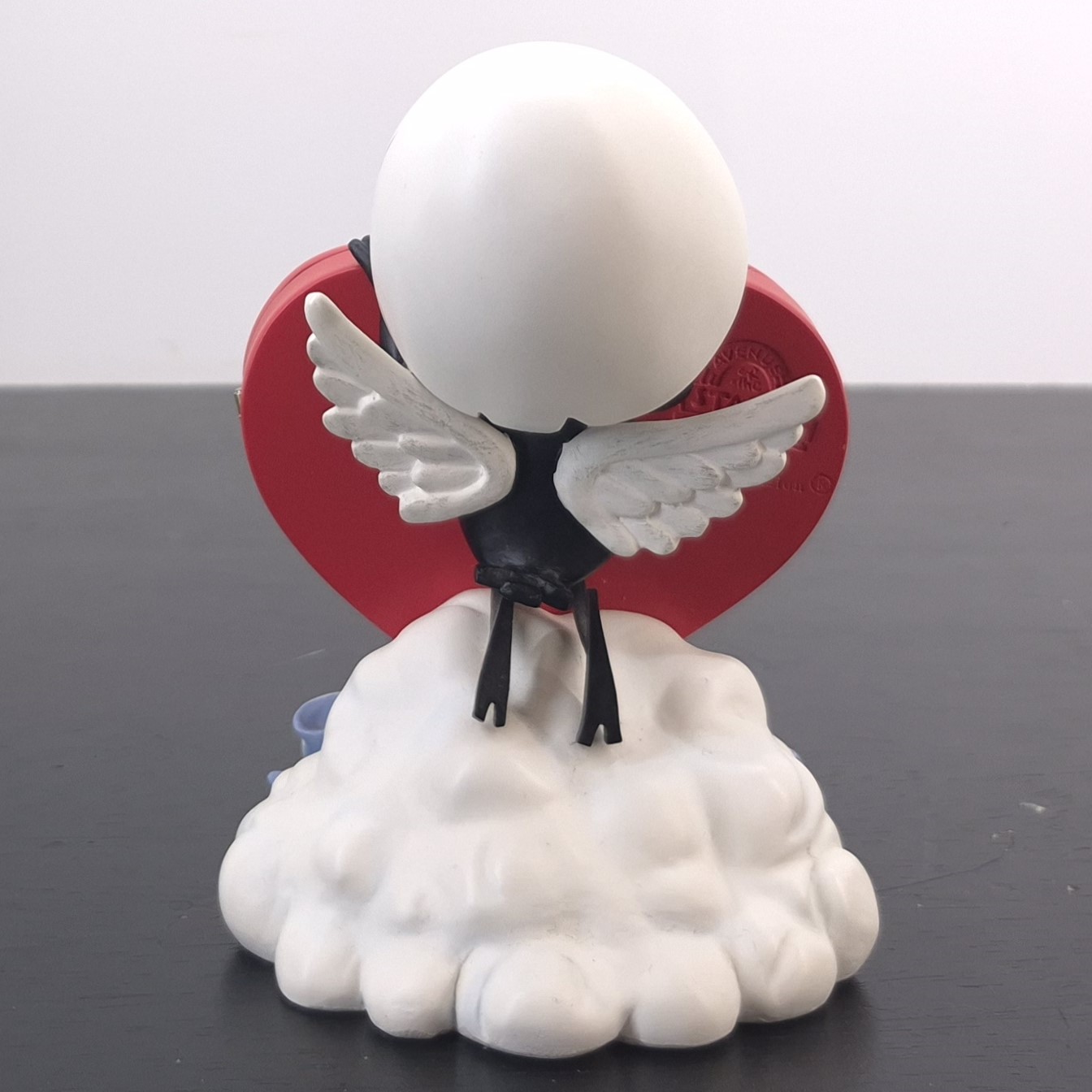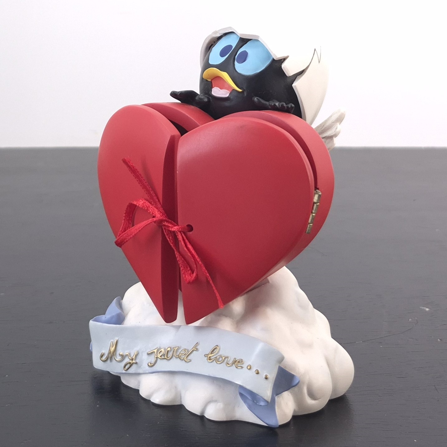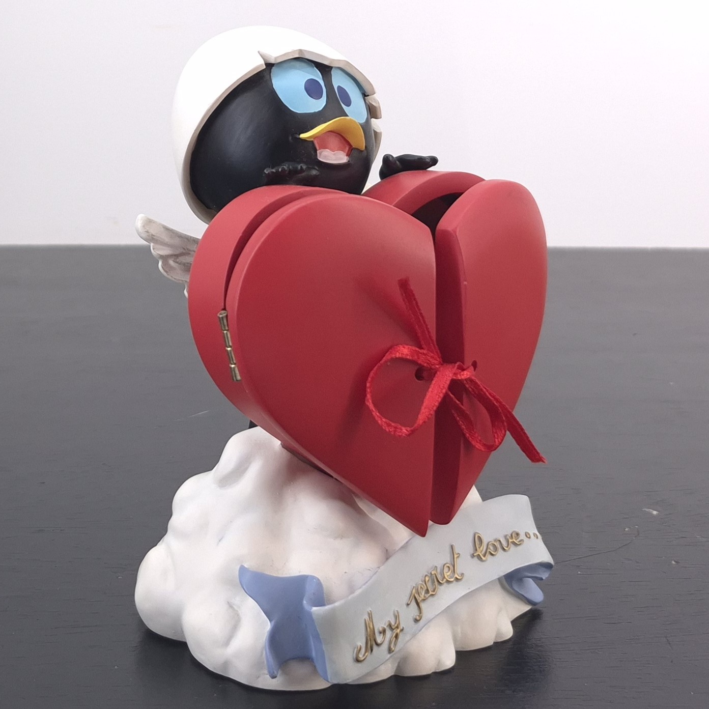 Vintage picture frame of Calimero holding a heart, crafted by Tropico Diffusion under Pagot’s license. Part of Tropico Diffusion’s Avenue of the Stars collection. Dates back to the 1990s. Crafted from durable resin, it remains in excellent condition. Bring a touch of sweetness to your home with this Calimero angel photo frame. Dressed as a little angel, Calimero holds a red heart that opens to reveal space for your cherished photo. The heart rests gently on fluffy white clouds, creating a dreamy and romantic design. Perfect for Valentine’s Day, anniversaries, or as a heartfelt gift for someone special. A unique keepsake that blends nostalgia, love, and charm in one delightful piece.