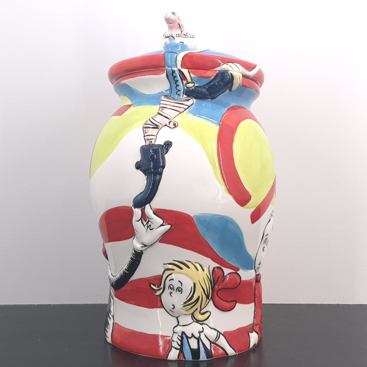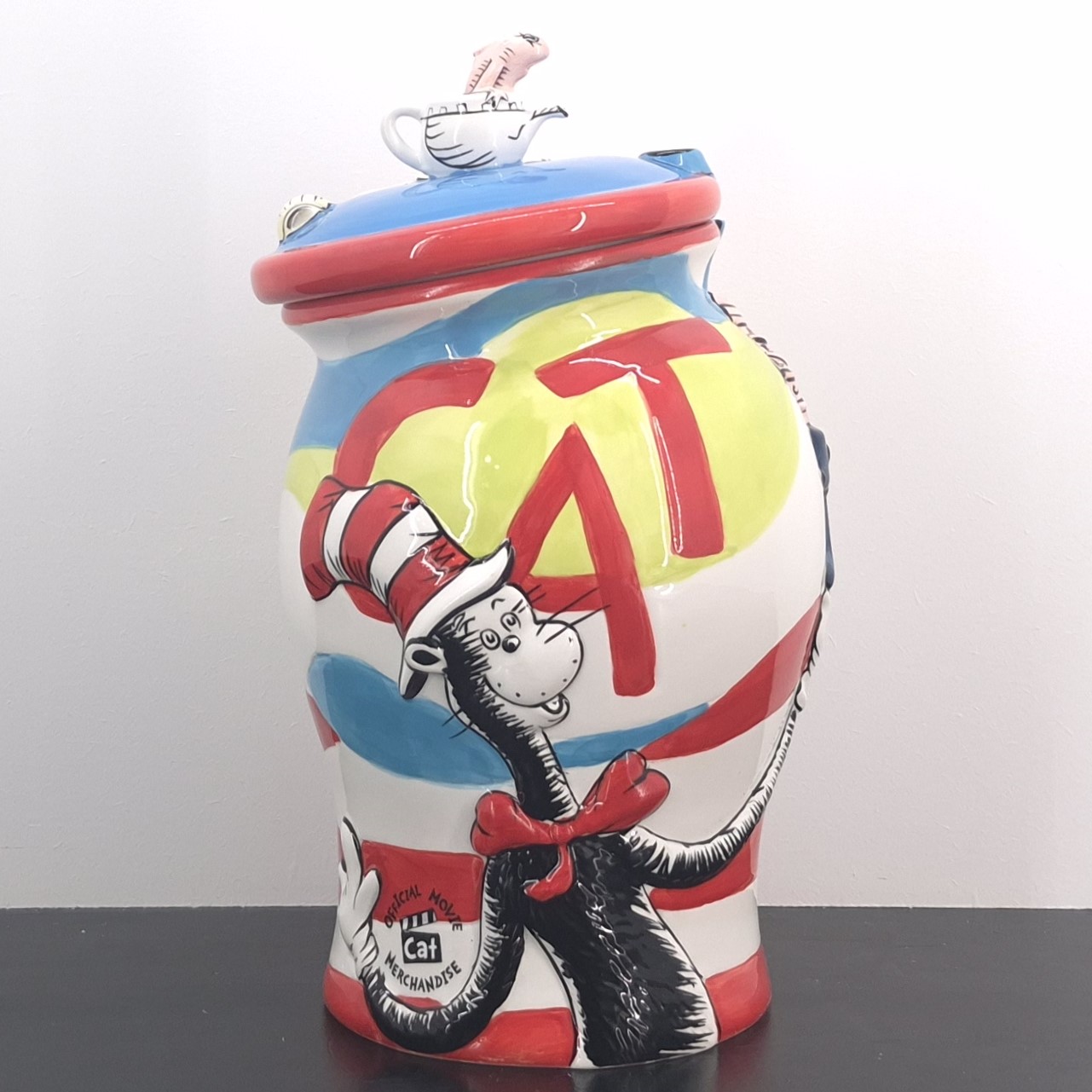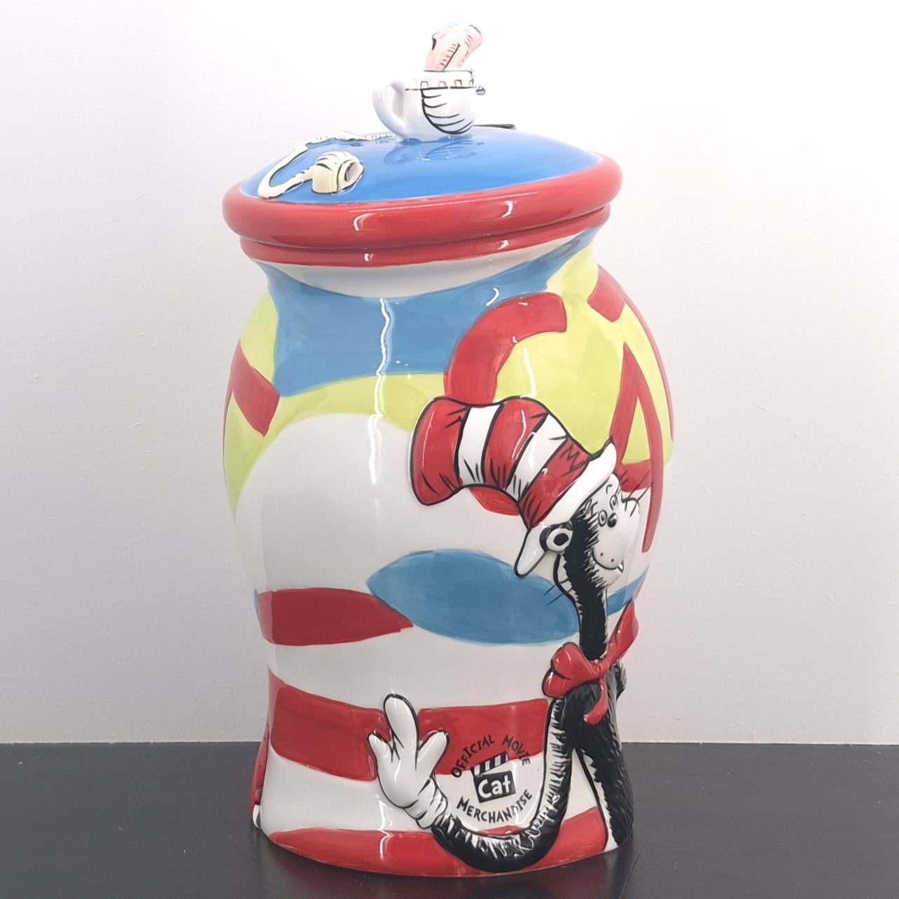 Vintage cookie jar of the The Cat in the Hat, crafted under Universal Studios and Dreamworks LLC’s license. Dates back to 2003. Crafted from durable ceramic, it remains in excellent condition. Add a whimsical touch to your kitchen with the Cat in the Hat Cookie Jar! Topped with a playful fish in a cup on the lid, this jar combines charm and functionality. It’s perfect for keeping your cookies fresh and delighting Dr. Seuss fans of all ages! A fun centerpiece for any countertop.