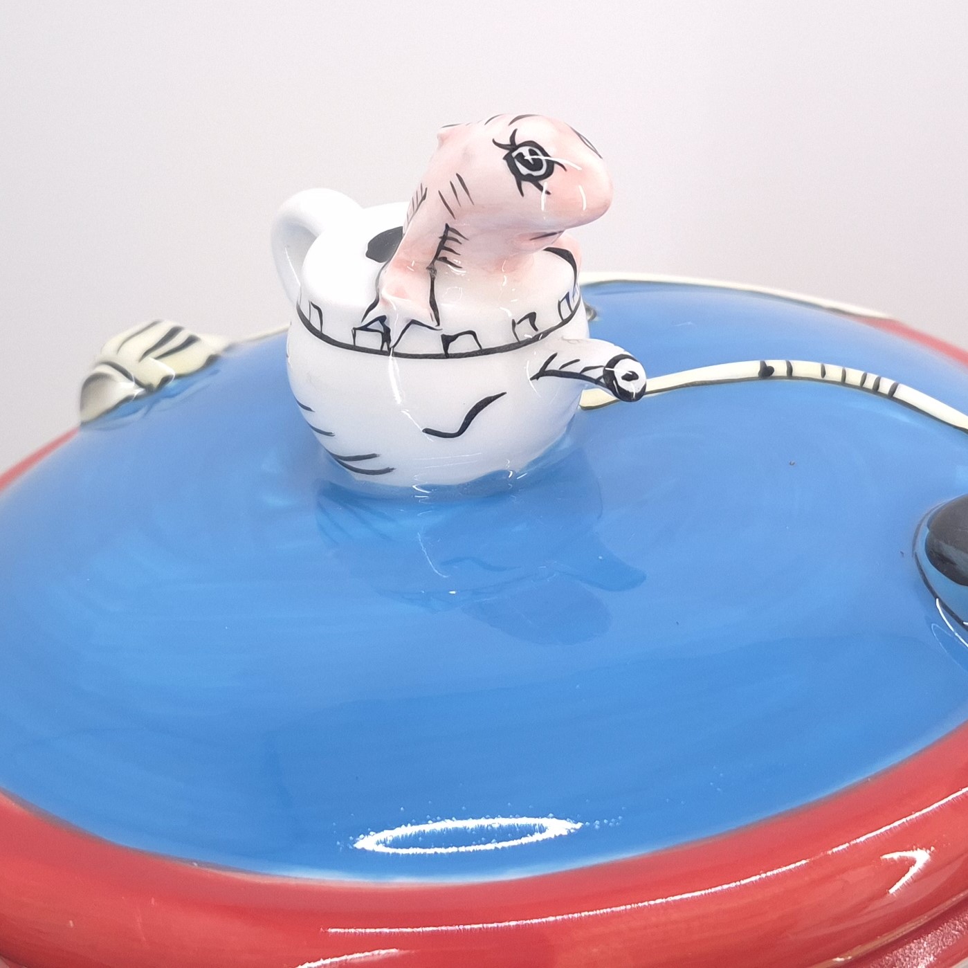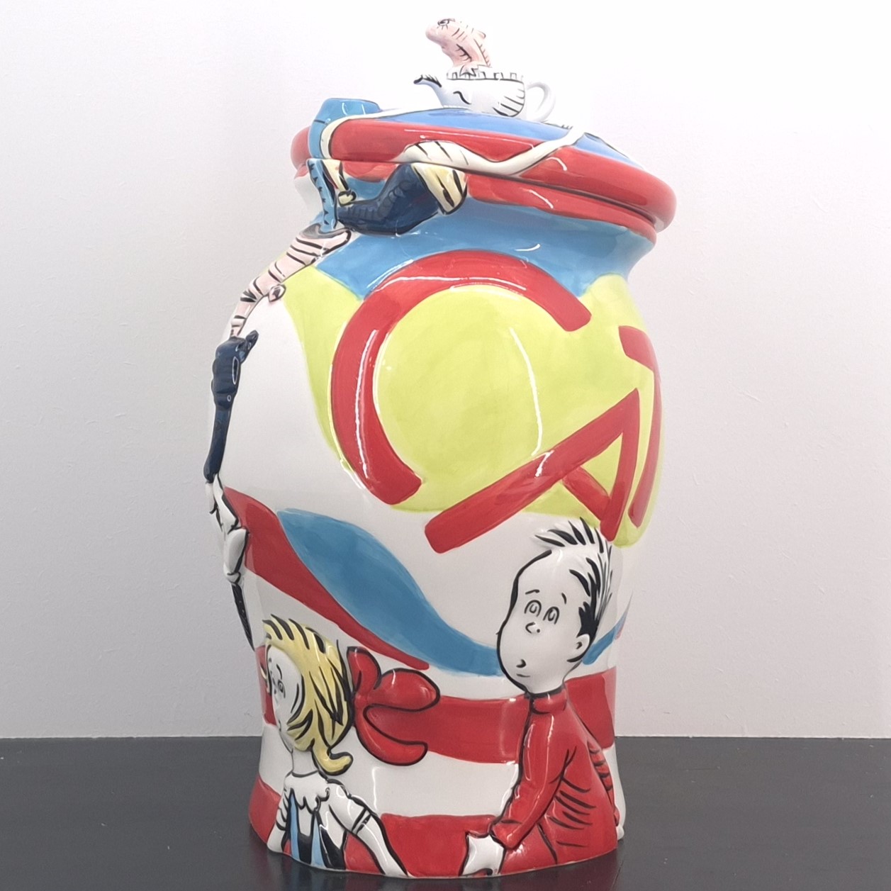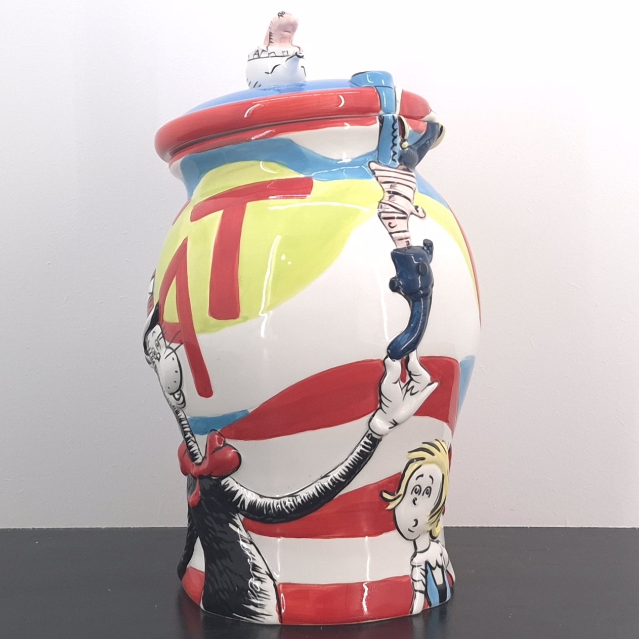 Vintage cookie jar of the The Cat in the Hat, crafted under Universal Studios and Dreamworks LLC’s license. Dates back to 2003. Crafted from durable ceramic, it remains in excellent condition. Add a whimsical touch to your kitchen with the Cat in the Hat Cookie Jar! Topped with a playful fish in a cup on the lid, this jar combines charm and functionality. It’s perfect for keeping your cookies fresh and delighting Dr. Seuss fans of all ages! A fun centerpiece for any countertop.