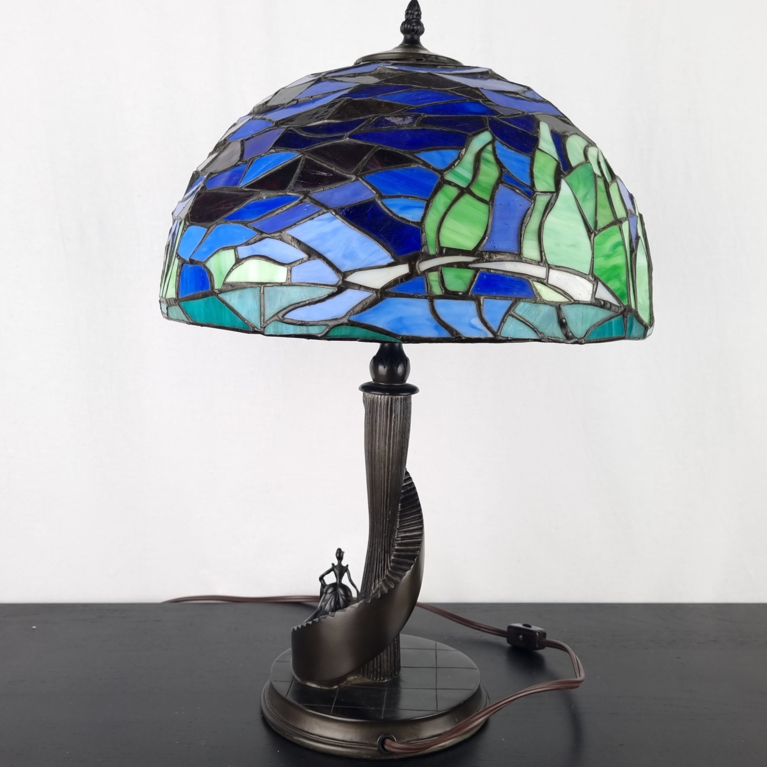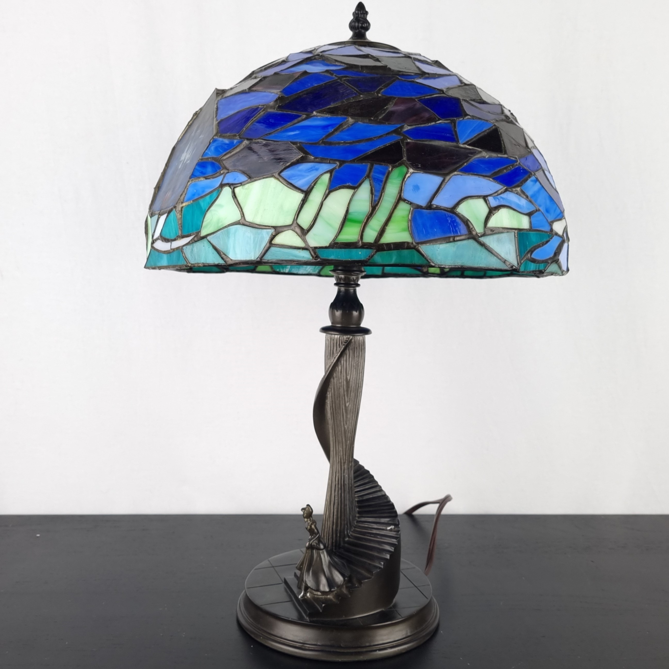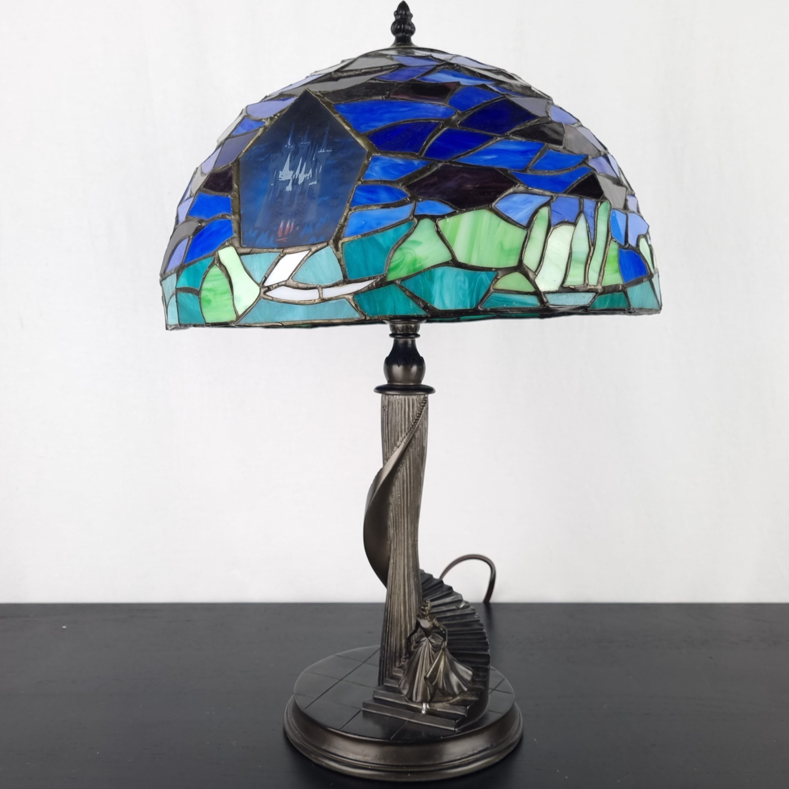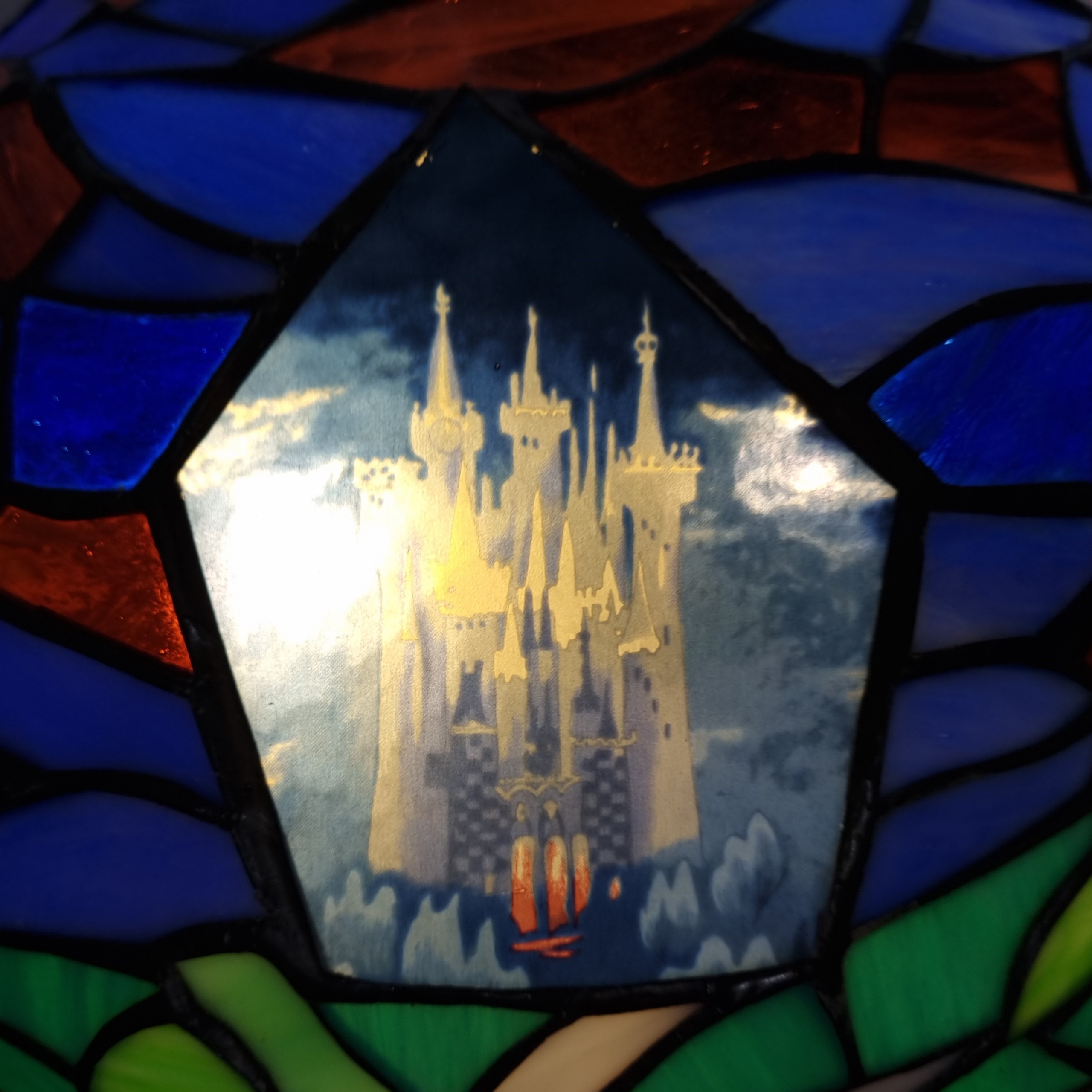 This unique lamp from Cinderella was sculpted by Kevin and Jody under Walt Disney’s license. Dates back to 2003. Made from durable Lead and glass, it remains in excellent condition. Illuminate your home with the enchanting Cinderella Stained Glass Lamp, where every detail tells a story. Witness Cinderella in her magical moment, descending the stairs as her glass slipper leaves her foot, poised in timeless grace. At the heart of the lamp, the castle glows, a beacon of dreams and fairy tales. And with the flick of a switch, Cinderella’s carriage appears, ready to whisk you away to a world of wonder. This lamp isn’t just lighting; it’s a portal to the beloved tale, casting a spell of charm and elegance in your space.