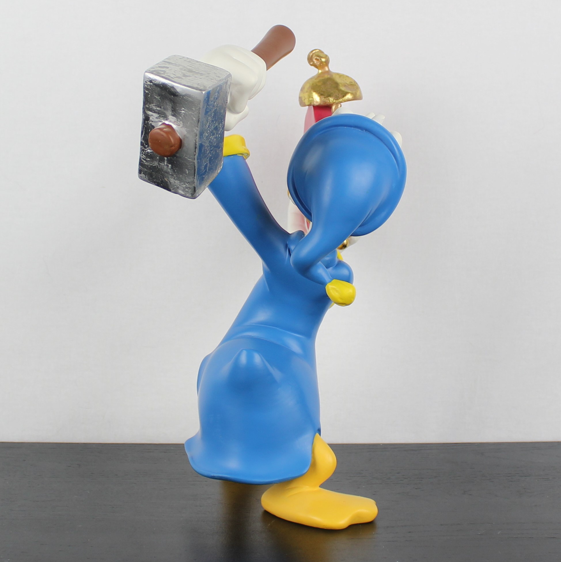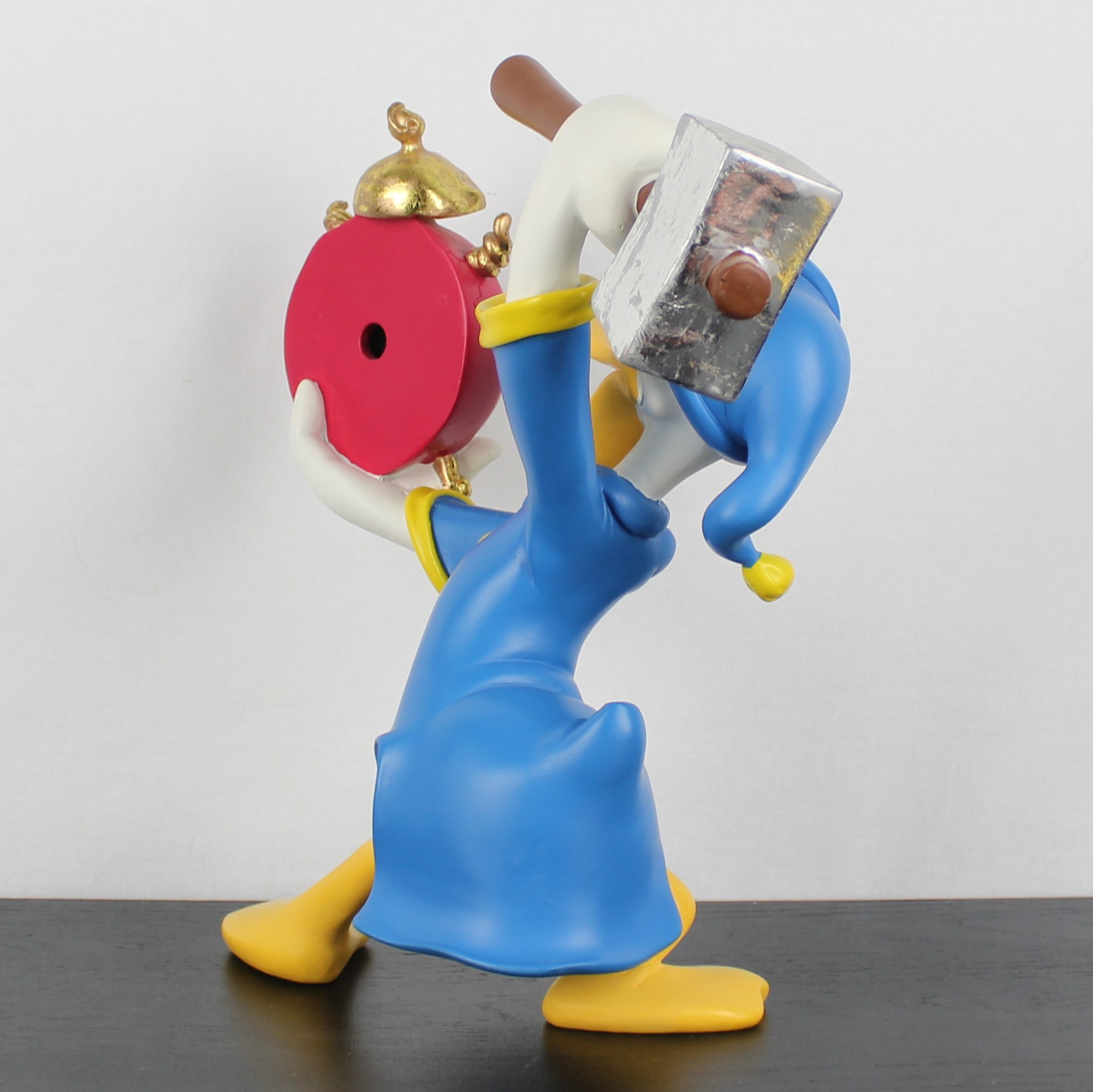 This vintage statue from Donald Duck was sculpted by Peter Mook under Walt Disney’s license. It was taken in production by Rutten. Dates back to the 1990s. Crafted from durable resin, it remains in excellent condition. Bring some humor to your collection with this hilarious statue of Donald Duck in his pajamas, clutching a big hammer and his alarm clock. Capturing Donald’s signature angry expression, this piece perfectly showcases his frustration with those early morning wake-ups. Plus, the clock really works! Perfect for any fan, it adds a touch of classic Disney charm and fun to your space!