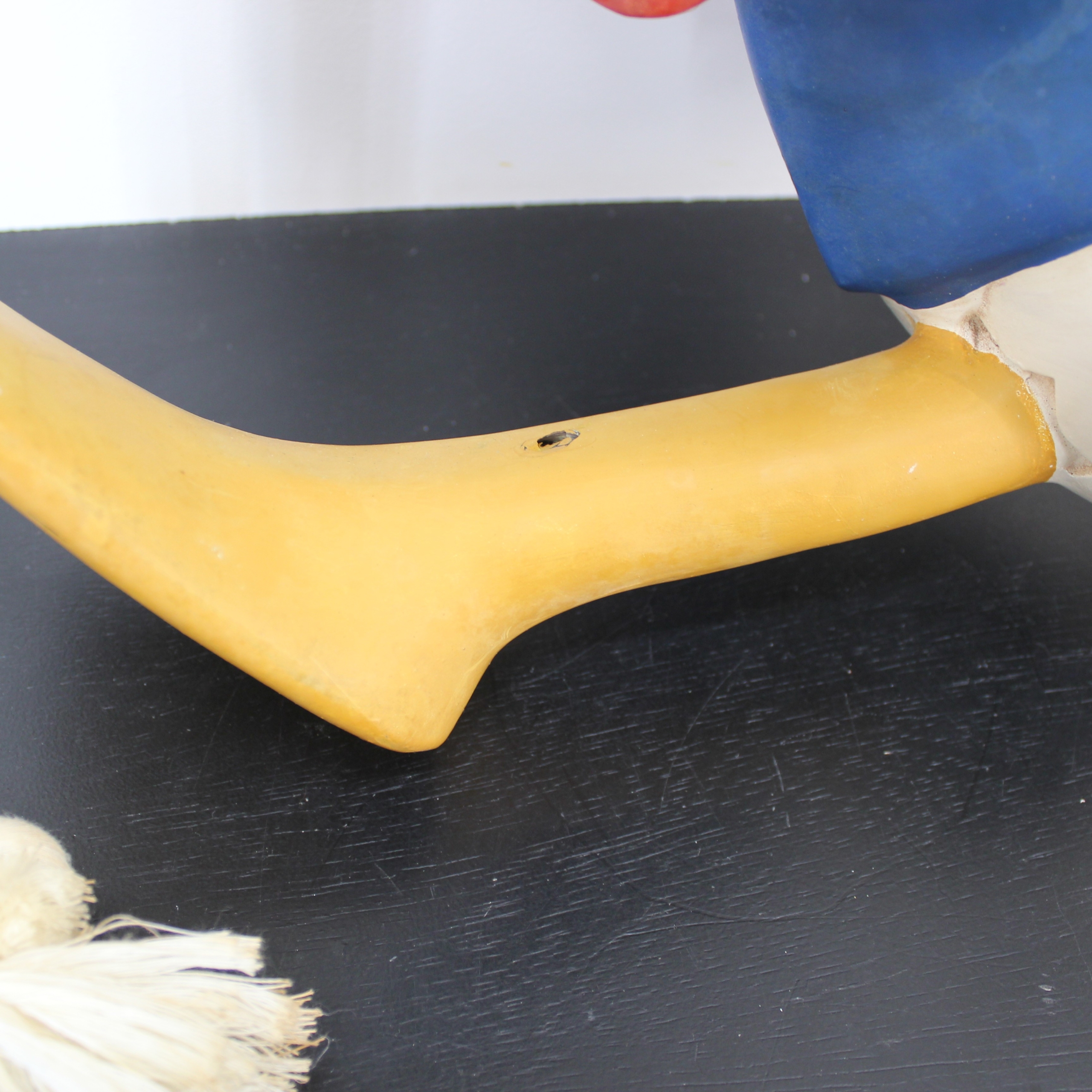 This big fig from Donald Duck Duck was produced by Walt Disney. Dates back to the late 1980s, early 1990s. Crafted from durable polyester, it remains in good condition. Shows some wear. Introducing a whimsical statue of Donald Duck hanging from a rope! Crafted with attention to detail, this playful piece is designed to be hung from the ceiling, with Donald’s feet against the wall, giving the illusion that he is climbing. Made from durable materials, it captures Donald’s adventurous spirit and adds a unique touch to any room. Bring home this delightful statue and watch as it brings a smile to everyone’s face!