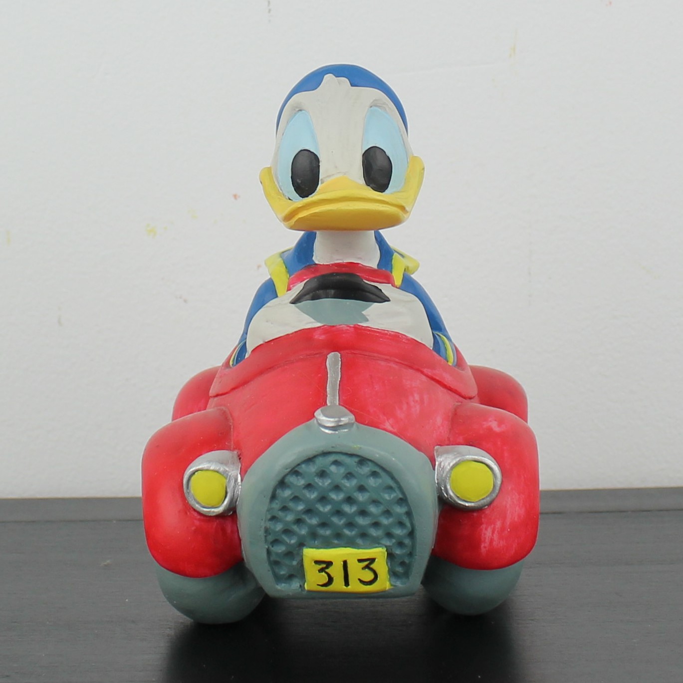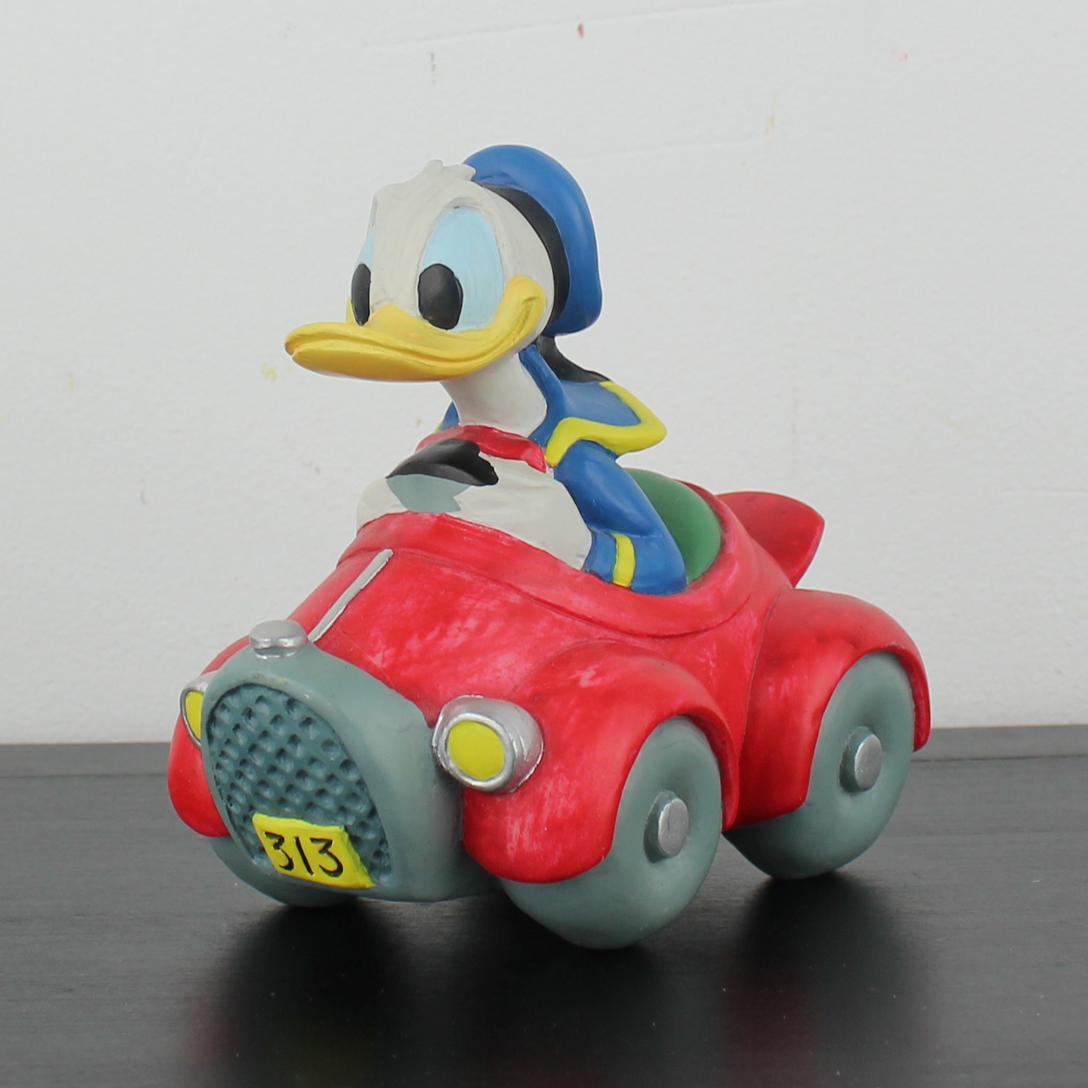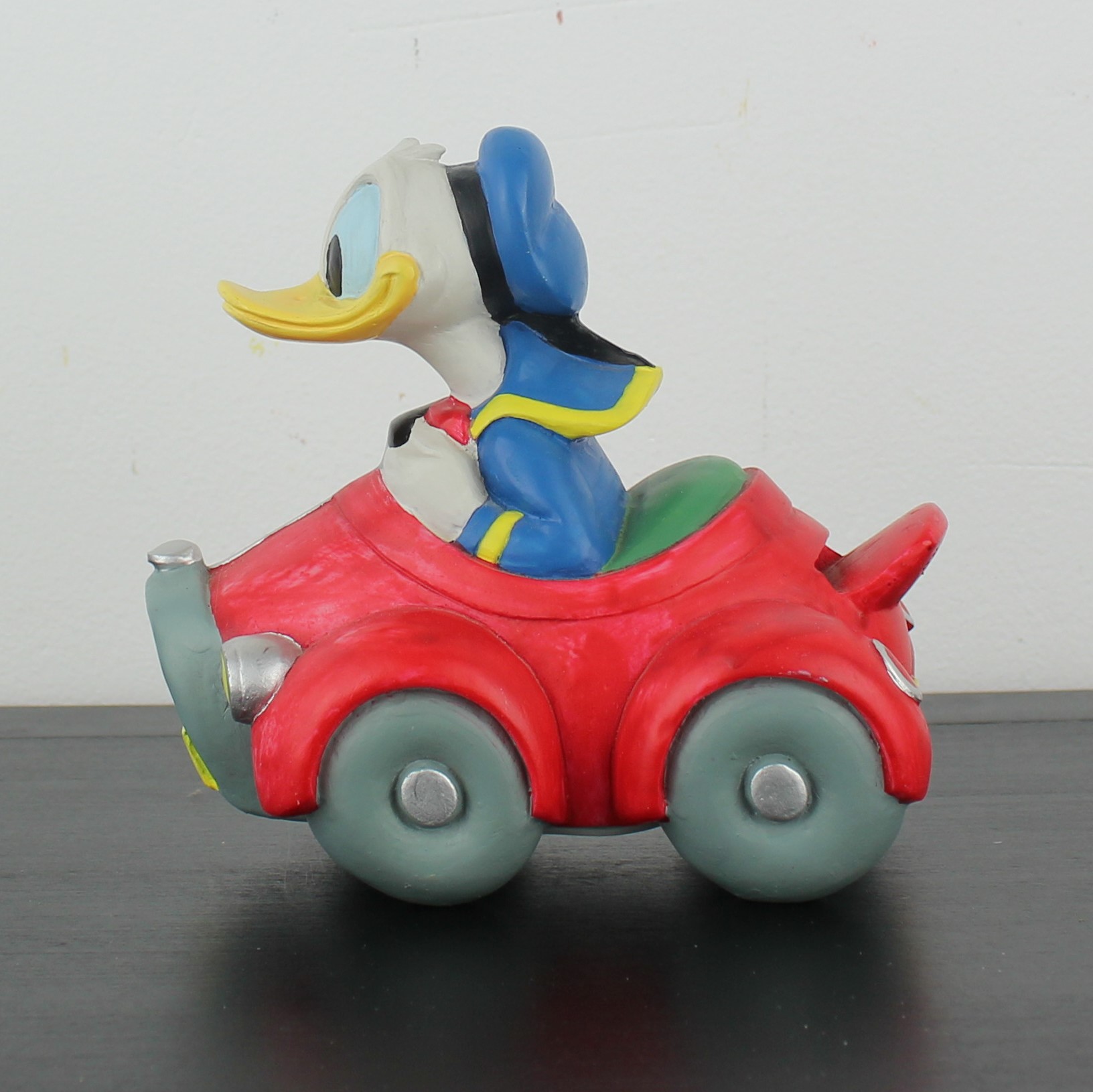 This vintage money box from Donald Duck was taken in production by Enesco under Walt Disney’s license. Part of the many emotions of Donald Duck collection. Dates back to the 1990s. Made from durable ceramic, it remains in excellent condition. Introducing a dynamic figurine of Donald Duck racing in his iconic red car, doubling as a charming money box! This piece captures the thrill and excitement of Donald behind the wheel, with vibrant details and a playful design. Perfect for fans and collectors, it combines functionality with fun, providing a stylish way to save your coins. Add this unique Donald Duck figurine to your collection and watch your savings race to new heights!