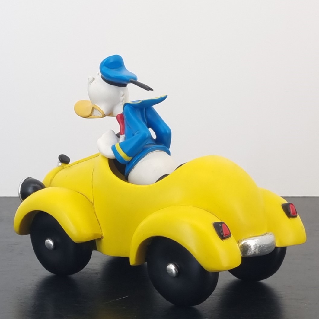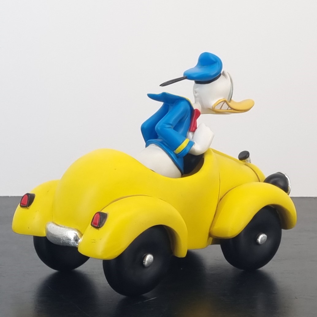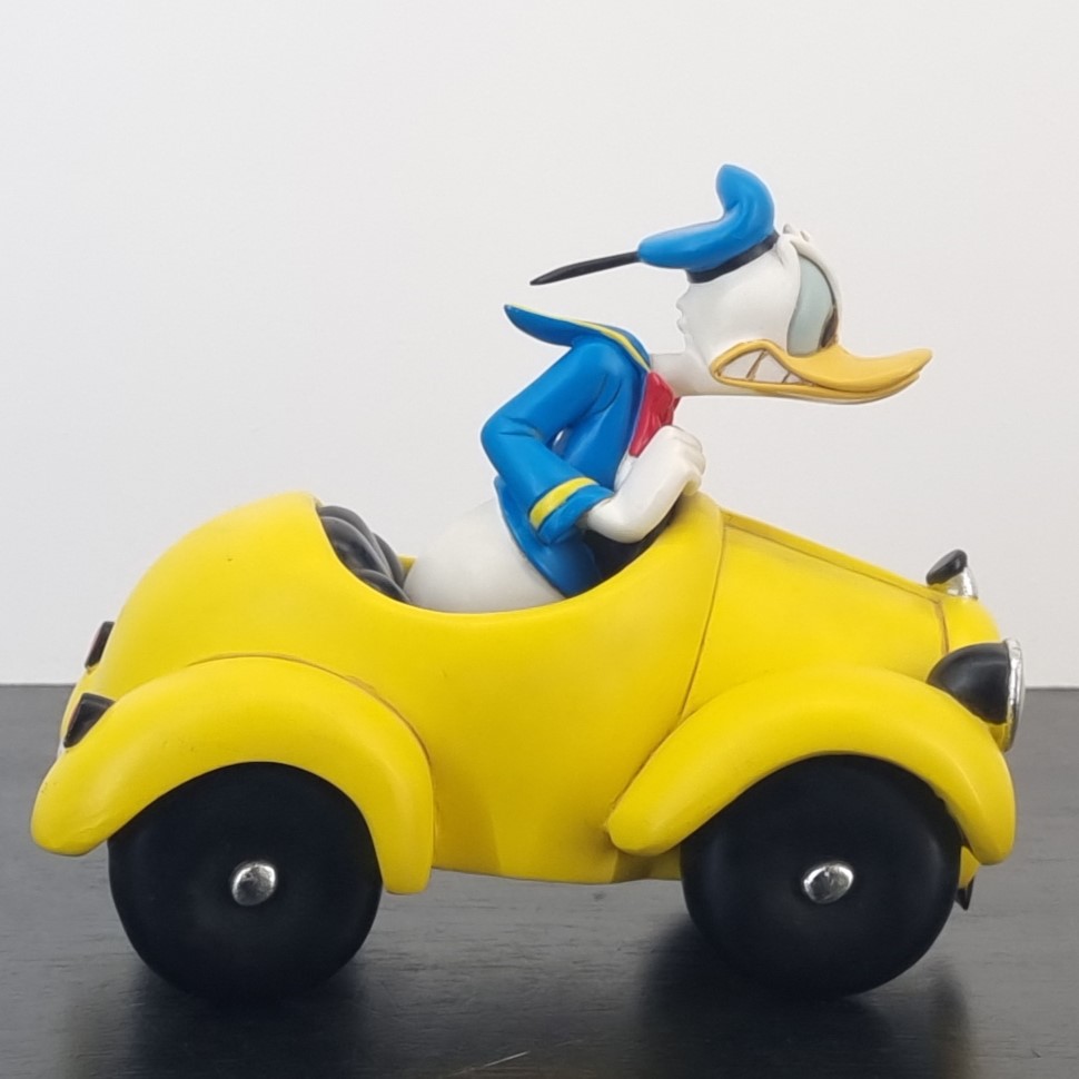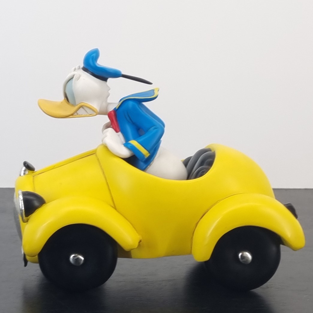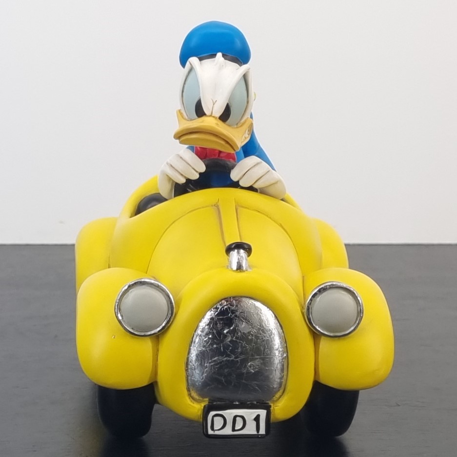 This vintage statue from Donald Duck racing was sculpted by Peter Mook under Walt Disney’s license. It was taken in production by Rutten. Dates back to the 1990s. Crafted from durable resin, it remains in excellent condition. Experience the excitement with this dynamic statue of Donald Duck racing in his bright yellow car, license plate DD1. Capturing his classic angry expression and fiery determination, this piece is perfect for any Disney fan. Bring home the energy and thrill of Donald Duck at full throttle, ready to rev up your collection!