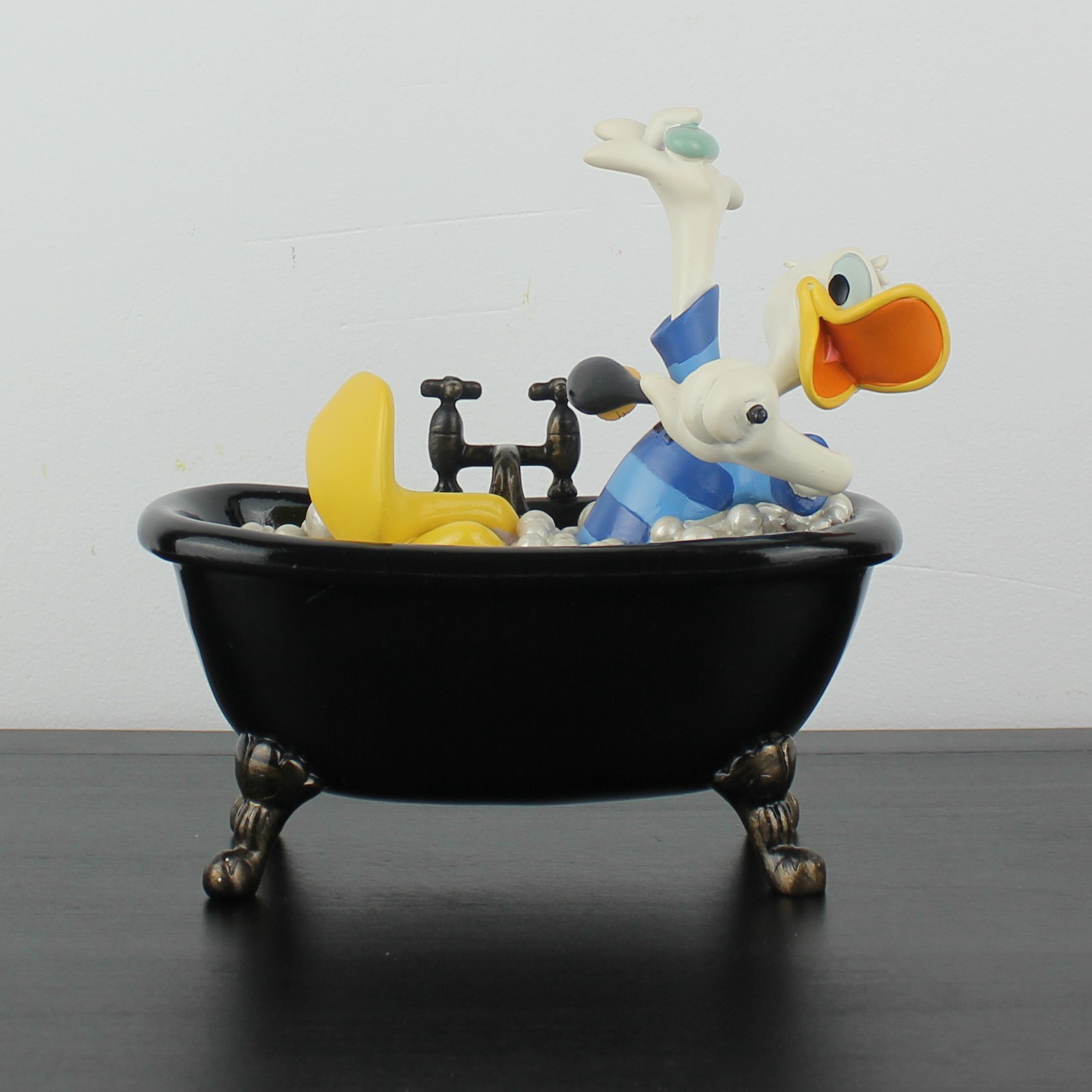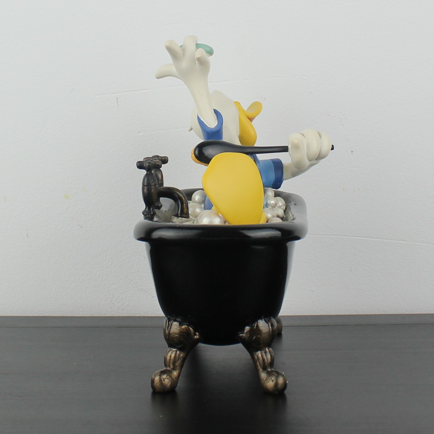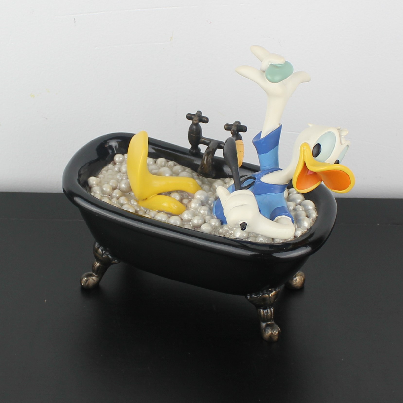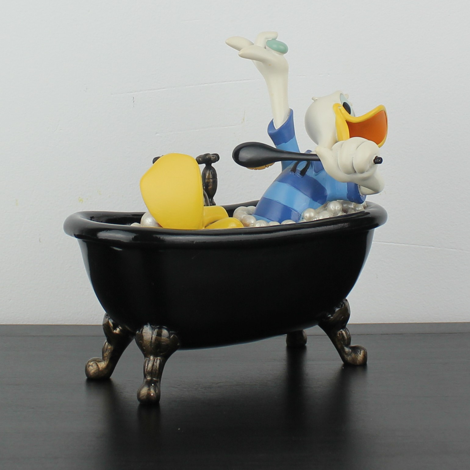 This statue from Donald Duck taking a bath was sculpted by Peter Mook under Walt Disney’s license. It was taken in production by Rutten. Dates back to the 1990s. Crafted from durable resin, it remains in excellent condition. Dive into fun with this adorable statue of Donald Duck taking a bath! Perfect for any Disney fan, this piece captures Donald’s playful and relaxed side as he enjoys a bubbly soak. Add a touch of whimsy and classic Disney charm to your collection with this delightful statue!