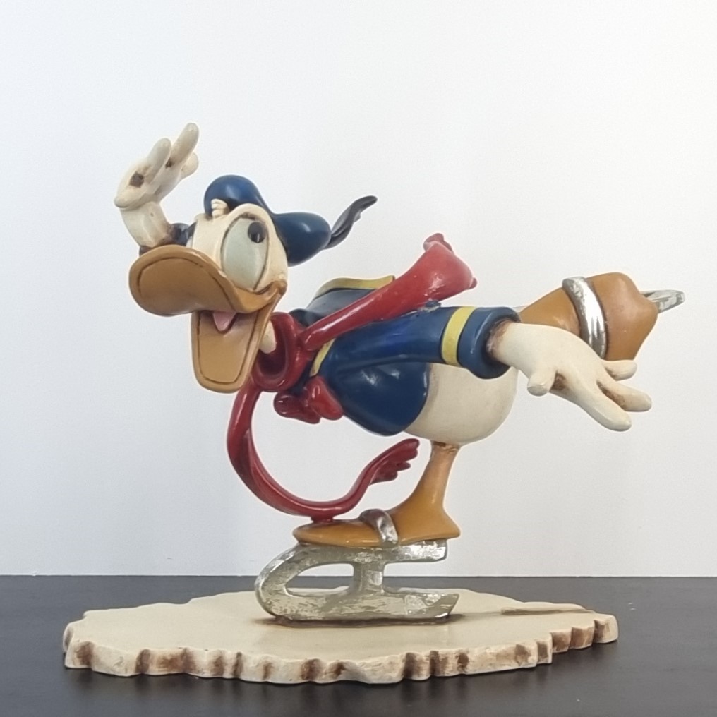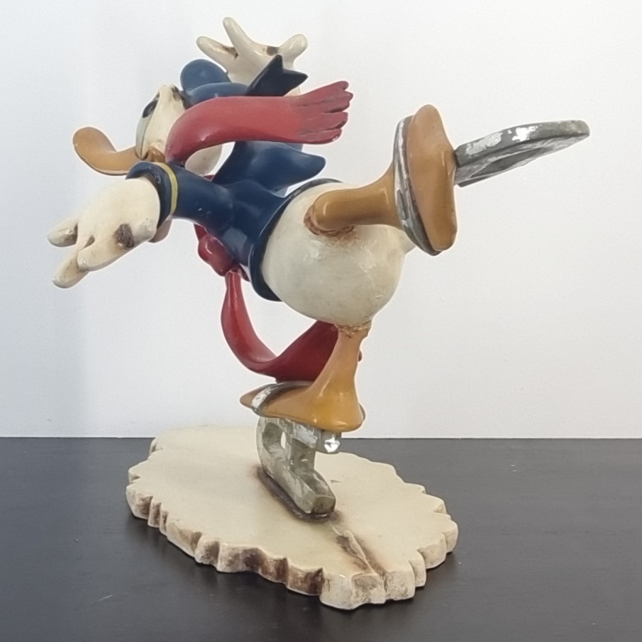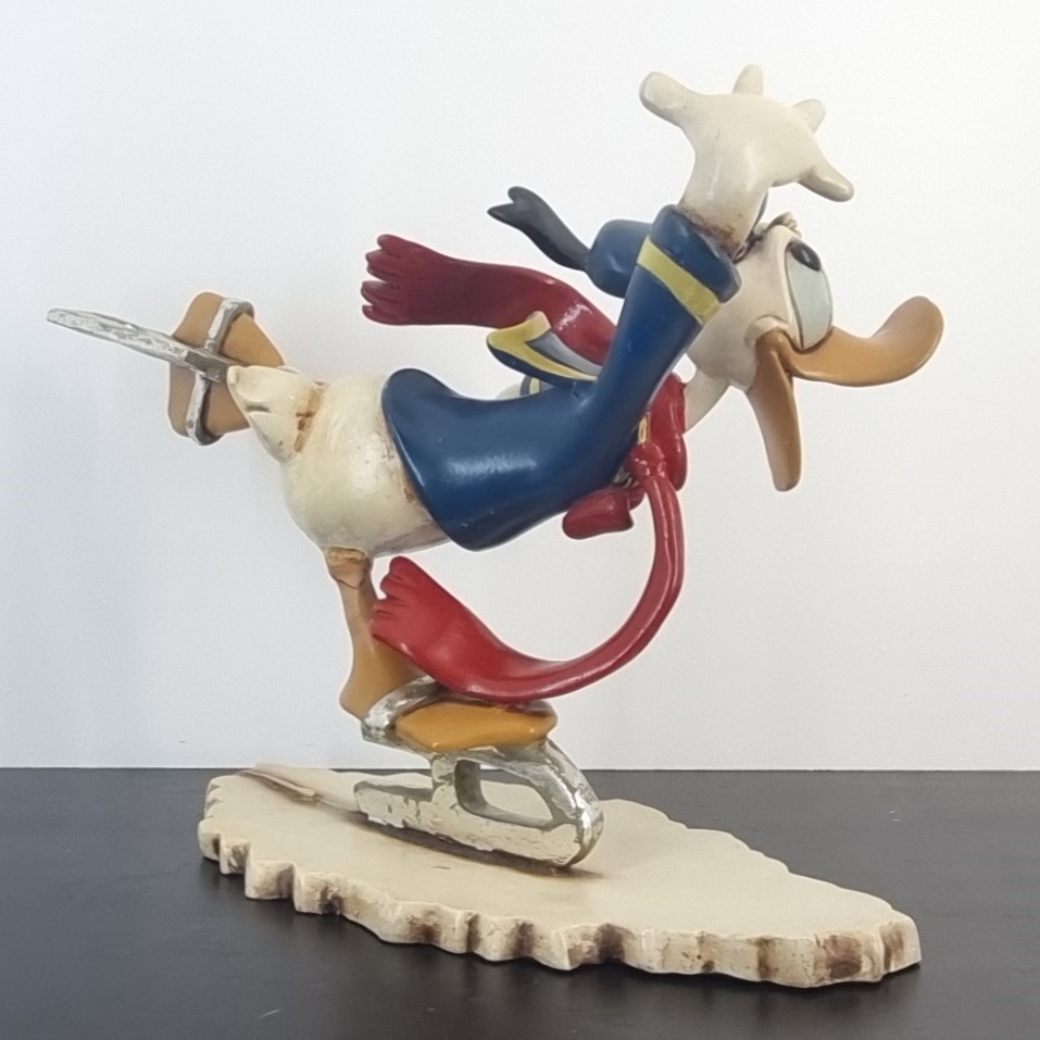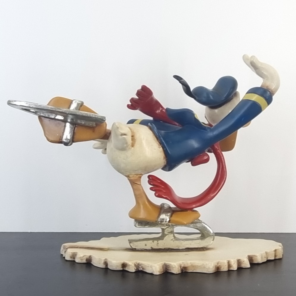Vintage statue featuring Donald Duck ice skating, produced by Walt Disney.
