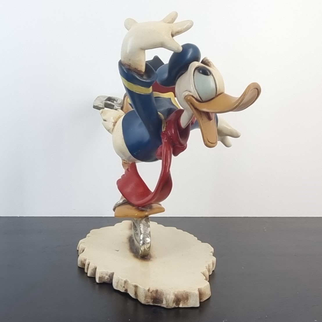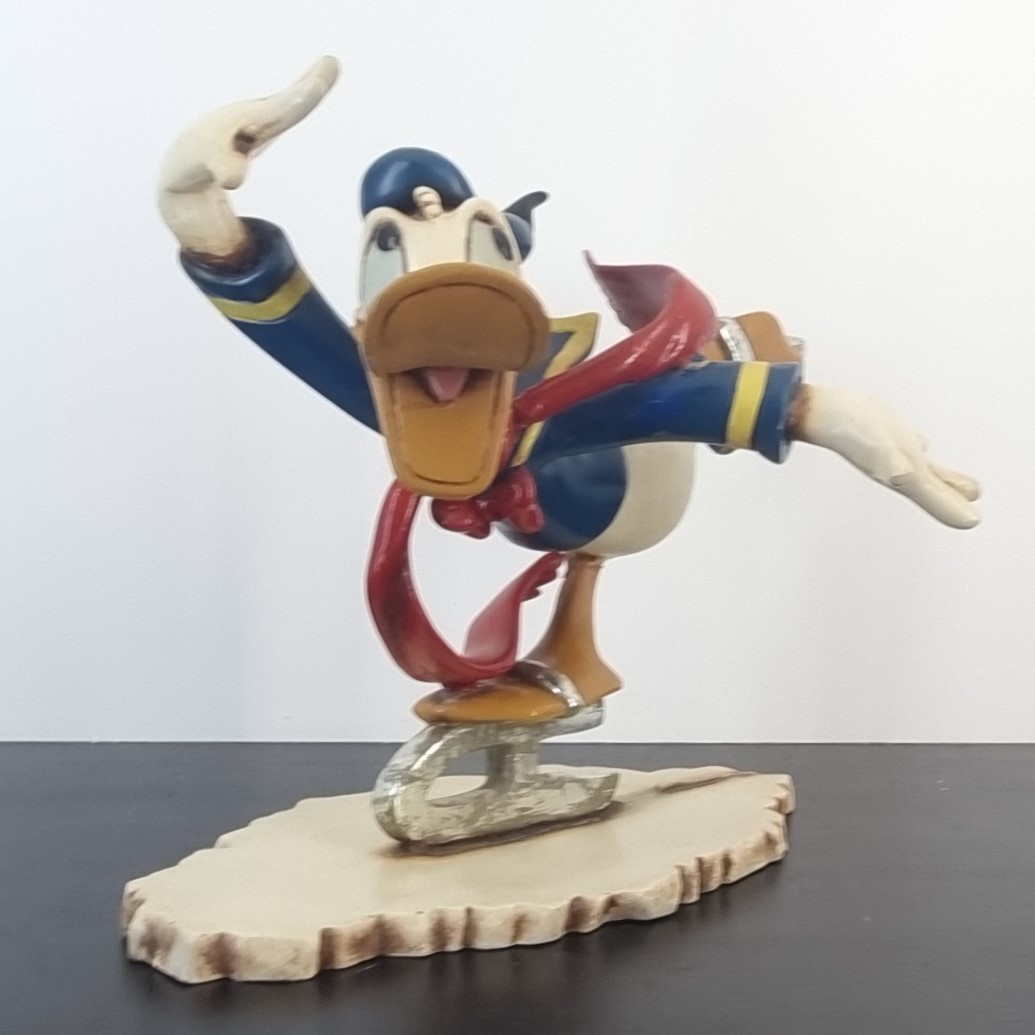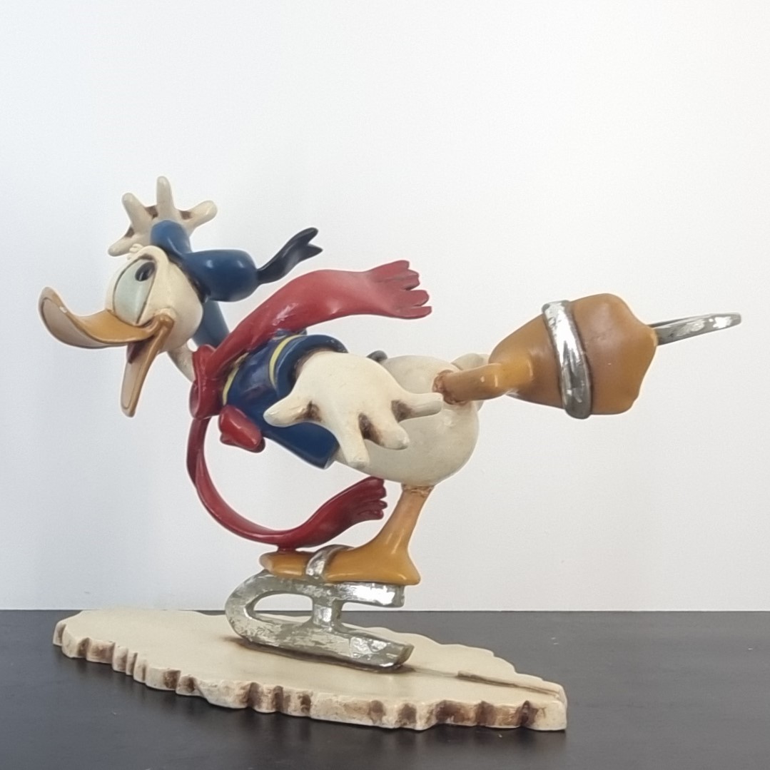 Vintage statue featuring Donald Duck ice skating, produced by Walt Disney.