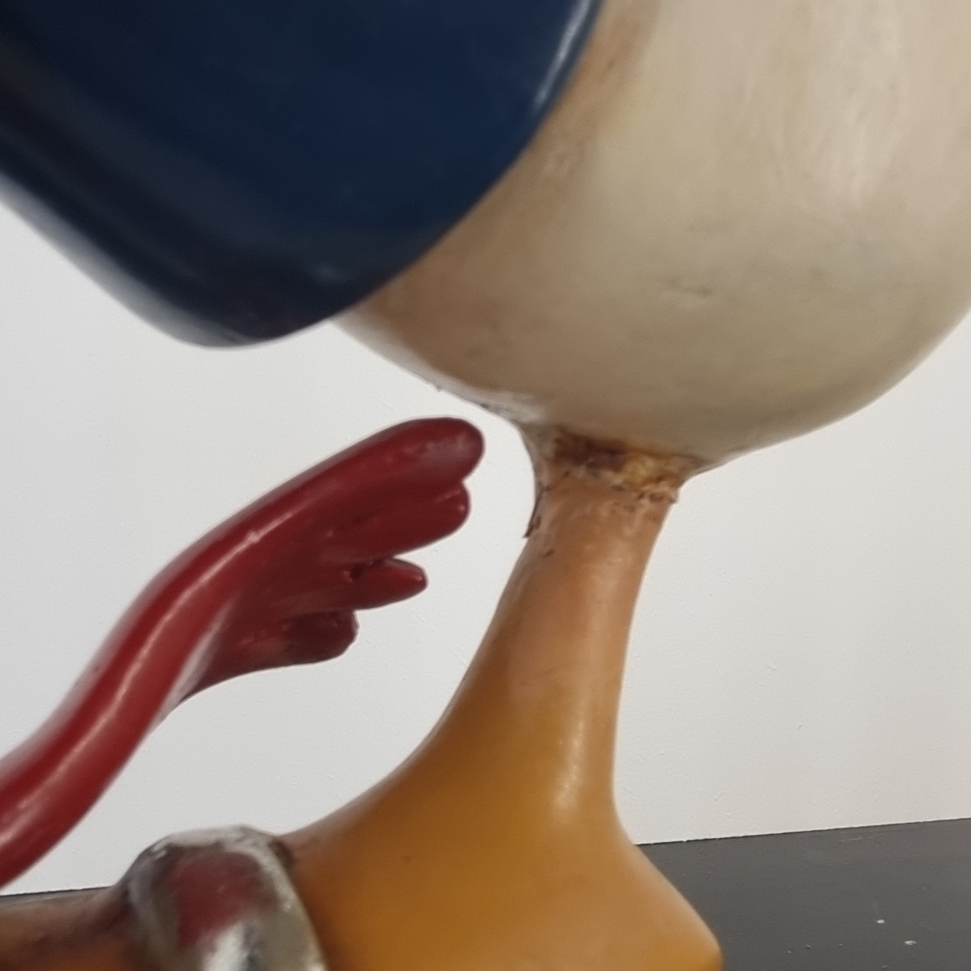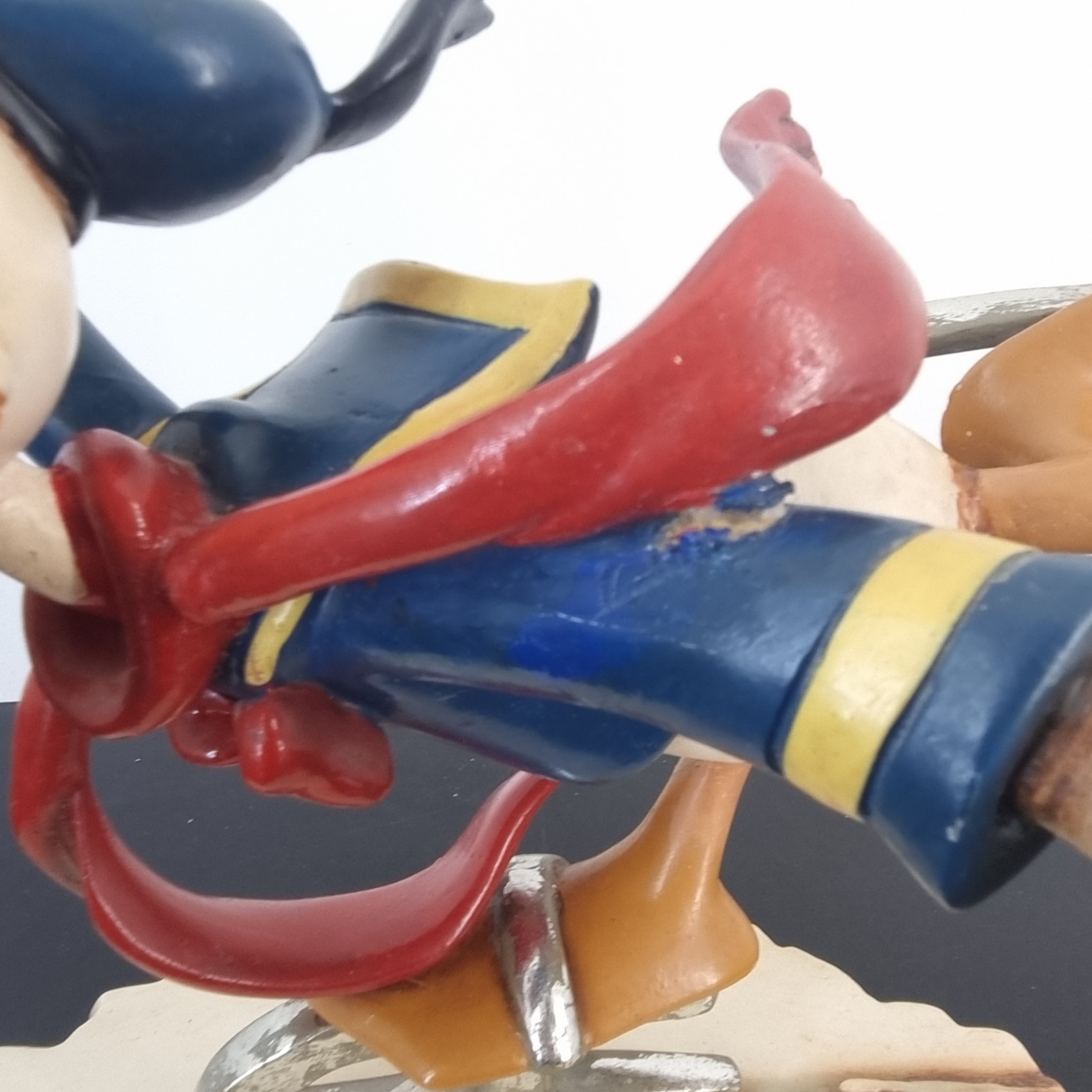 This unique statue from Donald Duck was sculpted by Stefan Toth under Walt Disney’s license. Dates back to the 1980s. Made from durable polyester, it remains in very good condition. Add a vintage charm to your collection with this delightful statue of Donald Duck ice skating, beaming with a big smile and one leg playfully lifted in the air. This nostalgic piece captures the joyful spirit of Disney and is a must-have for any fan. Don’t miss your chance to own this whimsical collectible!