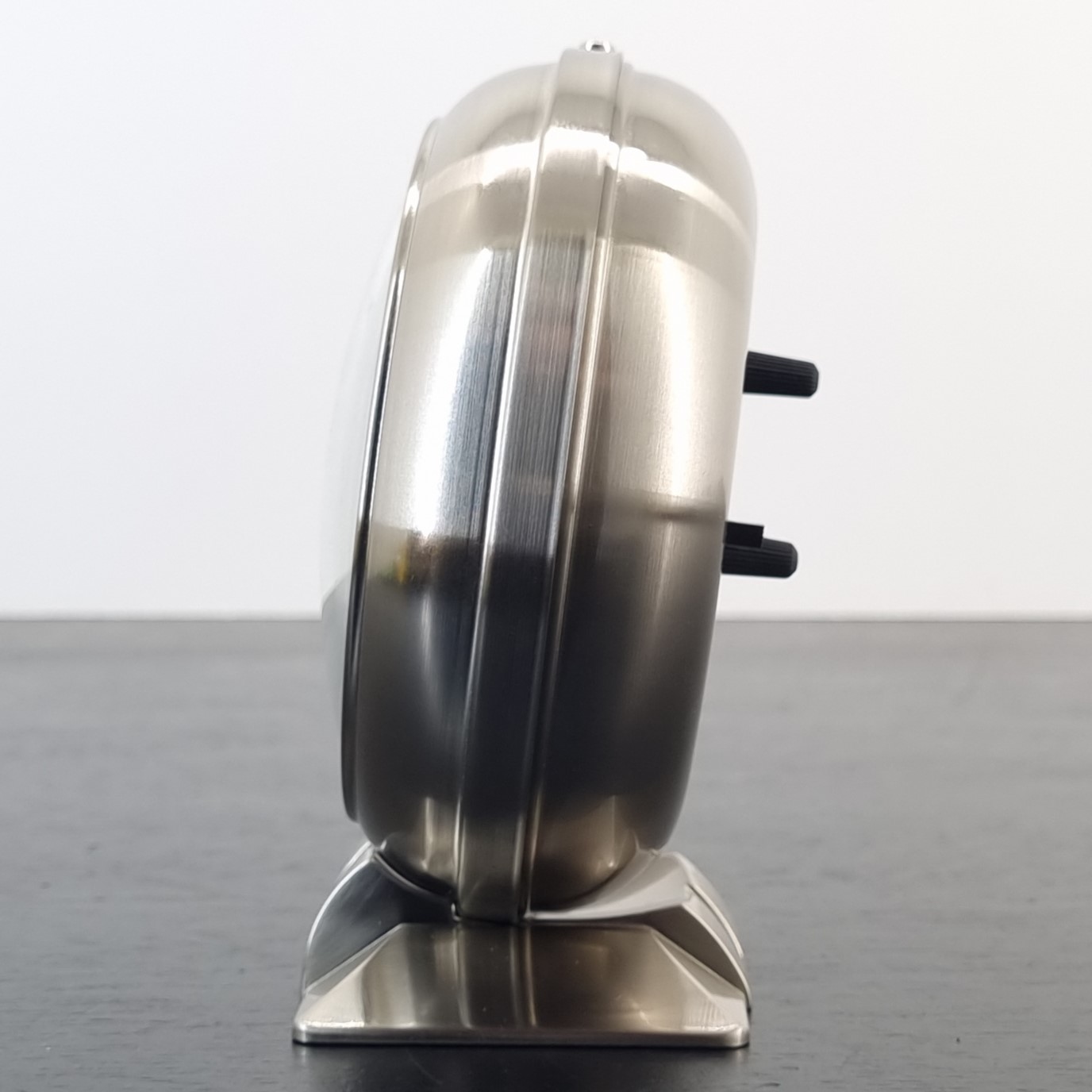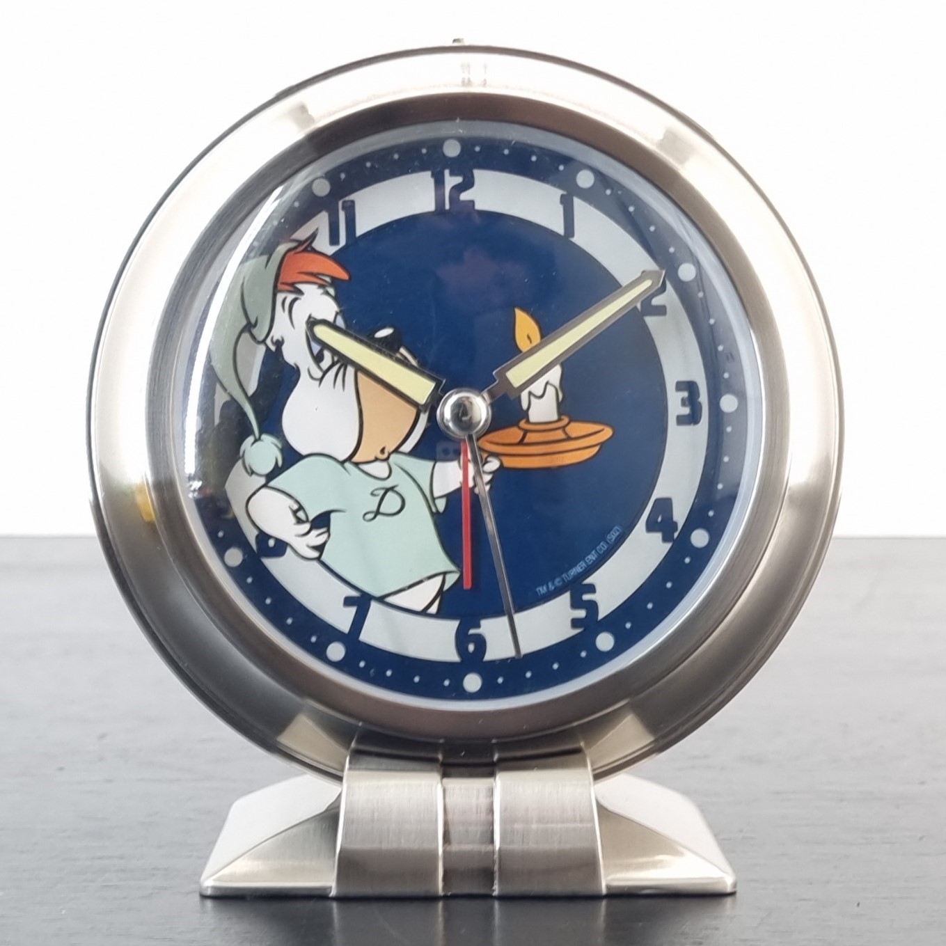 A vintage alarm clock featuring Droopy, crafted by Demons and Merveilles under Turner Entertainment’s license. Dates back to the 1990s. Made from durable metal, it remains in excellent condition. Droopy standing in classic pajamas, holding a traditional candle stand. His sleepy, droopy eyes and somber expression made it look like he was reluctantly preparing for bed, adding a touch of humor to the morning wake-up routine.