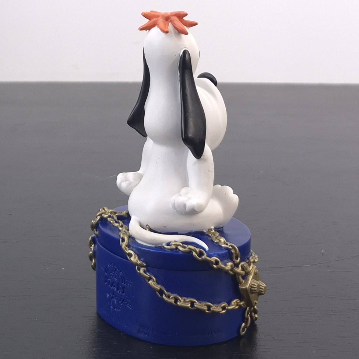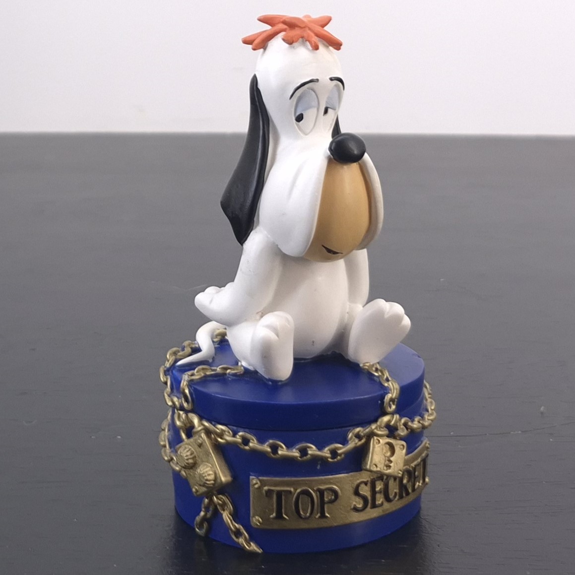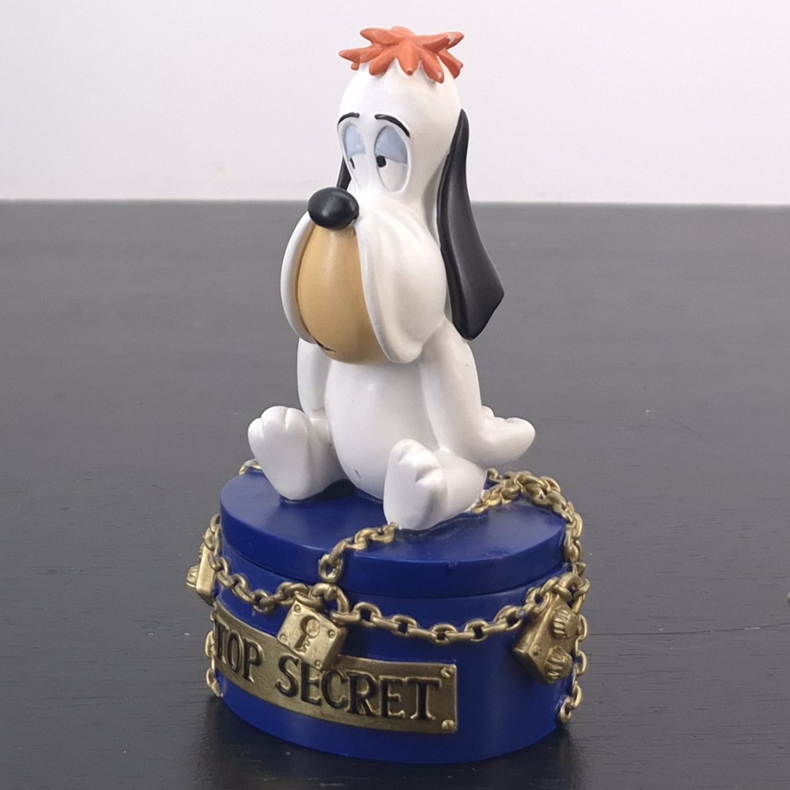 Vintage trinket box of the Droopy, crafted by Tropico Diffusion under Turner Entertainment’s license. Part of Tropico Diffusion’s Avenue of the Stars collection. Dates back to 2002. Crafted from durable resin, it remains in very condition. Keep your treasures safe with this delightful Droopy “Top Secret” trinket box. Featuring the ever-sad yet lovable Droopy sitting atop a blue chest wrapped in golden chains, this piece combines humor with functionality. The lid lifts off to reveal a hidden compartment, perfect for storing small keepsakes or collectibles. The sculpt captures Droopy’s classic droopy-eyed expression, adding nostalgic charm to the design. With its playful mix of secrecy and cartoon whimsy, it’s both a display piece and a practical storage solution.
