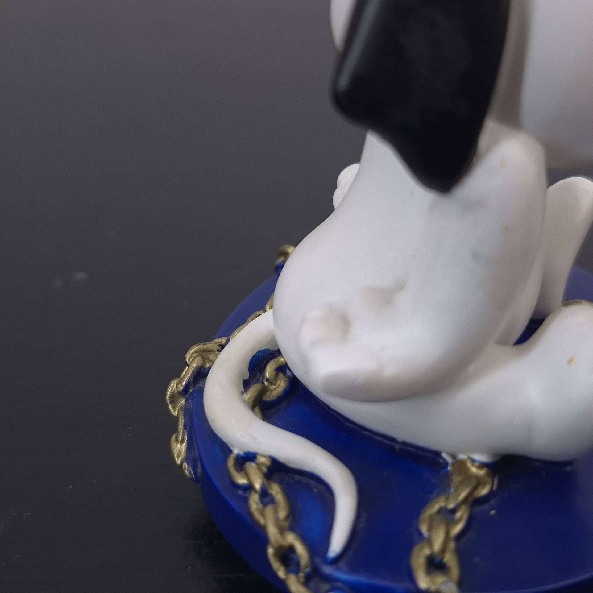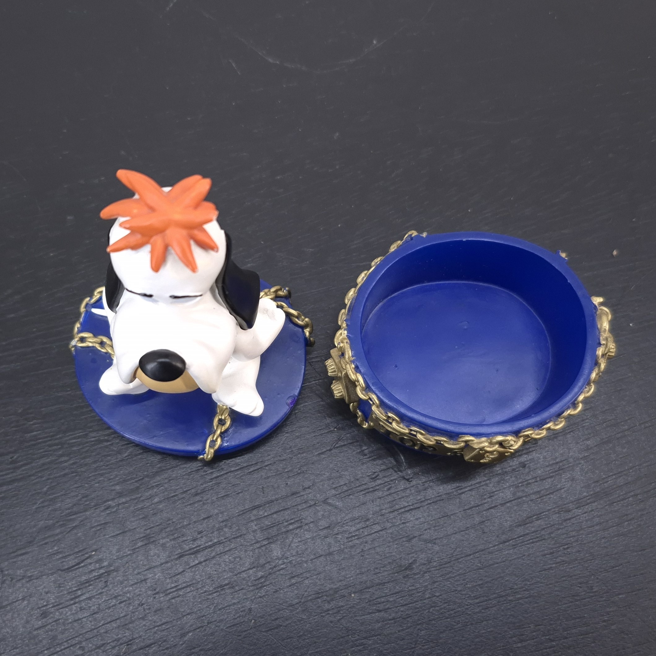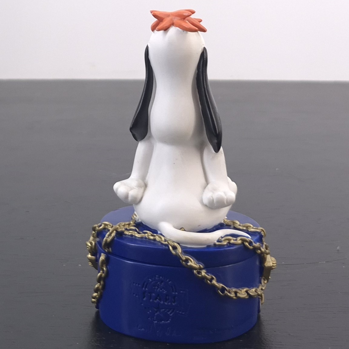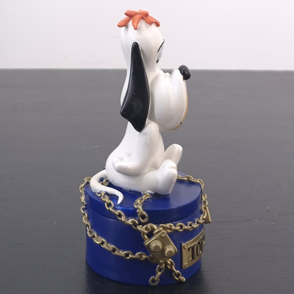 Vintage trinket box of the Droopy, crafted by Tropico Diffusion under Turner Entertainment’s license. Part of Tropico Diffusion’s Avenue of the Stars collection. Dates back to 2002. Crafted from durable resin, it remains in very condition. Keep your treasures safe with this delightful Droopy “Top Secret” trinket box. Featuring the ever-sad yet lovable Droopy sitting atop a blue chest wrapped in golden chains, this piece combines humor with functionality. The lid lifts off to reveal a hidden compartment, perfect for storing small keepsakes or collectibles. The sculpt captures Droopy’s classic droopy-eyed expression, adding nostalgic charm to the design. With its playful mix of secrecy and cartoon whimsy, it’s both a display piece and a practical storage solution.