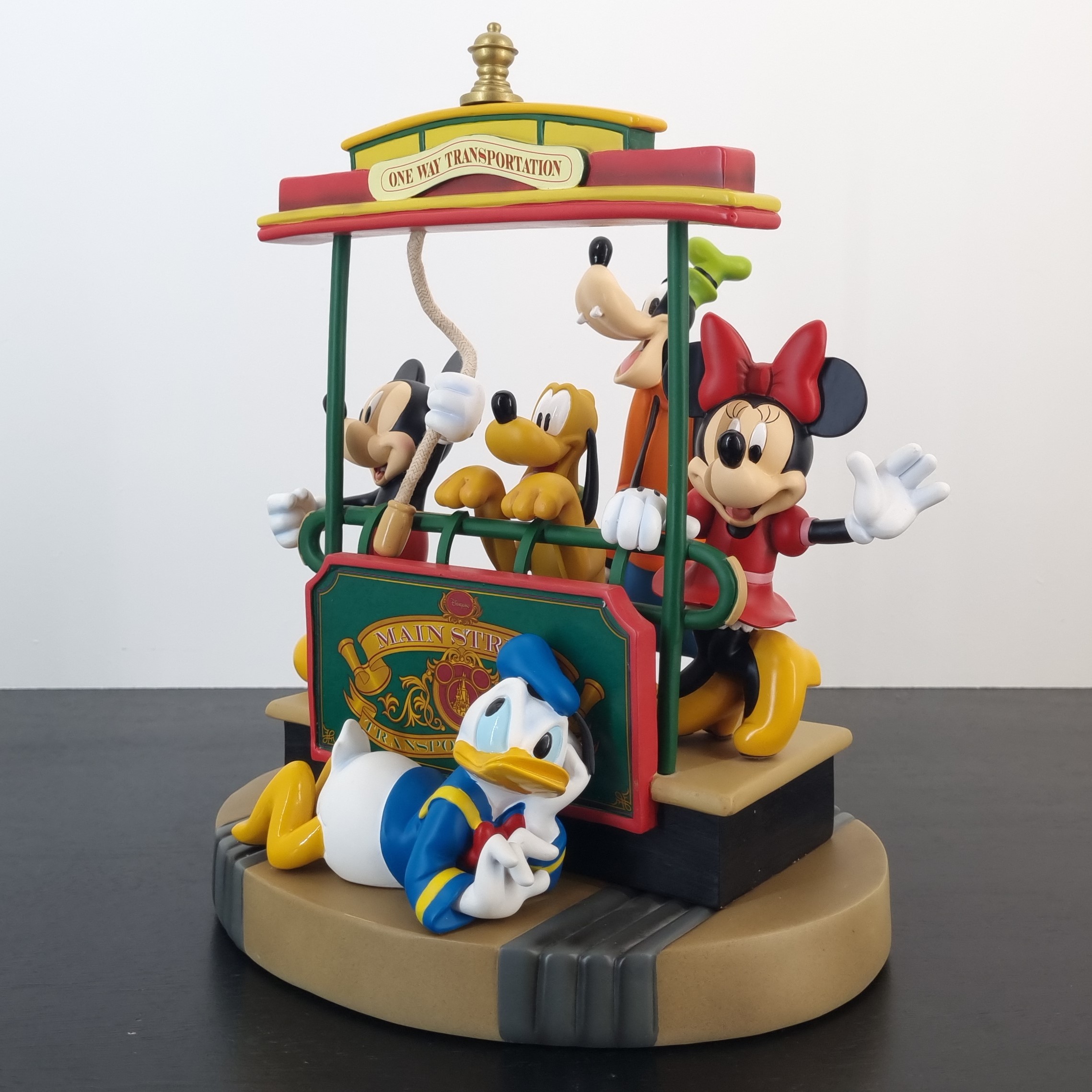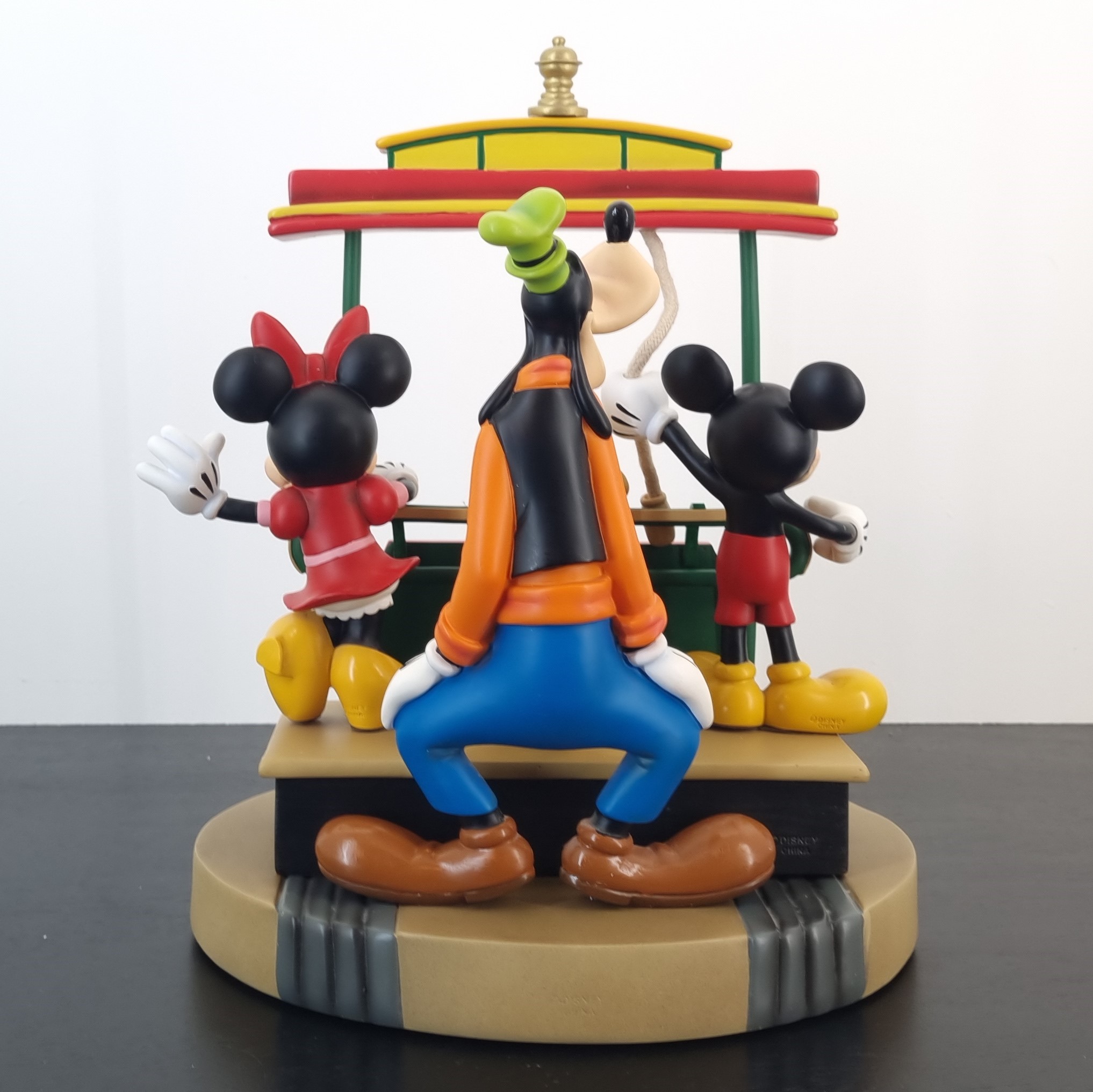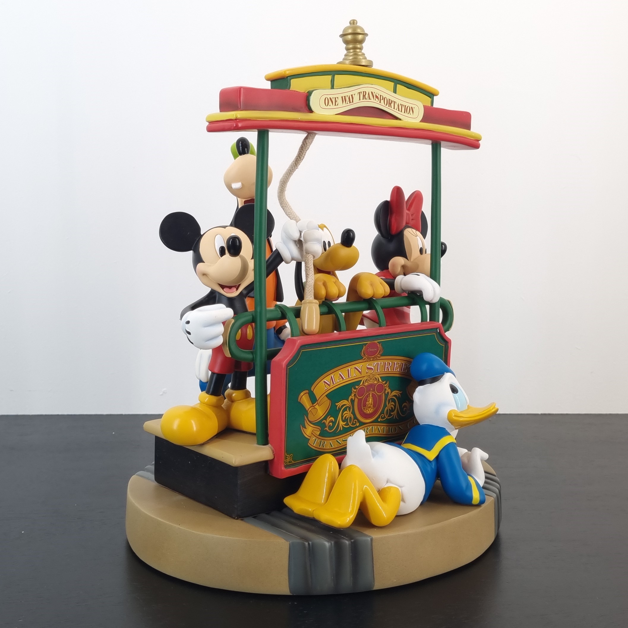 Relive the magic of a classic Disney era with this rare vintage statue of Mickey Mouse, Minnie Mouse, Donald Duck, Goofy, and Minnie on the tram at Main Street. Made with exquisite attention to detail, this charming piece is a must-have for any Disney collector or fan. Let this statue transport you back to a time of wonder and enchantment, and add a touch of nostalgia to your home or office. Order now and bring the joy of these iconic characters into your life.