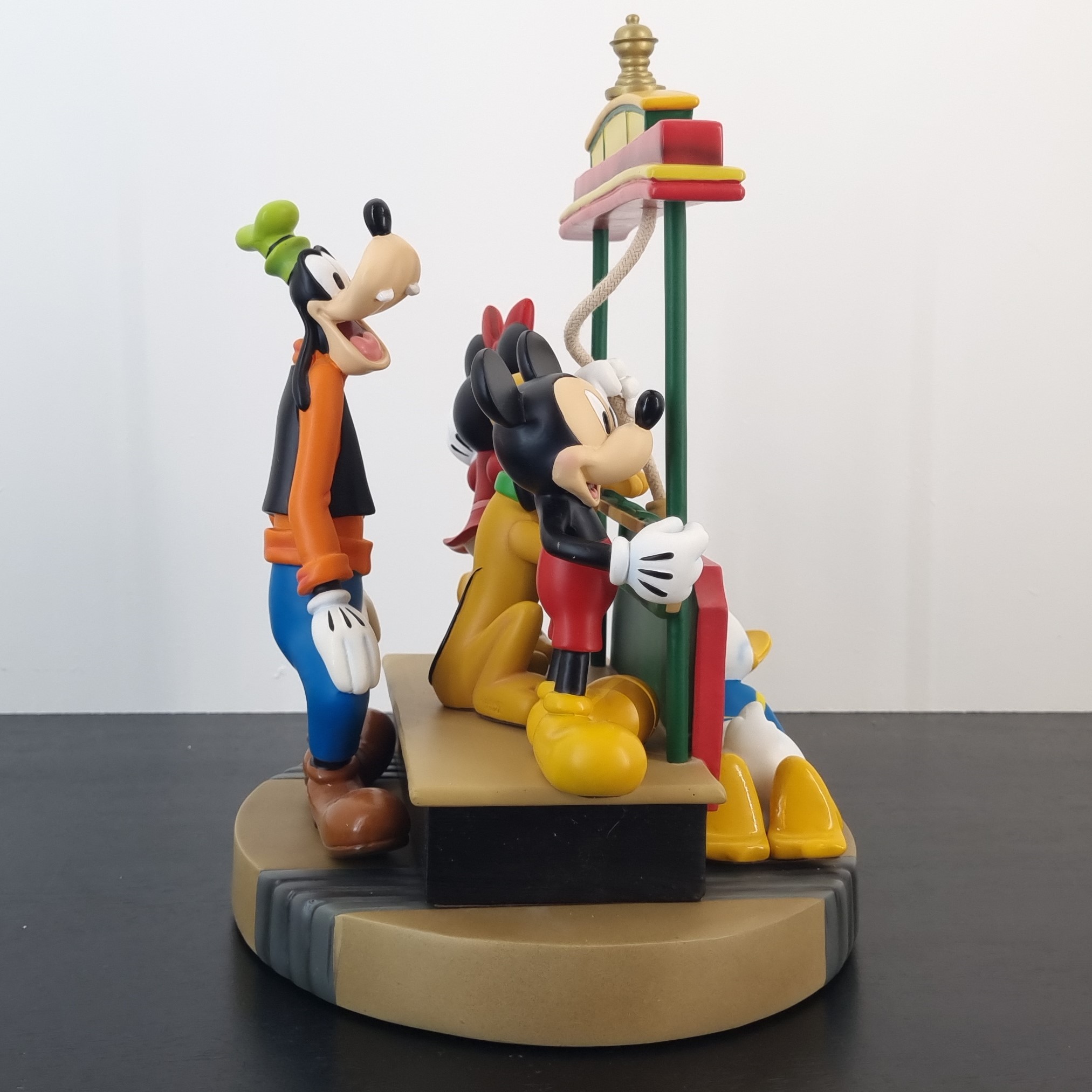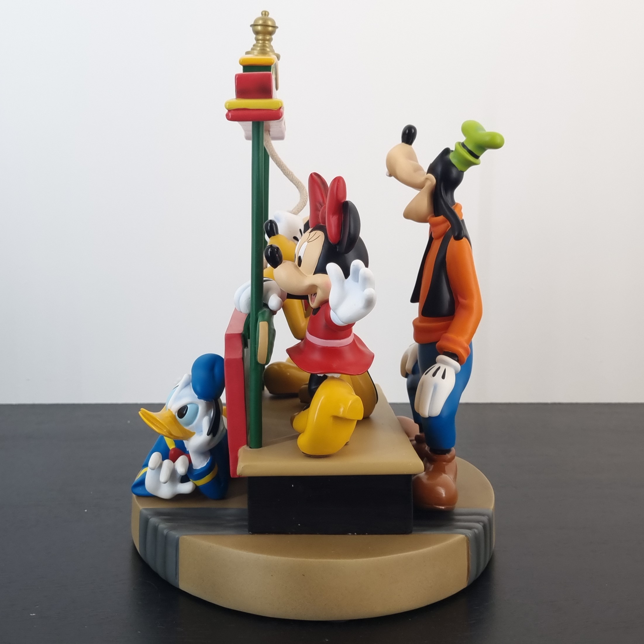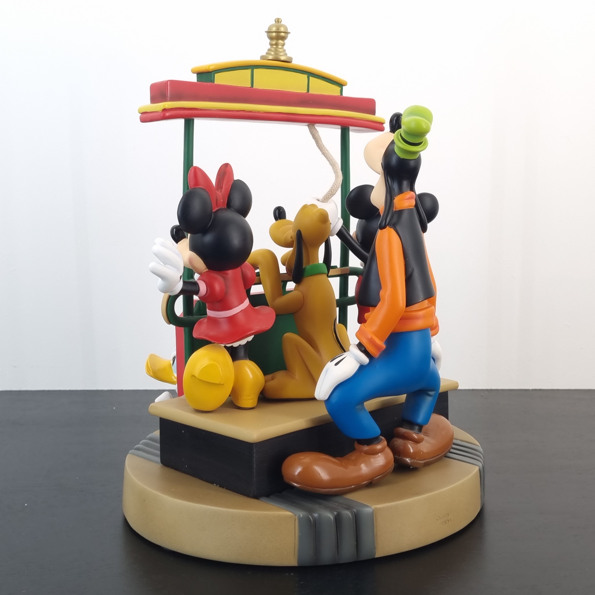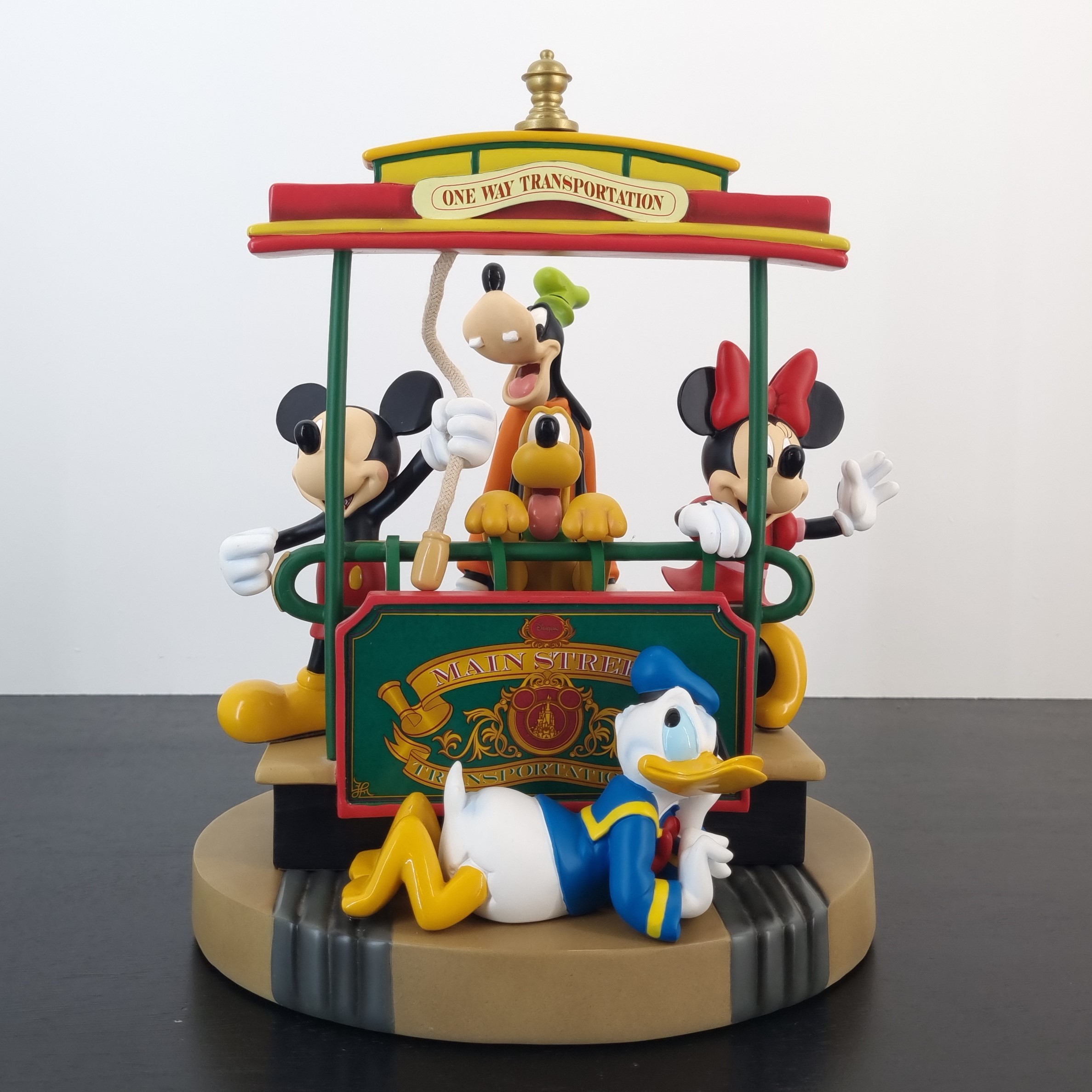 Relive the magic of a classic Disney era with this rare vintage statue of Mickey Mouse, Minnie Mouse, Donald Duck, Goofy, and Minnie on the tram at Main Street. Made with exquisite attention to detail, this charming piece is a must-have for any Disney collector or fan. Let this statue transport you back to a time of wonder and enchantment, and add a touch of nostalgia to your home or office. Order now and bring the joy of these iconic characters into your life.