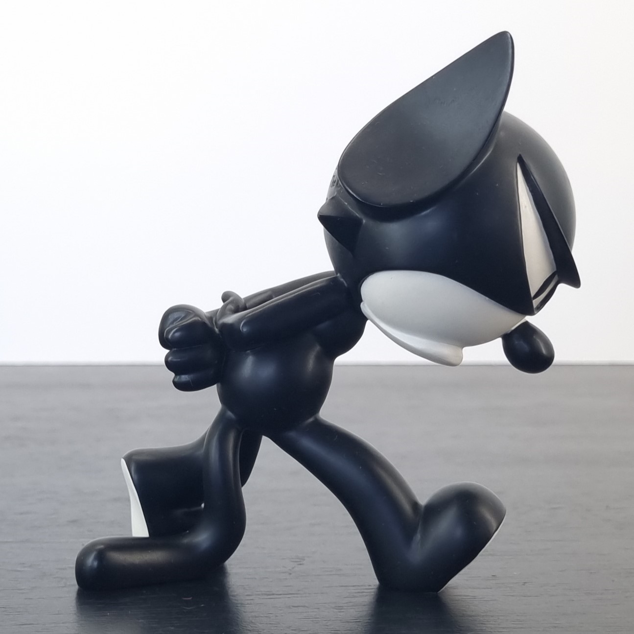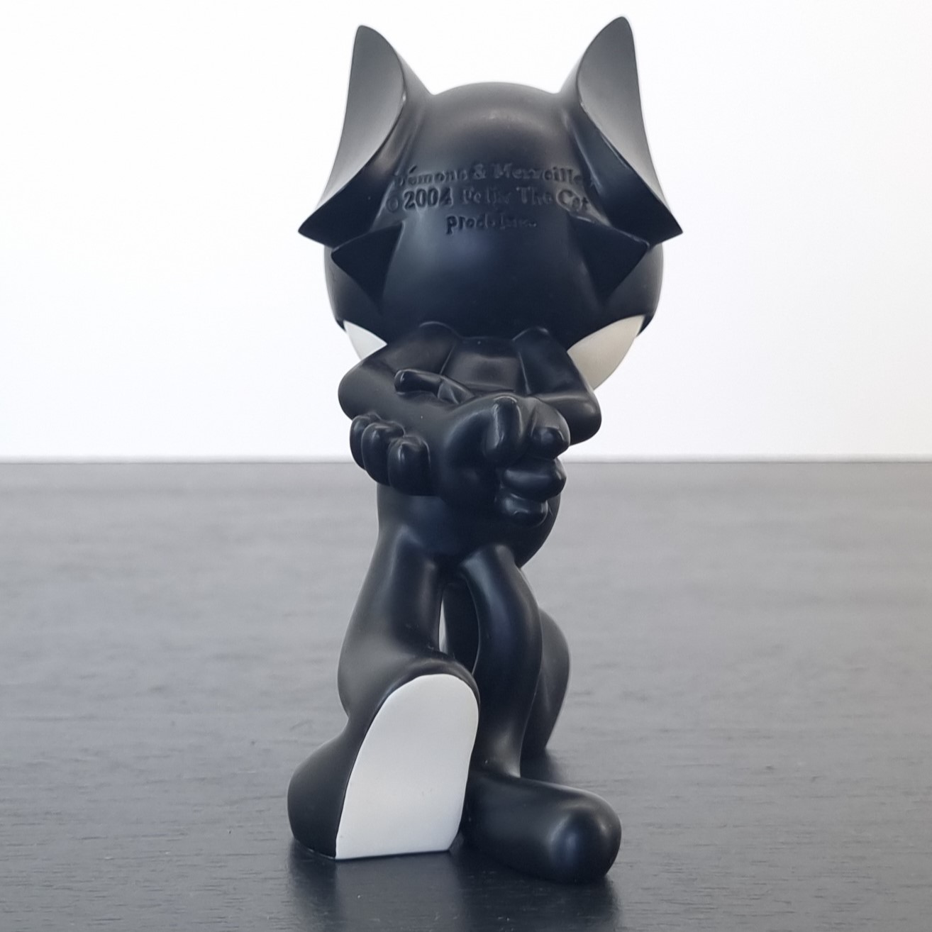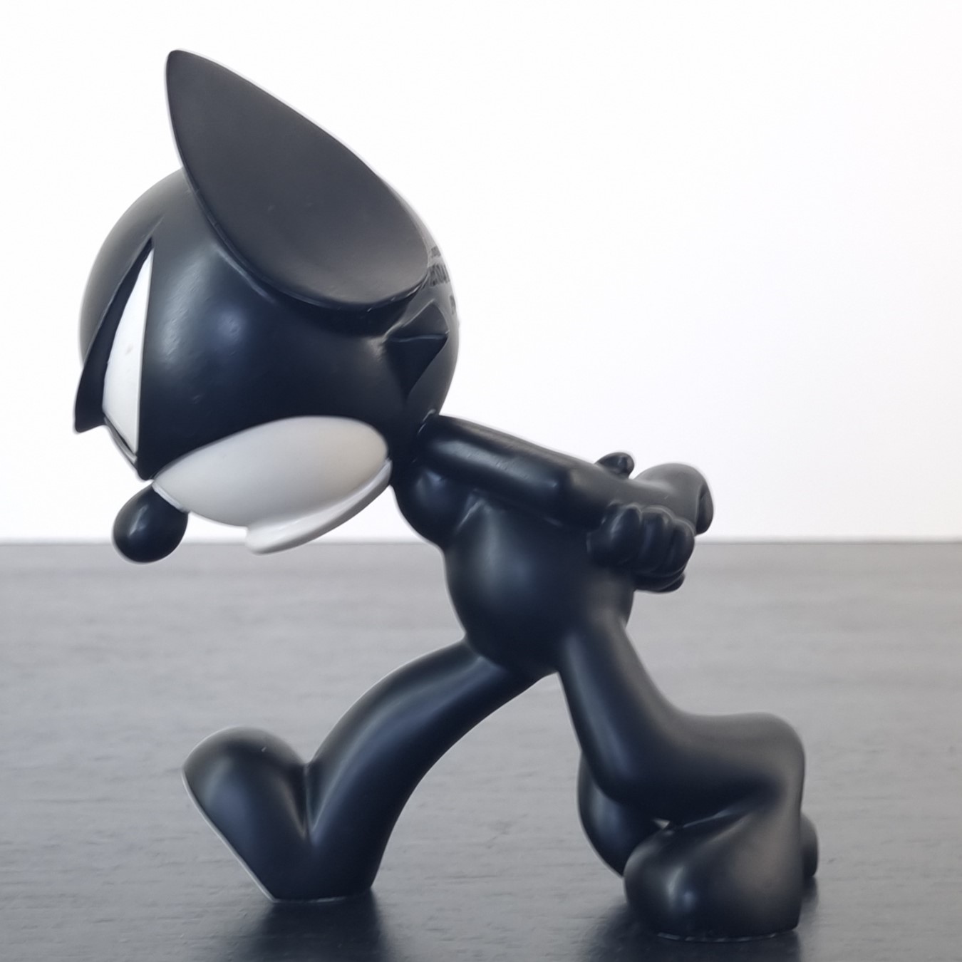 Vintage statue of Felix the Cat, crafted by Demon and Merveilles under Felix the Cat Productions’ license. Dates back to 2004. Crafted from durable resin, it remains in excellent condition. Meet Elix: the feline philosopher with a gaze that pierces through your soul. He paces with purpose, tail twitching as if counting the questions of the universe. Not just a cat—he’s an experience, a moody masterpiece wrapped in sleek fur. Adopt Elix, and you’re not just gaining a companion, you’re welcoming mystery and charisma into your home. Brooding never looked so regal.