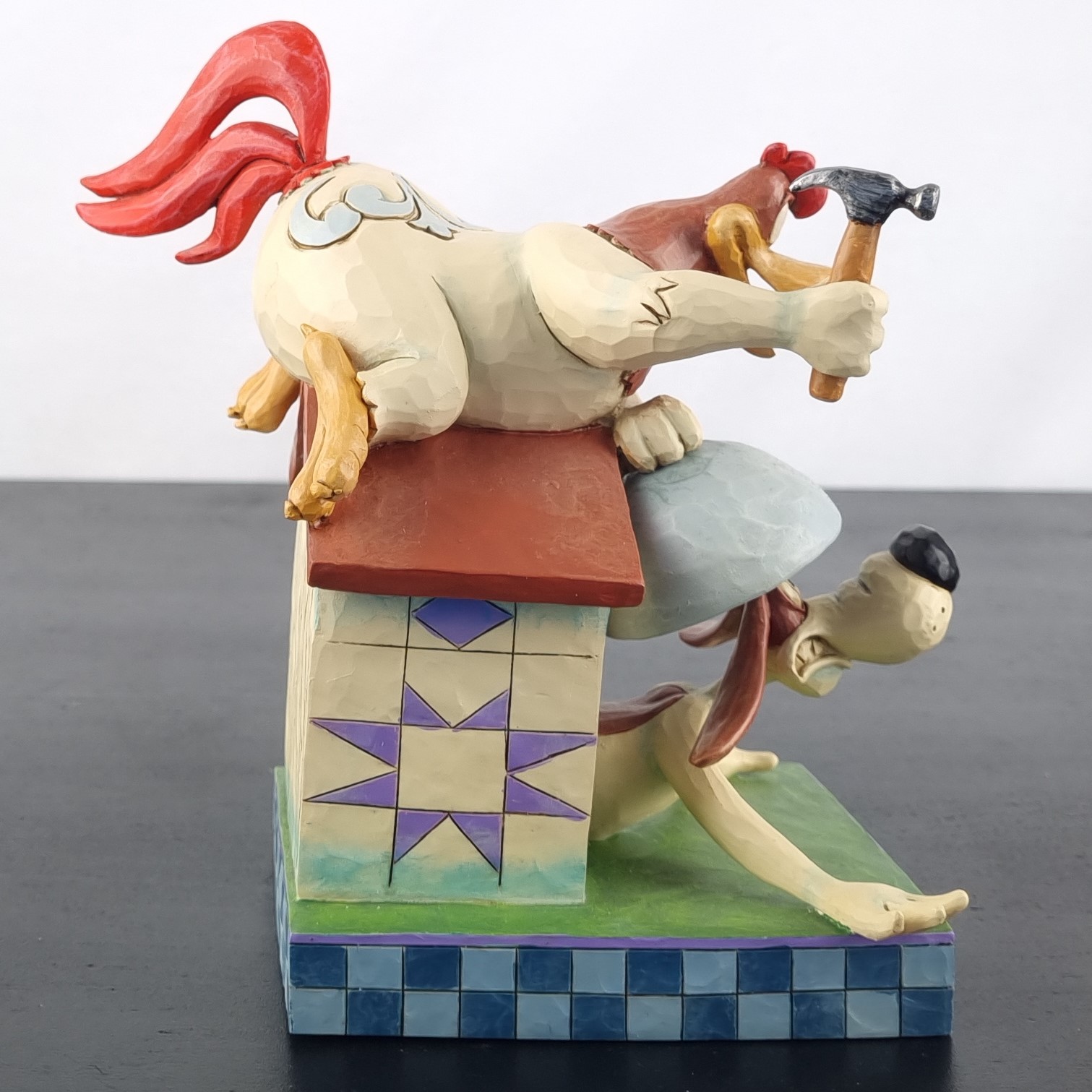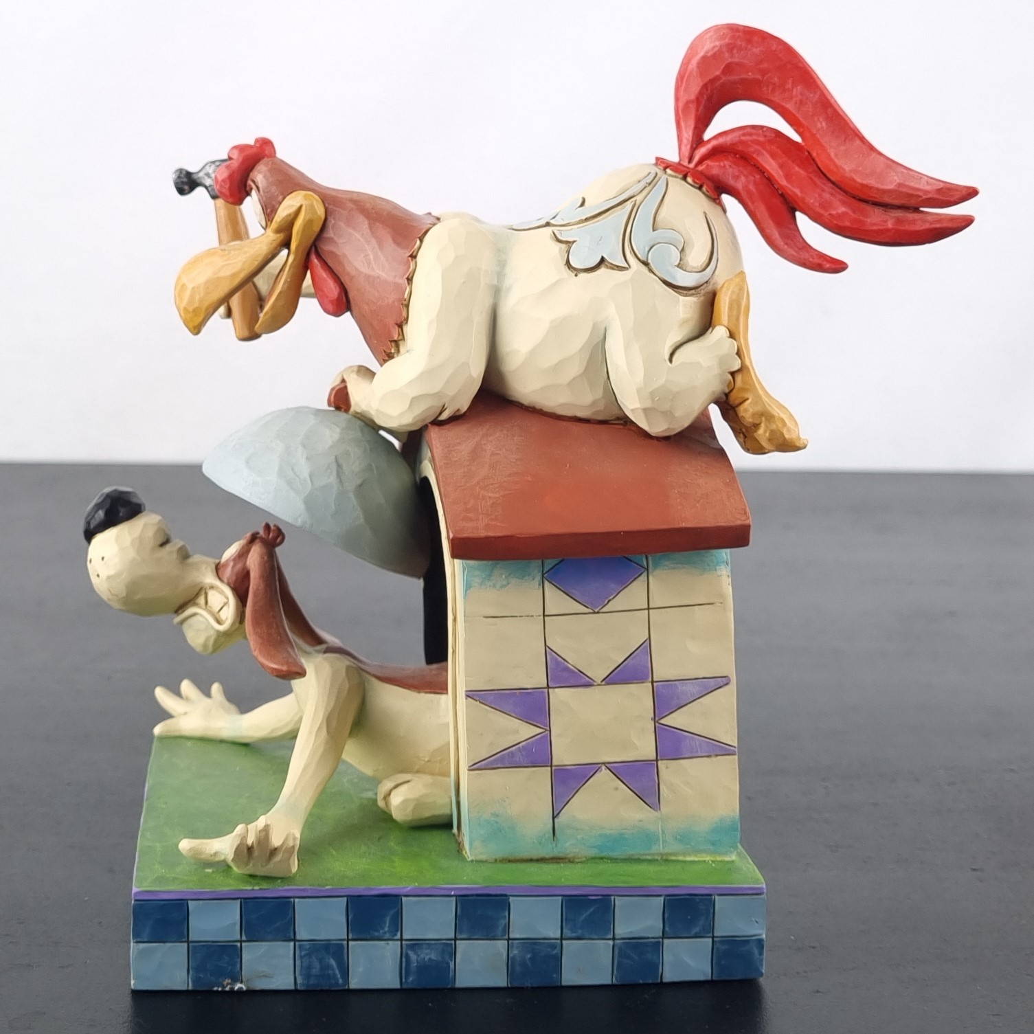 This unique figurine from Foghorn Leghorn and Barnyard Dawg was sculpted by Jim Shore under Warner Bros.’ license. It was taken in production by Enesco for their Looney Tunes Traditions collection. Dates back to 2016. Crafted from durable stone resin, it remains in excellent condition. Wake up to some classic cartoon fun with this hilarious figurine featuring Foghorn Leghorn waking up Barnyard Dawg! Foghorn sits above the dog house, having just banged a big pan lid with a hammer, startling Barnyard Dawg awake. Perfect for fans of Looney Tunes, this piece captures the playful antics and timeless humor of these beloved characters.