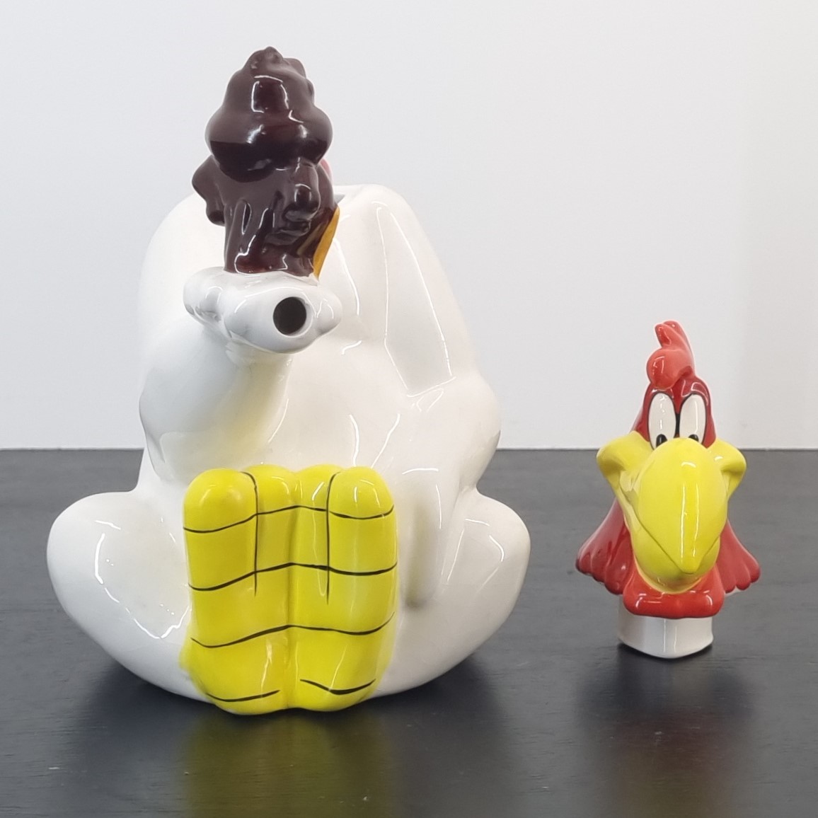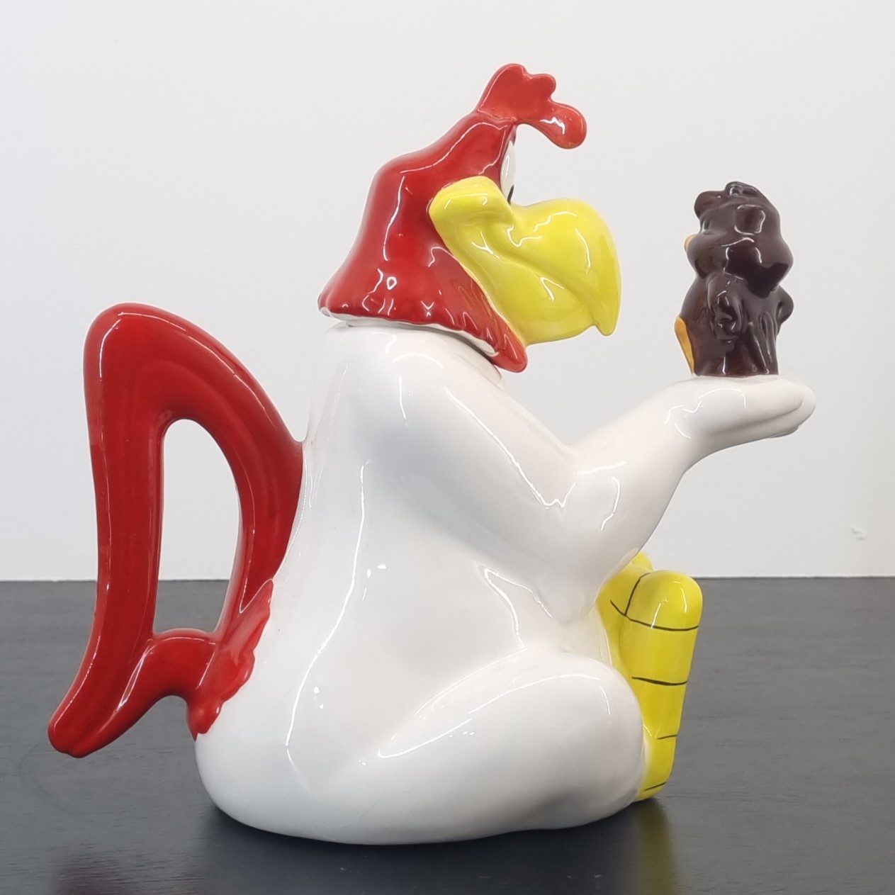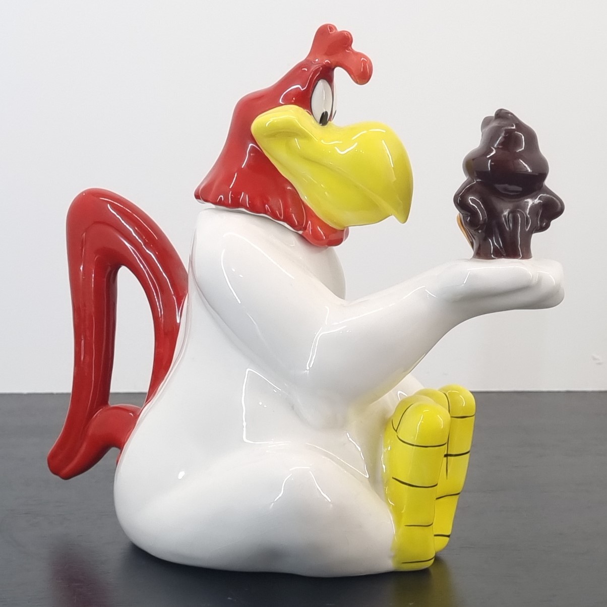 Amazing teapot of Foghorn Leghorn. This Looney Tunes collectible shows Foghorn Leghorn holding Henery Hawk in his hand.