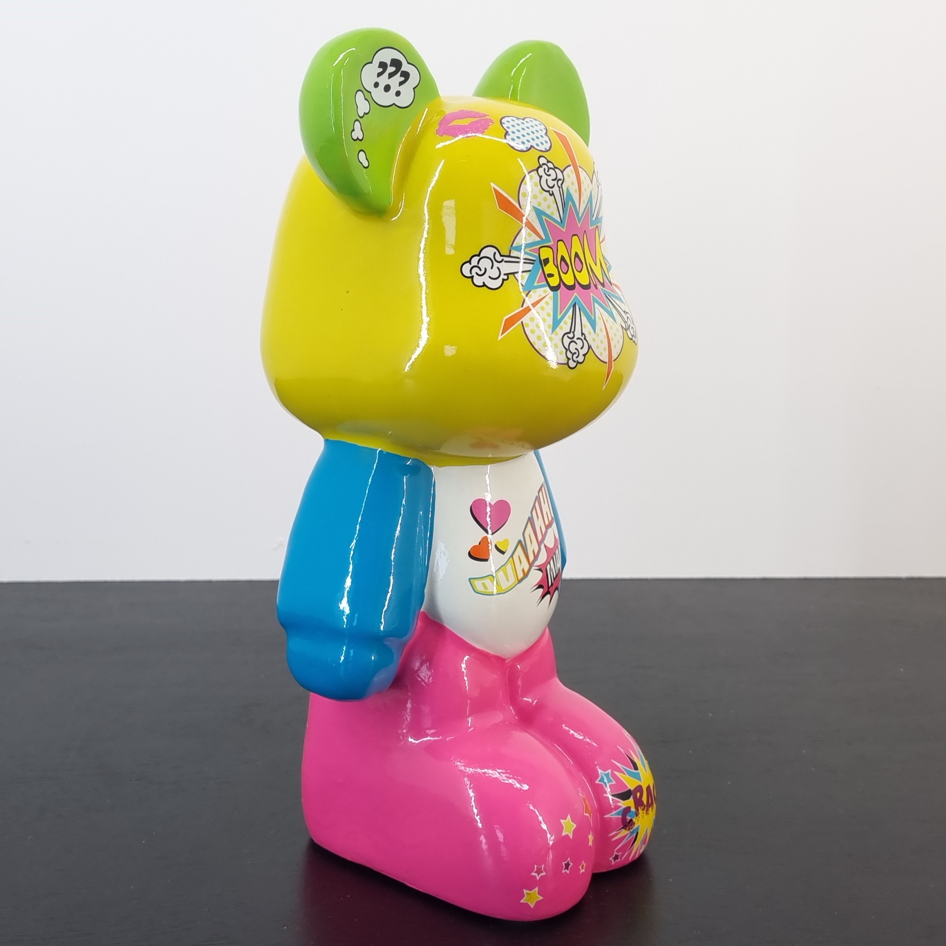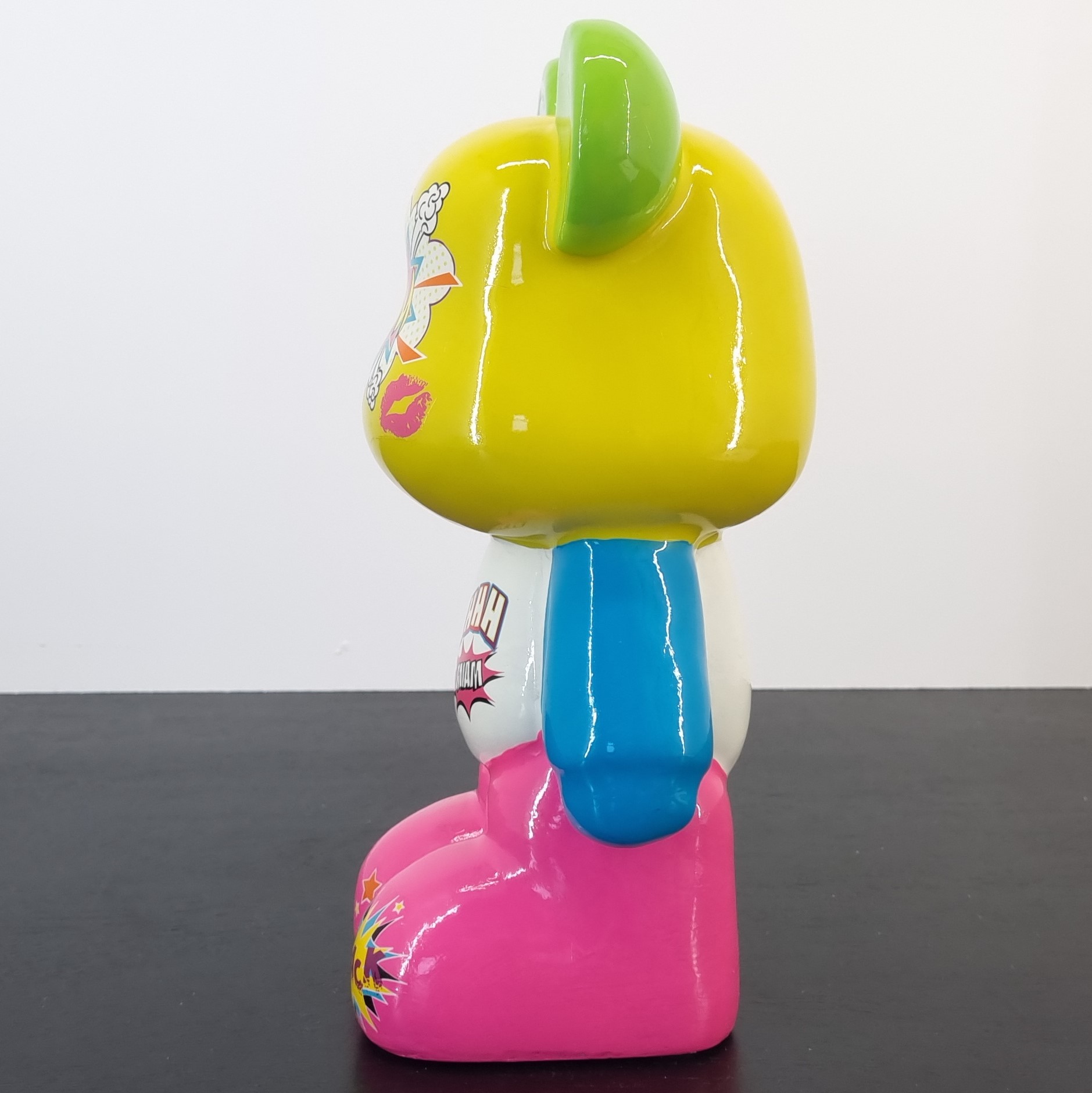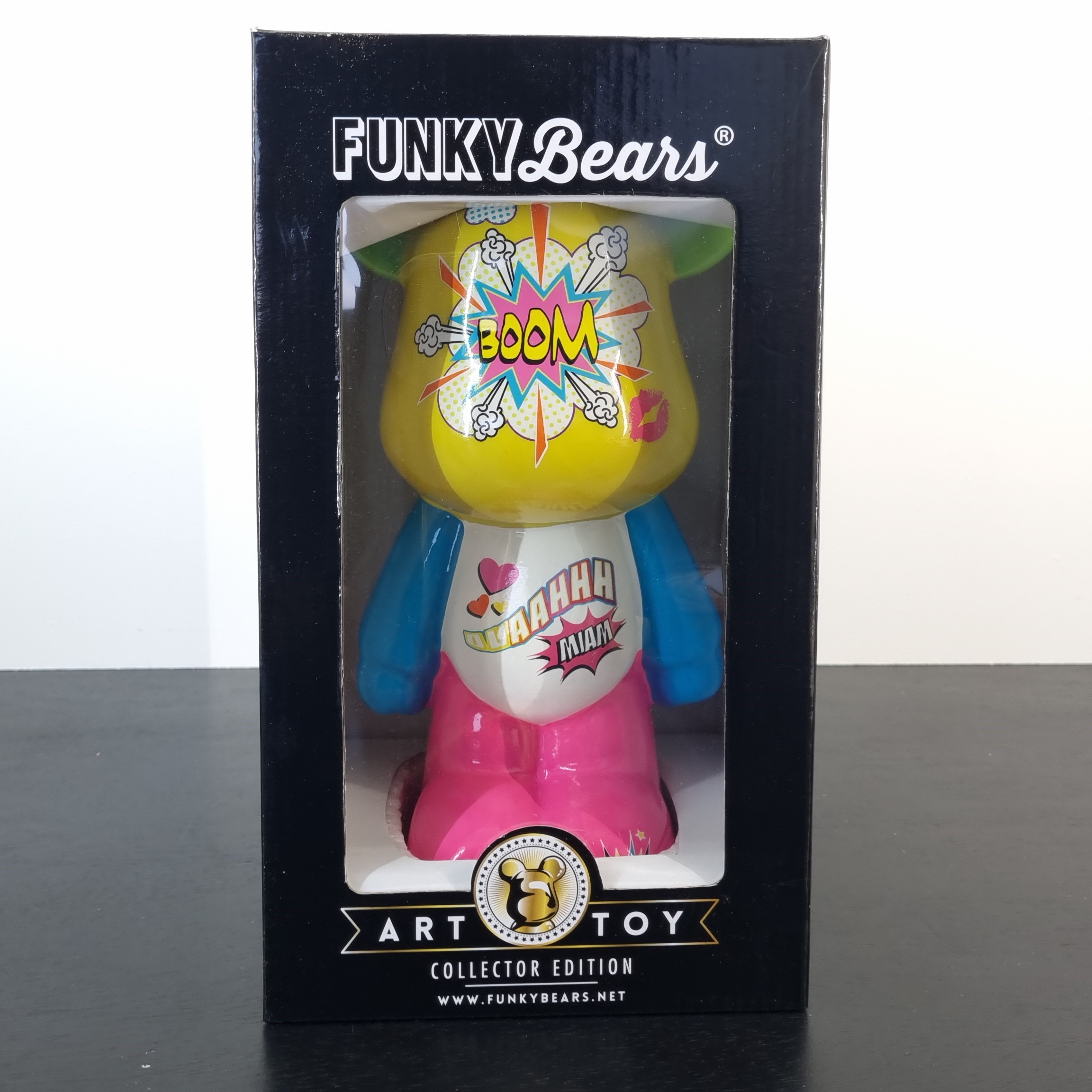 This unique statue from the Funky Bears® collection was crafted by Tropico Diffusion and is part of their Avenue of the Stars product line. Produced between 2014 and 2016. Crafted from durable polyresin, this vintage art toy remains in excellent condition. This is a limited edition statue. This vibrant bear features a yellow face, green ears, blue arms, a white belly, and pink legs and feet. With a comic-style “BOOM” explosion on its face and the text “Yeah,” this Funky Bear is perfect for those who love dynamic and colorful designs. Add a burst of fun and excitement to your collection with this lively and energetic piece!