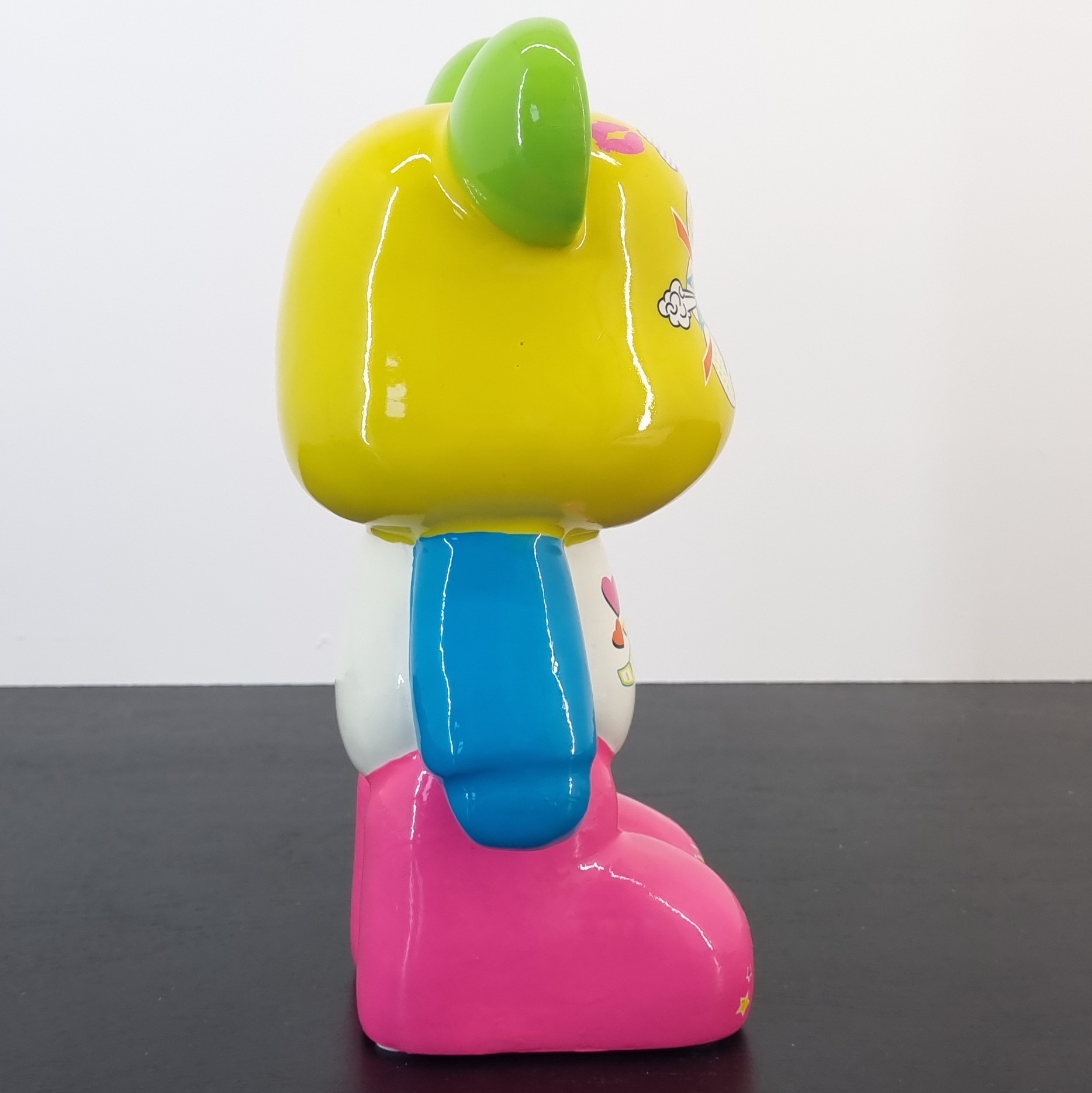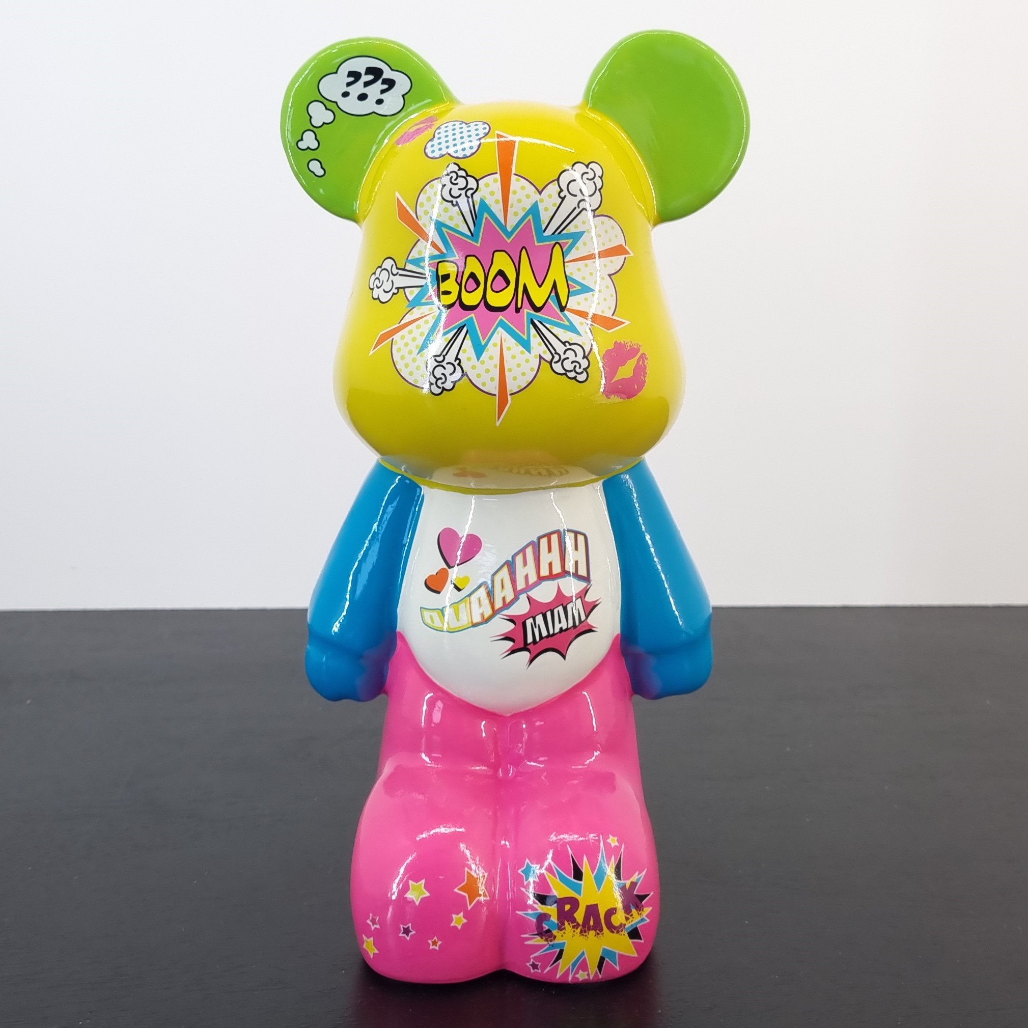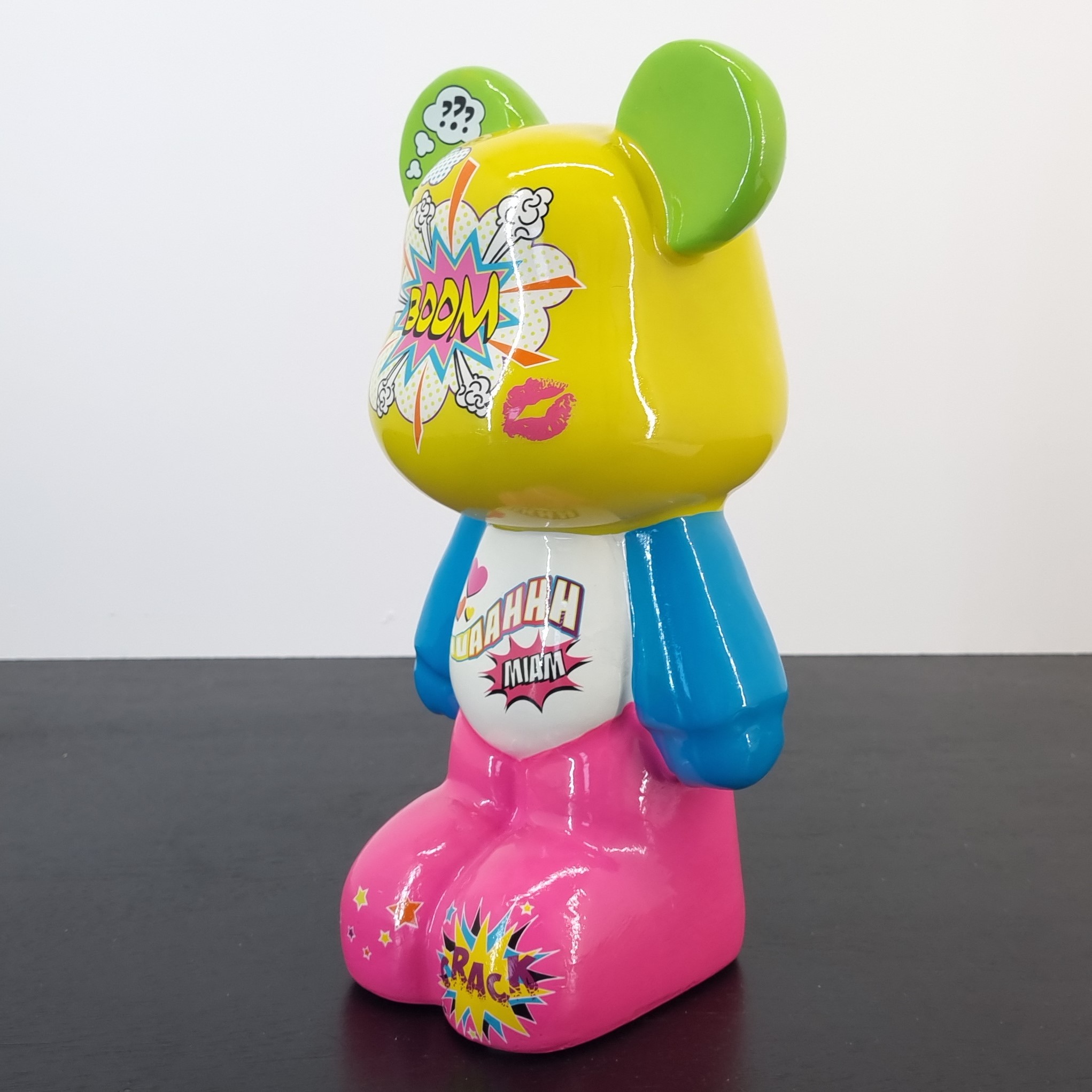 This unique statue from the Funky Bears® collection was crafted by Tropico Diffusion and is part of their Avenue of the Stars product line. Produced between 2014 and 2016. Crafted from durable polyresin, this vintage art toy remains in excellent condition. This is a limited edition statue. This vibrant bear features a yellow face, green ears, blue arms, a white belly, and pink legs and feet. With a comic-style “BOOM” explosion on its face and the text “Yeah,” this Funky Bear is perfect for those who love dynamic and colorful designs. Add a burst of fun and excitement to your collection with this lively and energetic piece!