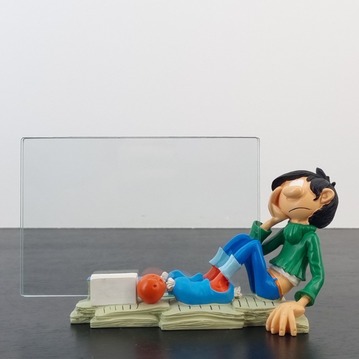 Vintage picture frame of Gaston Lagaffe, crafted by Tropico Diffusion under Mediatoon Licensing’s license. Part of Tropico Diffusion’s Avenue of the Stars collection. Dates back to 2002. Crafted from durable resin, it remains in very good condition. Capture the whimsical chaos of Gaston Lagaffe with this unique picture frame! Featuring Gaston sitting stunned amidst scattered papers and books, with the glass frame nestled between his legs, this piece is perfect for any comic fan. Add a touch of humor and charm to your space, celebrating the beloved character in a delightful, creative way!