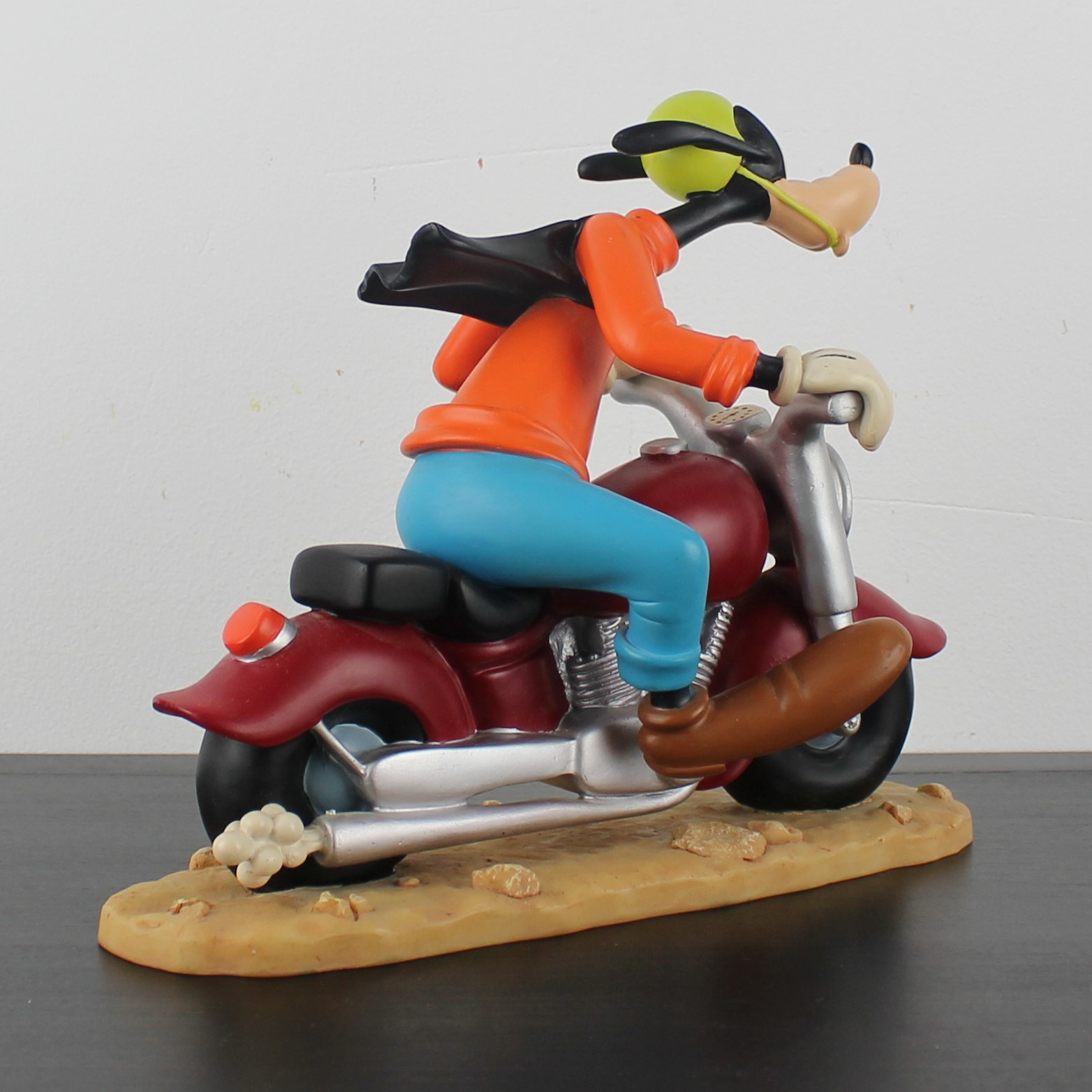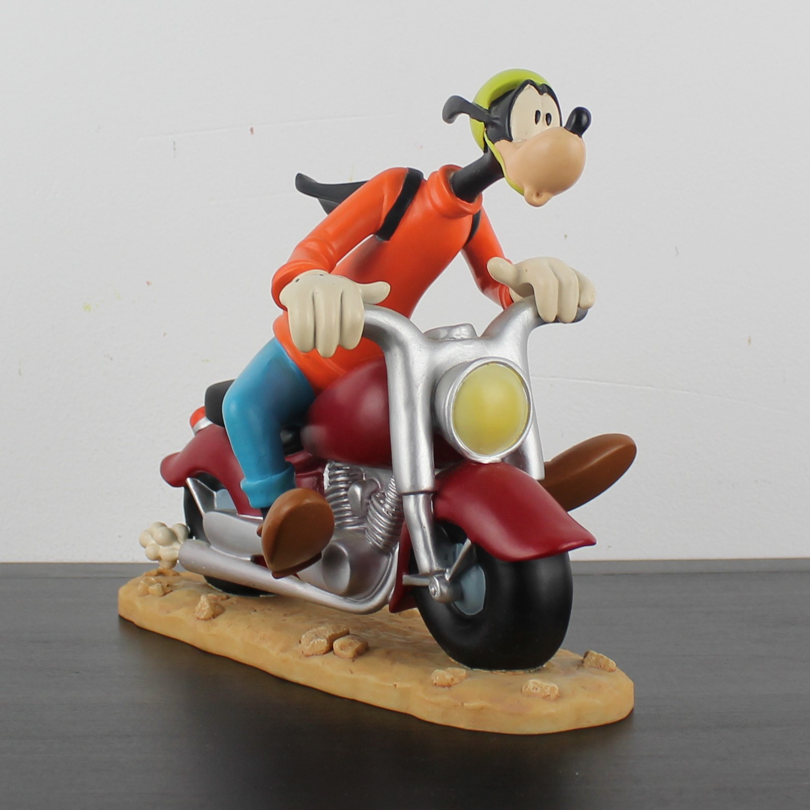 When looking at the face of Goofy, we have to wonder… What is happening with Goofy on his motor? You can see a questioning glance on his face. When we see how the wind blows trough his ears we can only assume he is driving fast. Is he loosing his balance? Goofy on a motorcycle, what could go wrong….